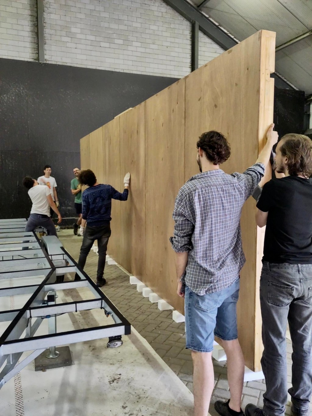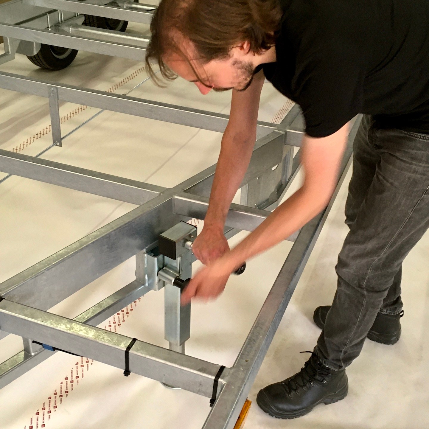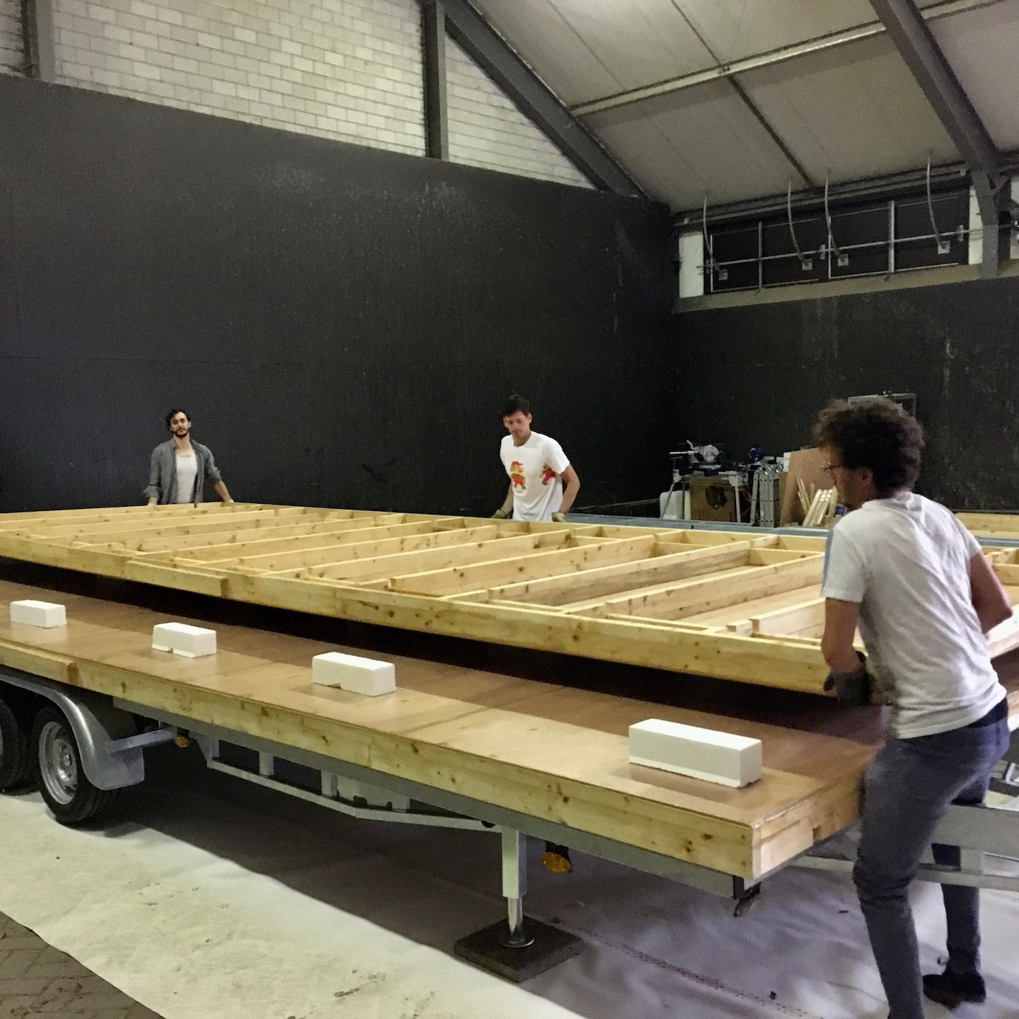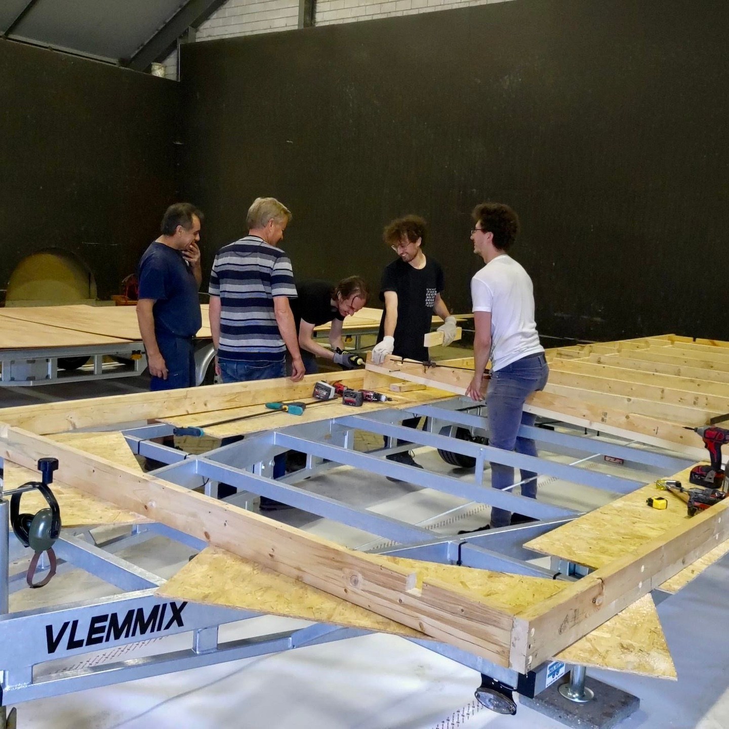 Op de laatste dag van juli kwamen tot slot alle hulptroepen ingevlogen om alles rondom het keren en positioneren van de vloeren te regelen (en je kunt nooit genoeg supervisors hebben natuurlijk als je deze groep mensen bij elkaar hebt(a)). Nu de onderplaten op het frame waren gemonteerd en afgewerkt, waren de vloeren natuurlijk behoorlijk zwaar en dat terwijl het positioneren ook nog eens secuurder moest gebeuren dan hiervoor (je ziet hier ook goed de rubberband/tape die tussen de trailer en het vloerframe in ligt als extra vereffening en bescherming (we werkten overigens in teams en hadden aangegeven dat de winnaars meer BBQ zouden krijgen, dus dat ging zo snel dat Hermes haast jaloers zou zijn geworden, haha)). Nadat alle rubberband/tape was geplaatst (ook op de slotboutplaatjes), was het nog een laatste keer vloertje keren met zijn allen, zodat de slotboutconstructies konden worden geplaatst. Zoals je ziet moest er hier en daar wat extra geboord worden om de getordeerde balken te compenseren, gelukkig is dat overal wel gelukt (de volgende keer wellicht iets bredere stropplaatjes ontwerpen en maken zodat we wat meer marge hebben, haha, eind goed al goed gelukkig deze keer:)).