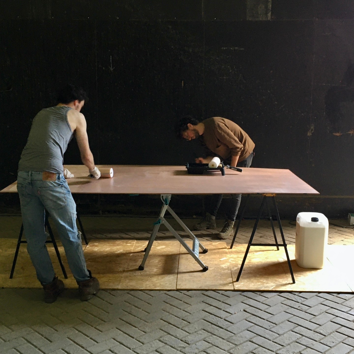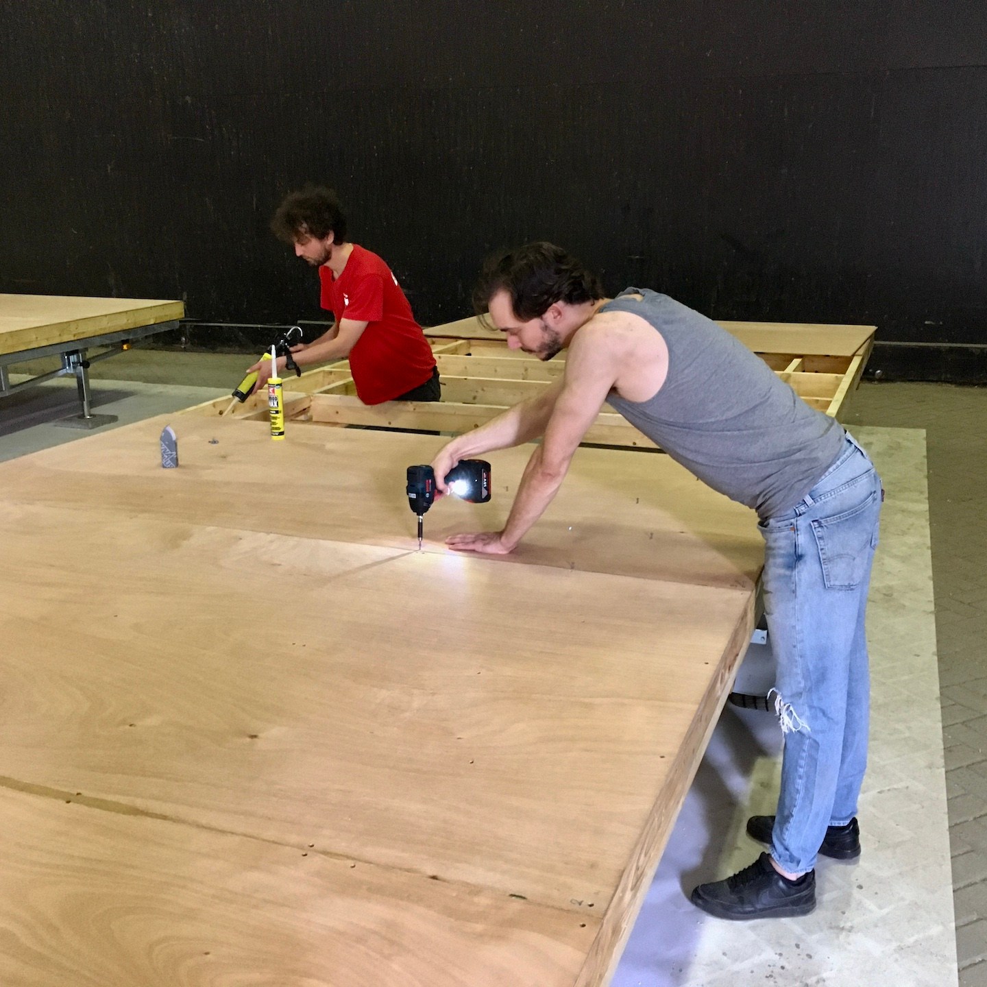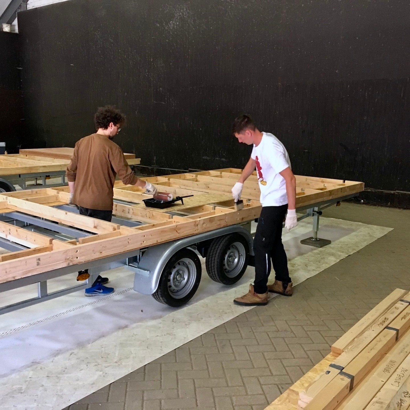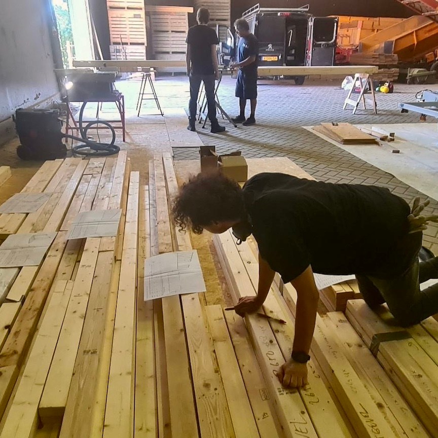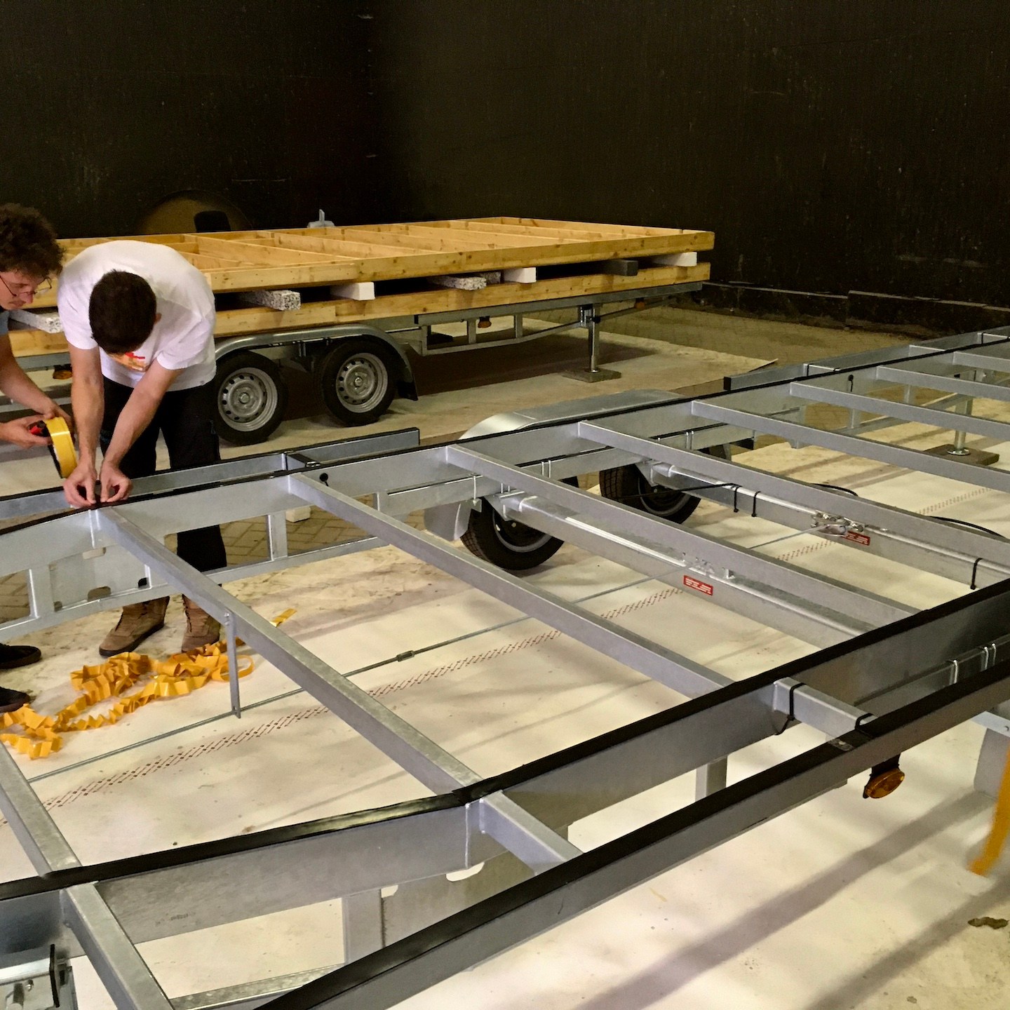 En terwijl Pat en ik vooral verder gingen met het ordenen, uitzoeken, (her)ontwerpen en bestellen van alles wat je je maar kunt bedenken en het “ontruwen” (ja, dit zijn gewoon woorden, haha) van de ruwbouw, spreidde in de tussentijd deze estafette van compassie zich uit naar de TU Delft, waar Ray de onderdelen die nog uit Moeder Gaia ontborgen lijken te moeten worden, zoals onze theoretisch uitgedachte slotbout-bevestigingsconstructie (van het houten frame aan de trailer), met behulp van de lasersnijder daar in de praktijk moest weten te brengen. Als dank voor zijn inzet, mocht hij gelijk meekomen naar Zeeland om ons te helpen met het keren van de vloerframes (hihi, mucho gracias en you’re welcome Ray(a)), waarna Bou ons in de dagen daarna weer spontaan vergezelde voor het voorboren, verzinken en monteren (ja inderdaad, dat zijn honderden gaatjes, haha(a)) van de onderplaten aan de vloerframes, die Pat en ik tot slot konden voorzien van een dubbele laag randseal om deze waterdicht te maken. We willen natuurlijk geen vocht in de vloer krijgen (al weet ik niet of een beetje randseal helpt tegen de alarmerende klimaatveranderingen die gaande zijn…).