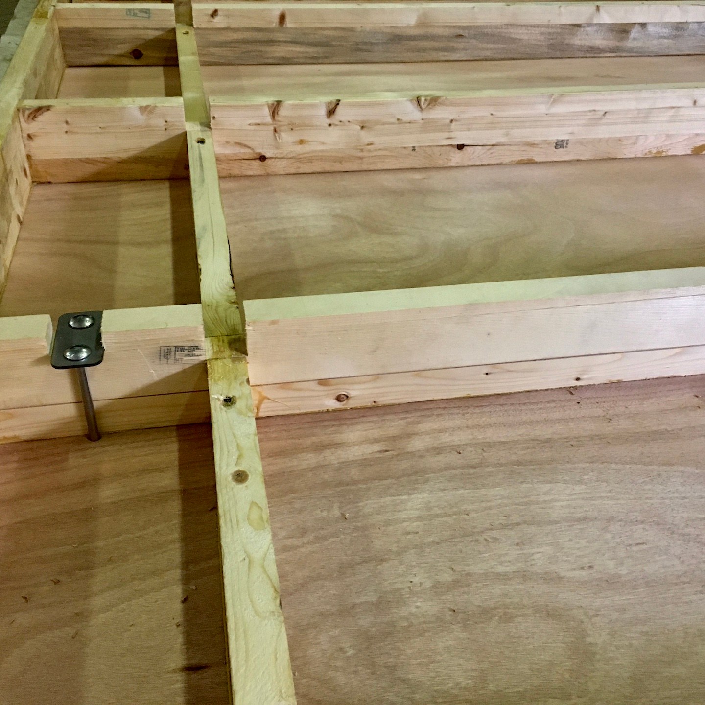 En nu ik het toch over lasten wegnemen heb. In de tweede week van juli deed Marcelo precies dat door het overgrote deel (zoals je later zult zien, zijn we continu in het proces aan het herontwerpen, dus verandert er hier en daar nog wel eens wat) van onze balken af te leveren en zelfs die dag te blijven om samen met het gehele gezin te helpen met het monteren van het eerste vloerframe:). Met die blauwdruk konden Pat en ik de dag erna het andere vloerframe zelf in elkaar zetten en nam Marc Marcelo’s last-ontnemende stokje vervolgens over door helemaal uit het oosten van het land naar hier te komen om de beide vloerframes met ons te impregneren.