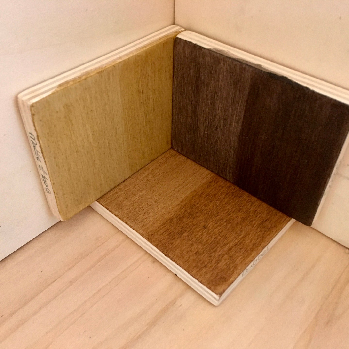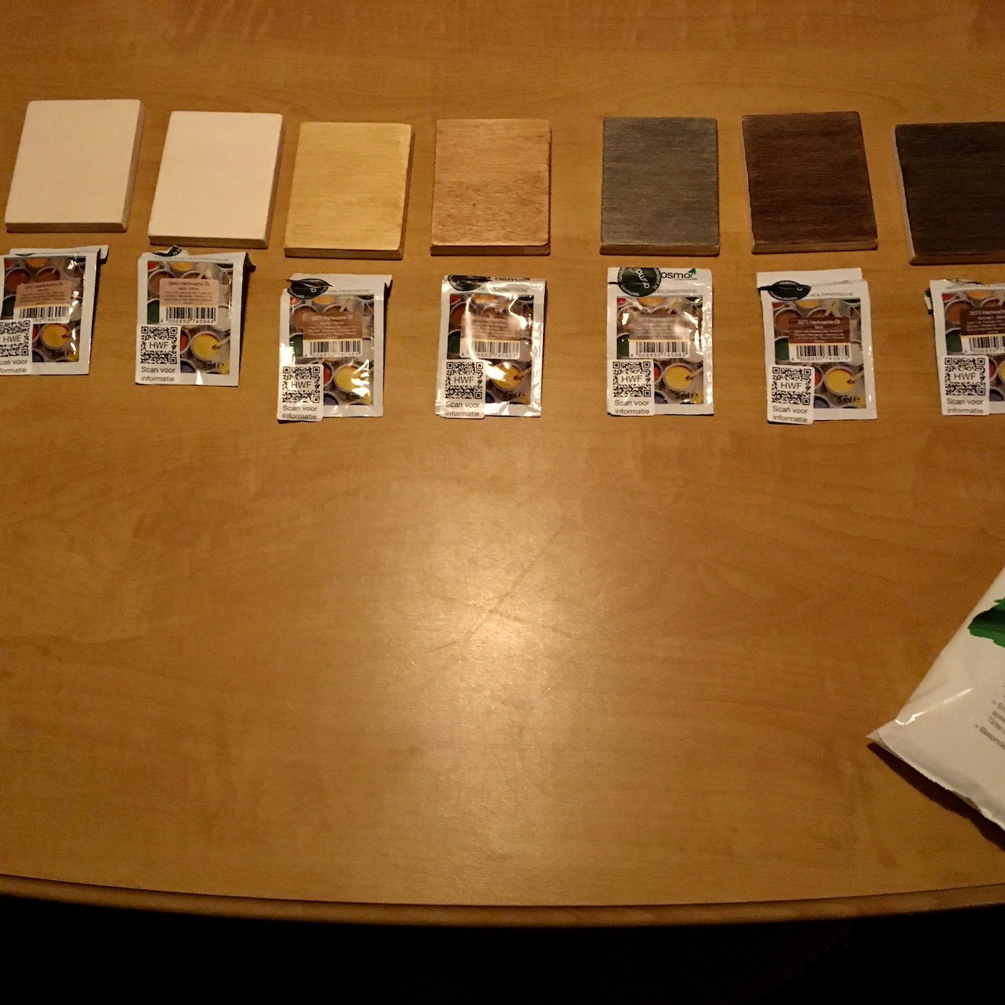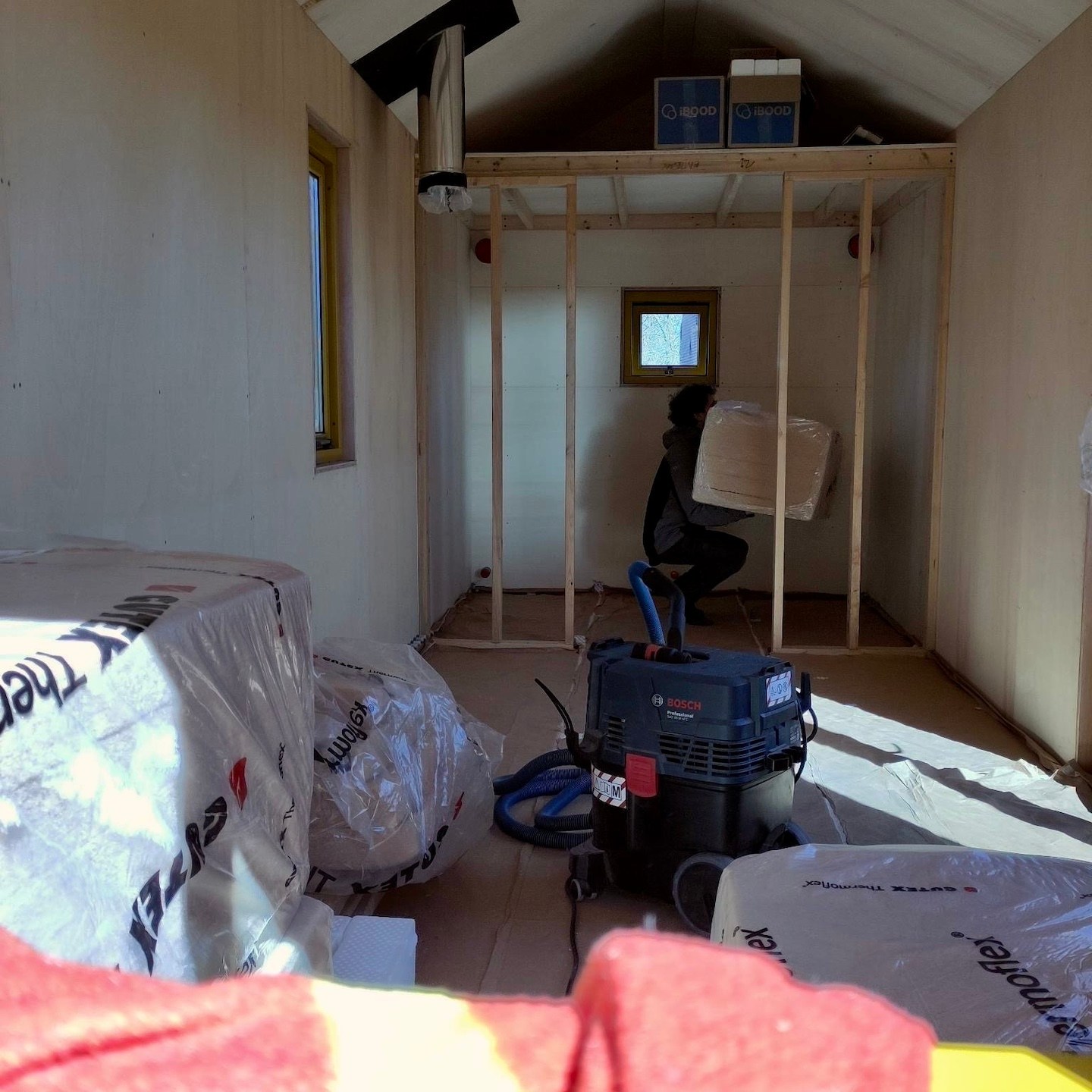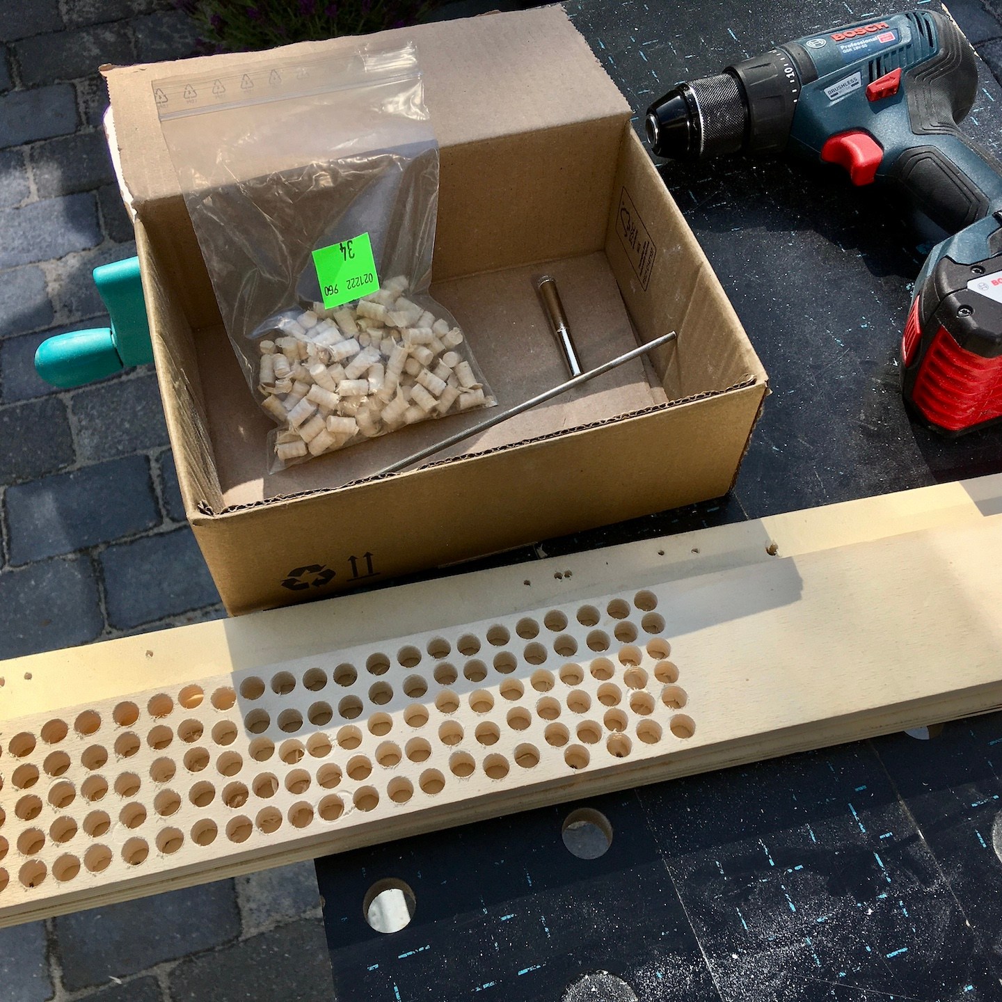 Wanneer we niet aan het graven waren (vooral omdat het wel heel erg zwaar en ergens ook een beetje hersendood (zeker omdat het soms lijkt alsof je niets hebt gedaan) werk is, en niet per se alleen omdat het af en toe gewoon veel te hard waaide en regende), waren Pat en ik vooral bezig met het nadenken over hoe we alles binnen willen gaan afwerken. Na een hoop onderzoek en contact leggen met diverse bedrijven hebben wij ten eerste uiteindelijk gekozen om onze verschillende houtsoorten te gaan testen met de producten van Osmo en in het bijzonder de houtwaxoliën die zij in hun assortiment hebben. Deze producten schijnen het karakter van hout te benadrukken en maken het hout daarnaast ook semi-waterdicht, terwijl het gewoon kan blijven ademen (iets wat bij onze dampopen-constructie natuurlijk heel belangrijk is), en daarnaast om de schroefgaatjes en kieren van de vloeren op te vullen met eigen gemaakte deuveltjes en de Woodmax kit van Bison/Griffon. Gelukkig bestaan er mini-gatzaagjes precies in de juiste diameter van onze schroefkoppen en konden we dit plan ook daadwerkelijk uitvoeren. En ja, ook dit was weer een enorm geduldig klusje waarbij er honderden deuveltjes gezaagd moesten worden (het gatzagen zelf was overigens niet het probleem, maar na elk deuveltje moest de boor weer uit de boormachine gehaald worden om hier met een dunne metalen pin het semi-vastzittende stukje hout (door de hitte smelt de lijm in de Ecoplex platen) uit de langzaam enorm heet wordende boor te duwen). Ahhh, ik kan niet wachten totdat ze straks allemaal bevestigd en afgewerkt zijn, haha:).