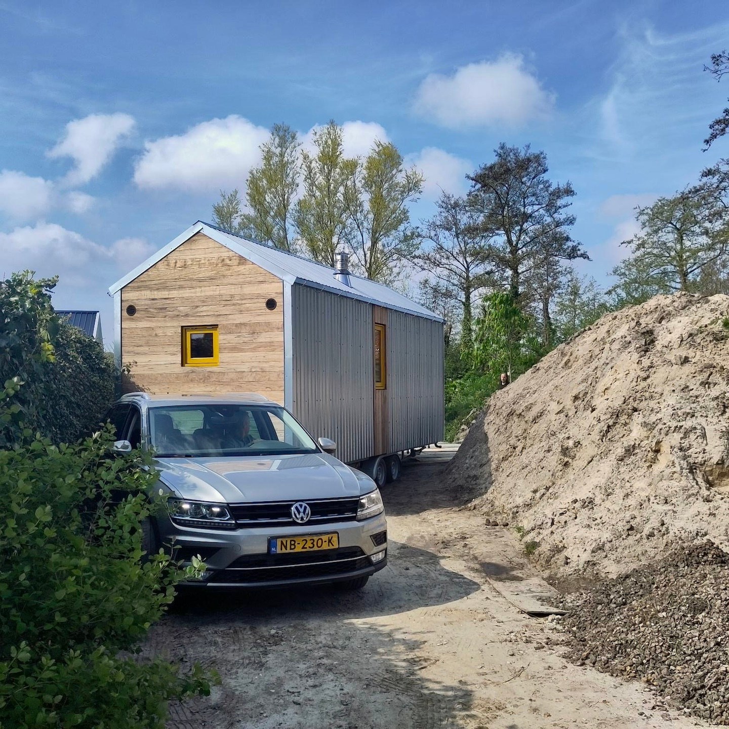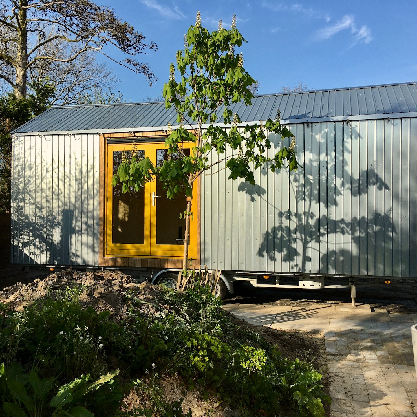 Tot slot bleef ook de tweede helft van april draaien om het versjouwen van grond, klei en zand en als klap op de vuurpijl zelfs een kuub grind dat de vorige bewoner als cadeautje had ingegraven en achtergelaten voor ons, thanksss…(a). Dit allemaal zodat we de tegels (deze keer gelukkig met een meer directe reden) konden gaan leggen om (nee, dit wordt geen fancy Romeins voetdompelbad) uiteindelijk mijn huisje (dat echt enorm in de weg stond op de bouwweg) voor de zevende keer alweer (zij het deze keer maar een aantal meters) en gelukkig met mooi weer op haar nieuwe, tijdelijke plek te zetten:).