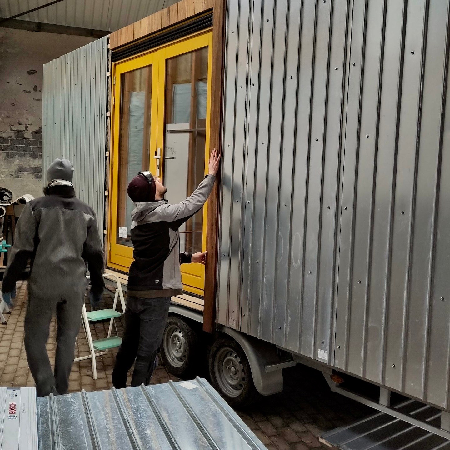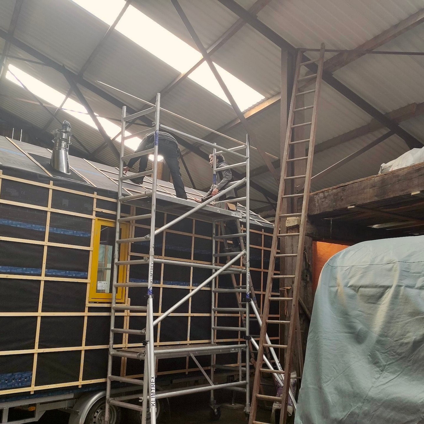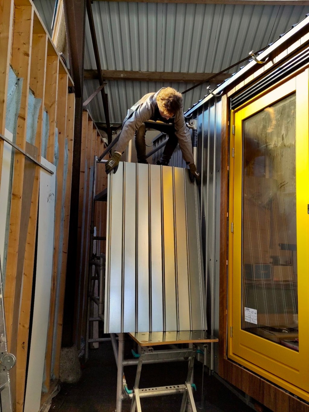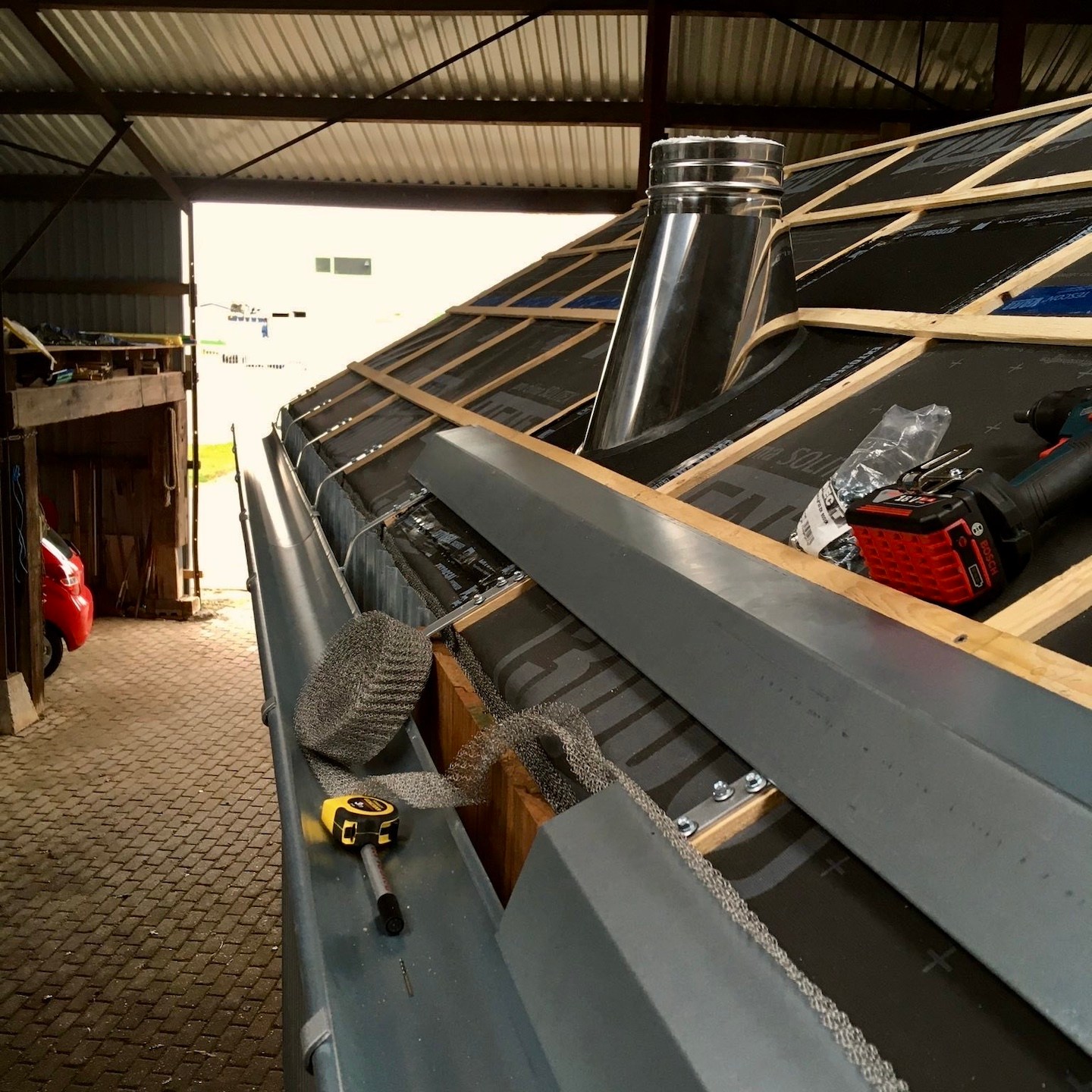 De ene keer gebeurde dit vooral onder de trailer (en ja, het zijn crisistijden, dus een stukje karton in plaats van het prins(essen)achtige met kussentjes bedekte rolkarretje, haha), de andere keer juist weer bovenop de trailer om de kachelpijp af te dichten (wederom met hittebestendige Fermitkit) en het horizontale regelwerk van het dak te plaatsen, maar ook om onder andere duivenpoep en bouwgruis te verwijderen (ik ben nog geen duivennestje in aanbouw tegengekomen (überhaupt ben ik nog nooit in mijn leven een duivennestje tegengekomen), maar mocht ik die tegenkomen, dan “return ik the favour” met alle plezier, haha) en zodoende net op tijd voor de alsmaar uitgestelde en opeens vervroegde deadline (het uitgraven van de fundering van het huis van onze ouders werd plots vervroegd, waardoor mijn huisje eerder verplaatst moest worden dan verwacht, anders had het voorlopig niet meer op de kavel gezet kunnen worden), oké op een enkel dingentje na, de buitenschil van mijn tiny huisje klaar te hebben. Vooral alle onderdelen die bij het dak kwamen kijken (denk aan de gootslabben, nokstukken, dakgootbeugels, windveren en dergelijke) vergden nog veel denk- en op maat-maak-werk, met in het bijzonder het buigen van de dakgootbeugels en het knippen en vouwen van de staalplaten, maar de druk deed ons heel snel keuzes maken, wat gelukkig elke keer goed uitpakte, hihi – een beetje stress leidt soms tot bijzonder veel progressie in een korte tijd.