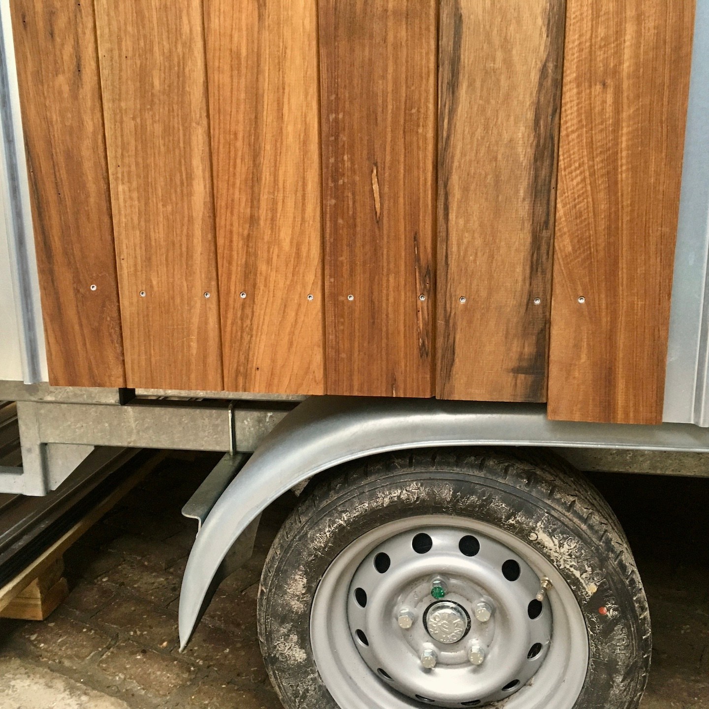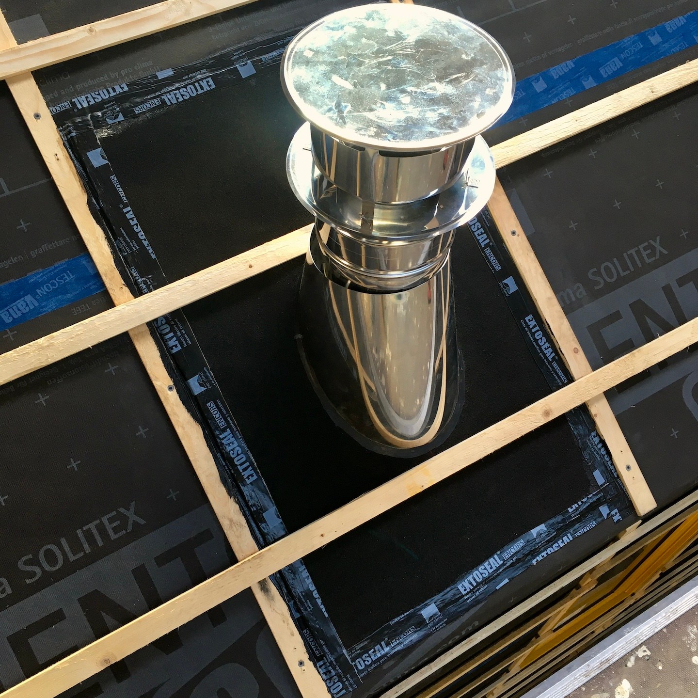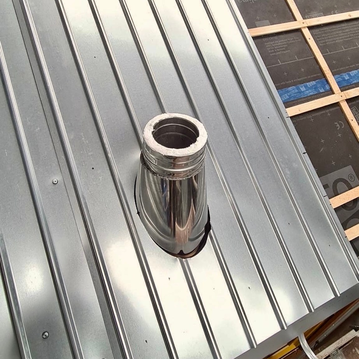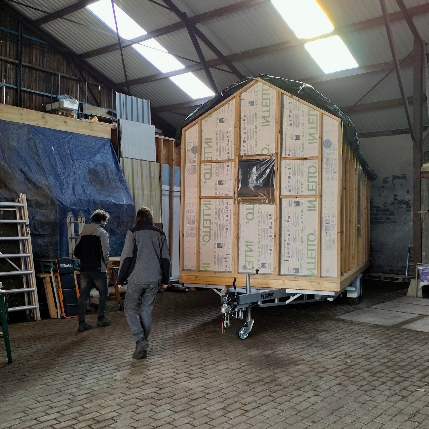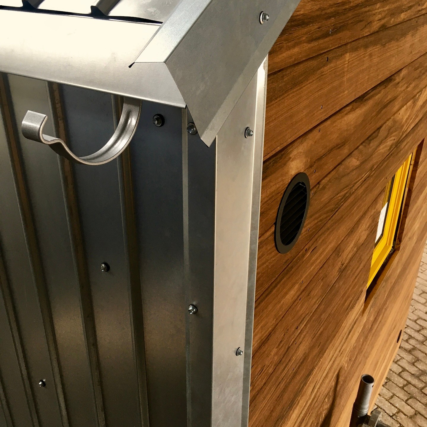 De ene keer gebeurde dit vooral onder de trailer (en ja, het zijn crisistijden, dus een stukje karton in plaats van het prins(essen)achtige met kussentjes bedekte rolkarretje, haha), de andere keer juist weer bovenop de trailer om de kachelpijp af te dichten (wederom met hittebestendige Fermitkit) en het horizontale regelwerk van het dak te plaatsen, maar ook om onder andere duivenpoep en bouwgruis te verwijderen (ik ben nog geen duivennestje in aanbouw tegengekomen (überhaupt ben ik nog nooit in mijn leven een duivennestje tegengekomen), maar mocht ik die tegenkomen, dan “return ik the favour” met alle plezier, haha) en zodoende net op tijd voor de alsmaar uitgestelde en opeens vervroegde deadline (het uitgraven van de fundering van het huis van onze ouders werd plots vervroegd, waardoor mijn huisje eerder verplaatst moest worden dan verwacht, anders had het voorlopig niet meer op de kavel gezet kunnen worden), oké op een enkel dingentje na, de buitenschil van mijn tiny huisje klaar te hebben. Vooral alle onderdelen die bij het dak kwamen kijken (denk aan de gootslabben, nokstukken, dakgootbeugels, windveren en dergelijke) vergden nog veel denk- en op maat-maak-werk, met in het bijzonder het buigen van de dakgootbeugels en het knippen en vouwen van de staalplaten, maar de druk deed ons heel snel keuzes maken, wat gelukkig elke keer goed uitpakte, hihi – een beetje stress leidt soms tot bijzonder veel progressie in een korte tijd.