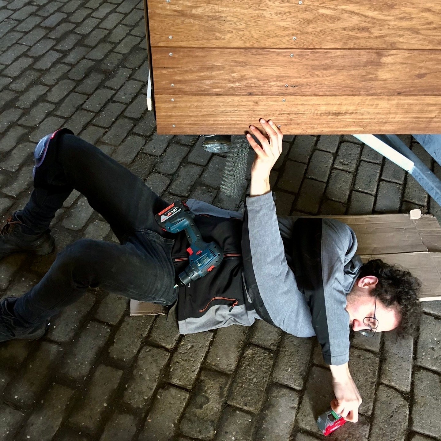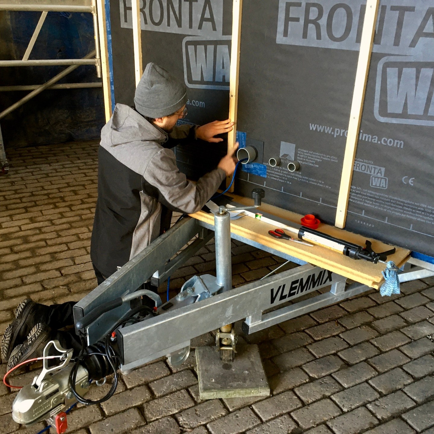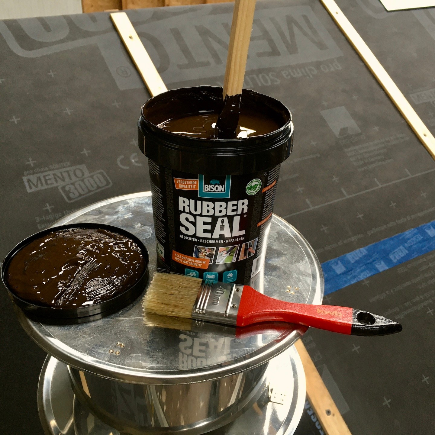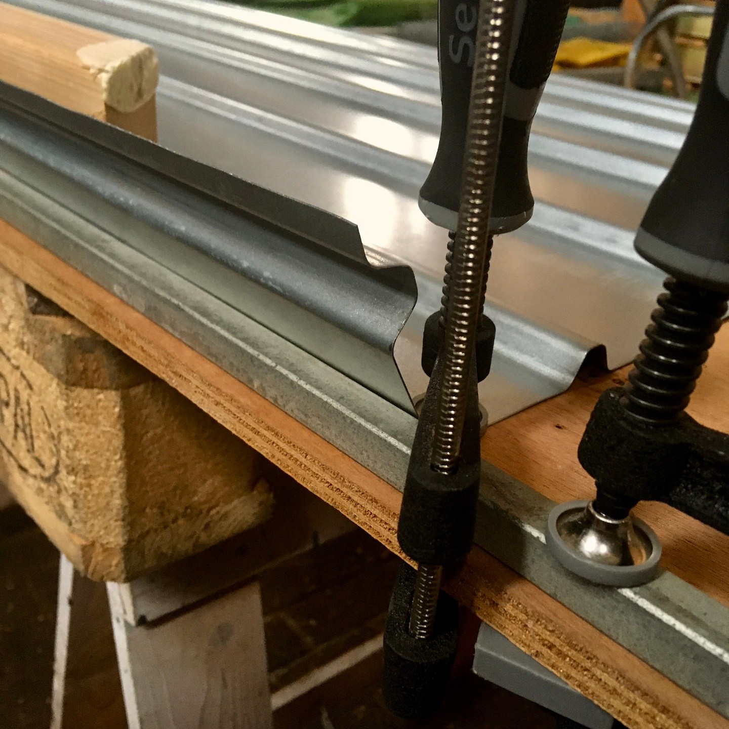 De ene keer gebeurde dit vooral onder de trailer (en ja, het zijn crisistijden, dus een stukje karton in plaats van het prins(essen)achtige met kussentjes bedekte rolkarretje, haha), de andere keer juist weer bovenop de trailer om de kachelpijp af te dichten (wederom met hittebestendige Fermitkit) en het horizontale regelwerk van het dak te plaatsen, maar ook om onder andere duivenpoep en bouwgruis te verwijderen (ik ben nog geen duivennestje in aanbouw tegengekomen (überhaupt ben ik nog nooit in mijn leven een duivennestje tegengekomen), maar mocht ik die tegenkomen, dan “return ik the favour” met alle plezier, haha) en zodoende net op tijd voor de alsmaar uitgestelde en opeens vervroegde deadline (het uitgraven van de fundering van het huis van onze ouders werd plots vervroegd, waardoor mijn huisje eerder verplaatst moest worden dan verwacht, anders had het voorlopig niet meer op de kavel gezet kunnen worden), oké op een enkel dingentje na, de buitenschil van mijn tiny huisje klaar te hebben. Vooral alle onderdelen die bij het dak kwamen kijken (denk aan de gootslabben, nokstukken, dakgootbeugels, windveren en dergelijke) vergden nog veel denk- en op maat-maak-werk, met in het bijzonder het buigen van de dakgootbeugels en het knippen en vouwen van de staalplaten, maar de druk deed ons heel snel keuzes maken, wat gelukkig elke keer goed uitpakte, hihi – een beetje stress leidt soms tot bijzonder veel progressie in een korte tijd.
