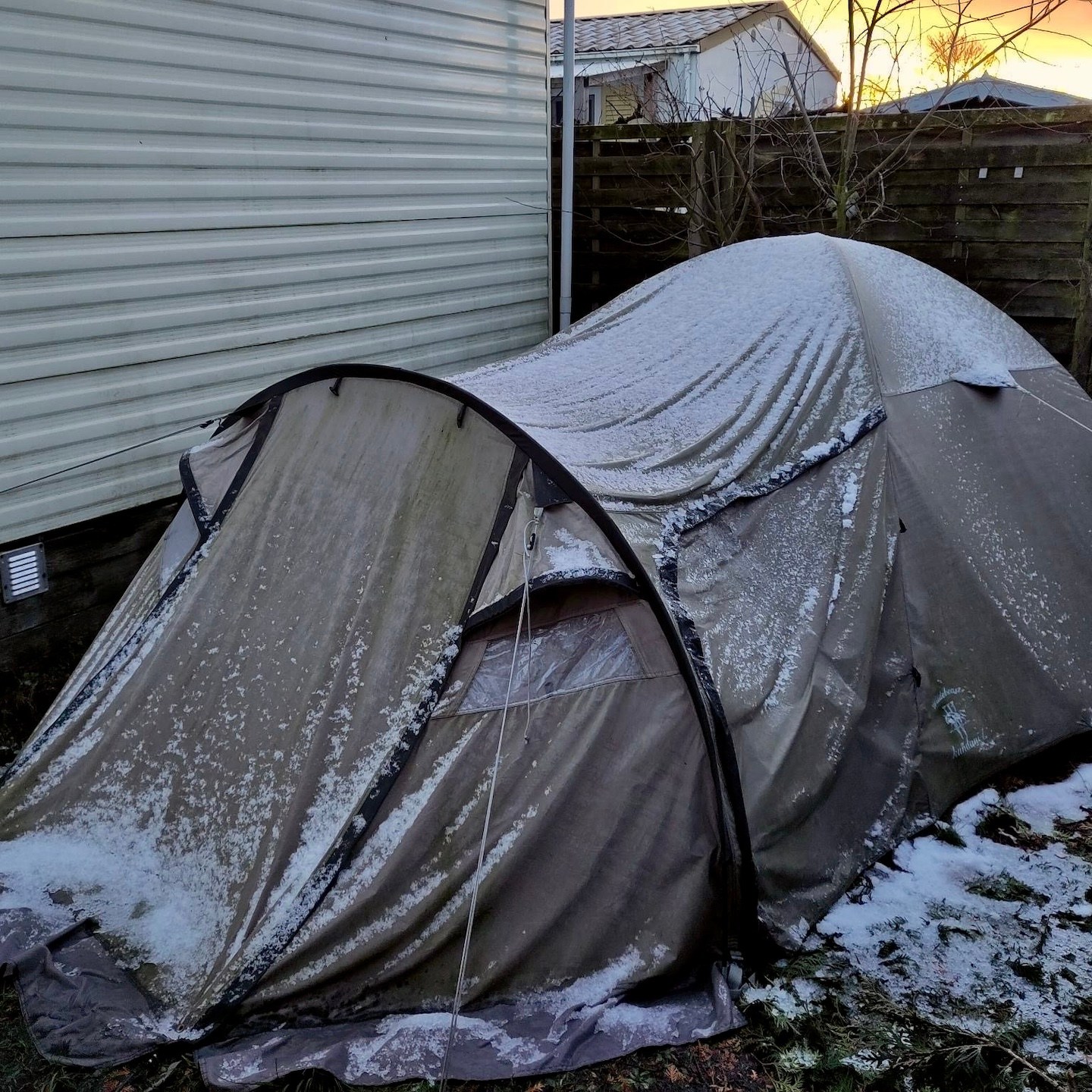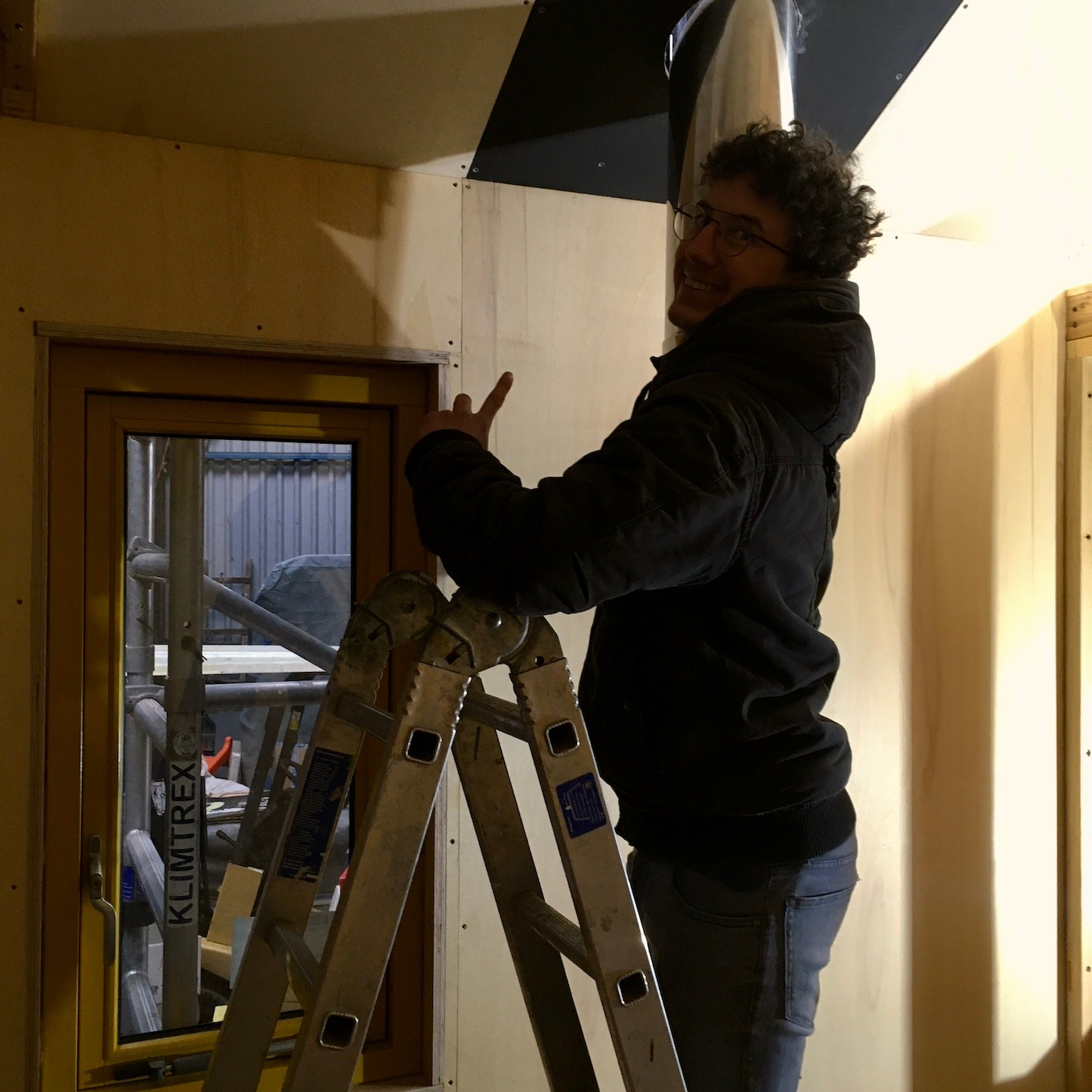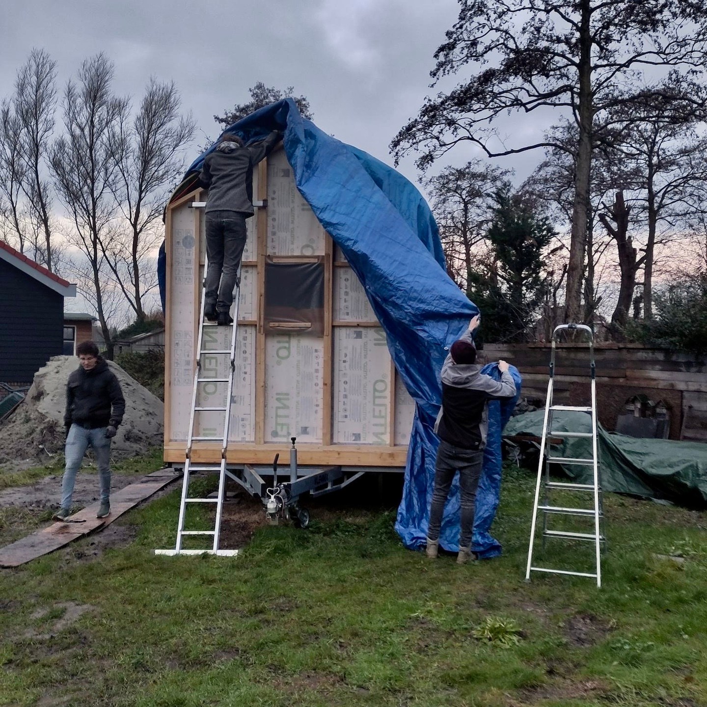 Omdat het vervangen van het dak van de bouwschuur vanwege de cumulatie van weersomstandigheden verder een stuk langer duurde dan verwacht, stond onze december en het begin van januari vooral in het teken van het oriënteren, bestellen en ophalen van nieuwe benodigde materialen, het uitdenken van kleine wijzigingen waar we in de praktijk zo nu en dan tegenaan liepen (extra props ook naar Ray voor het herontwerpen en maken van onze (nu wel passende) dakkachelbevestigingsbeugels), een enkele klus aan mijn trailer (zoals het monteren van de lucht-toevoerroosters – zoals je ziet (met behulp van wellicht een beetje inlevingsvermogen) ook in “ideale” werkomstandigheden, haha) en uiteindelijk weer het verhuizen van deze keer onze beide huisjes – die van mij weer naar de bouwschuur om verder aan te klussen en die van Pat naar een veilige, warme caravanstalling een paar honderd meter verderop. Vooral dit laatste was een enorme opluchting toen het eindelijk voor elkaar was en Patricks trailer het weer niet meer hoefde te trotseren – een mega dankjewel wederom aan alle omwonenden die hebben meegeholpen, evenals aan alle blije en grappige Ghibli/Shinto-achtige-gezichtjes die steeds vaker lijken op te duiken (jullie zien die ook toch? Of begin ik na driekwartjaar in Burgh-Haamstede steeds meer te hallucineren en duiken er steeds meer soort van “Wilsons” (Quote: “WILSONNN!”) op om mij heen?).