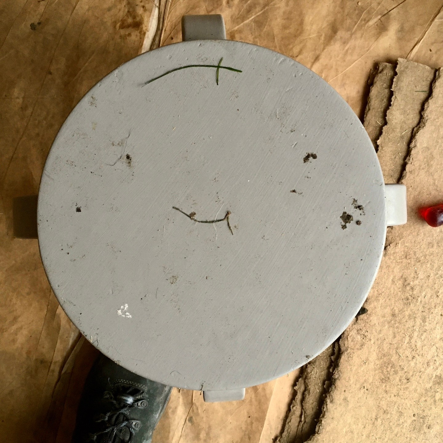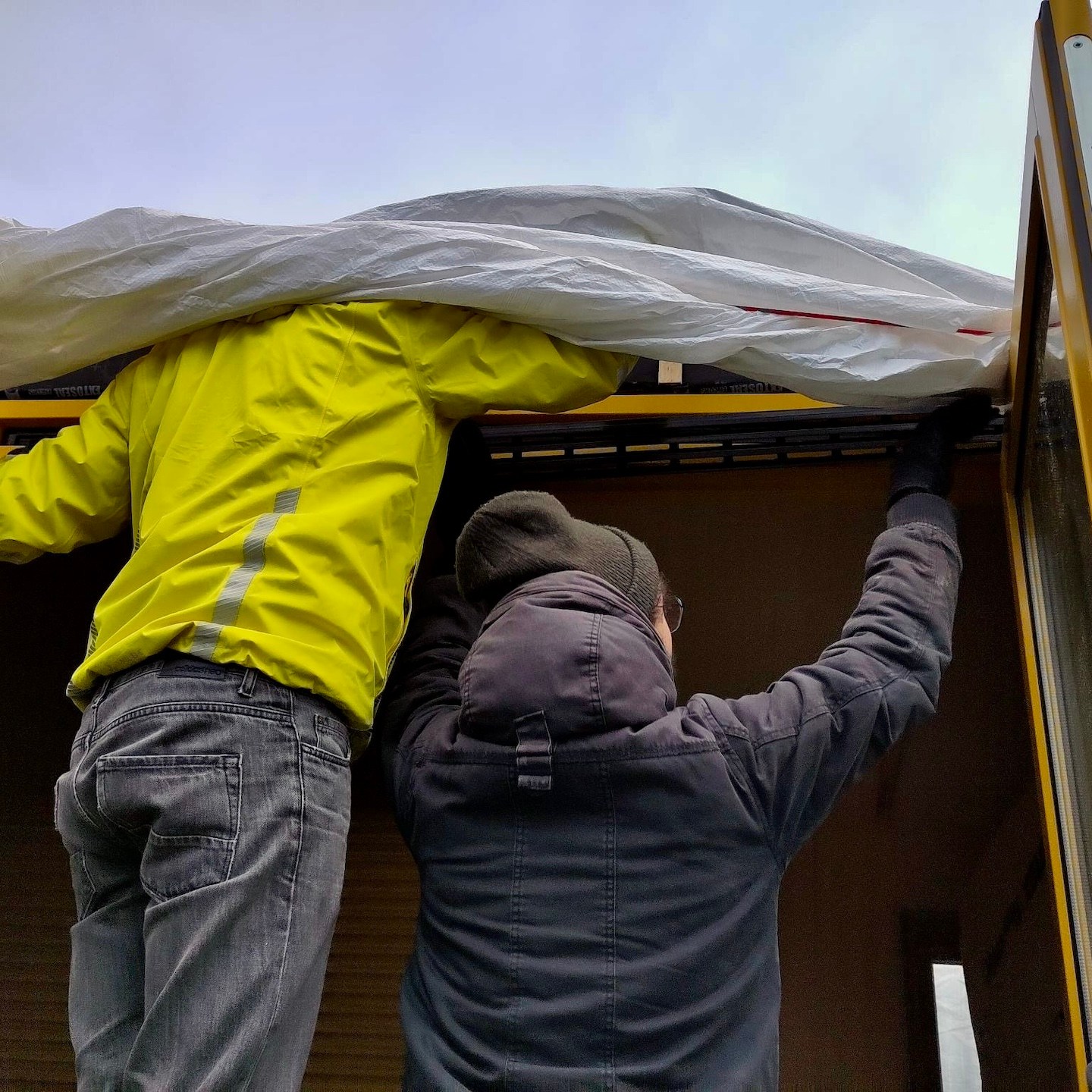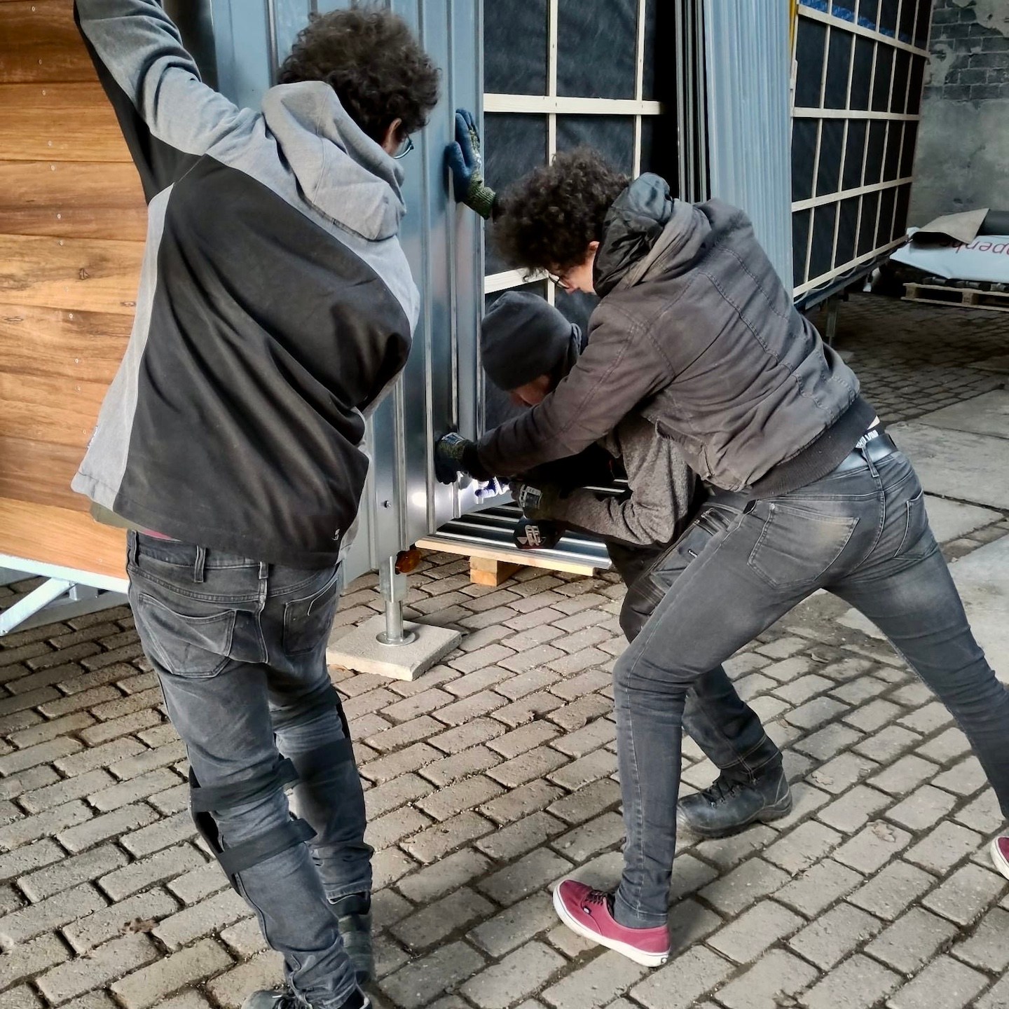 Omdat het vervangen van het dak van de bouwschuur vanwege de cumulatie van weersomstandigheden verder een stuk langer duurde dan verwacht, stond onze december en het begin van januari vooral in het teken van het oriënteren, bestellen en ophalen van nieuwe benodigde materialen, het uitdenken van kleine wijzigingen waar we in de praktijk zo nu en dan tegenaan liepen (extra props ook naar Ray voor het herontwerpen en maken van onze (nu wel passende) dakkachelbevestigingsbeugels), een enkele klus aan mijn trailer (zoals het monteren van de lucht-toevoerroosters – zoals je ziet (met behulp van wellicht een beetje inlevingsvermogen) ook in “ideale” werkomstandigheden, haha) en uiteindelijk weer het verhuizen van deze keer onze beide huisjes – die van mij weer naar de bouwschuur om verder aan te klussen en die van Pat naar een veilige, warme caravanstalling een paar honderd meter verderop. Vooral dit laatste was een enorme opluchting toen het eindelijk voor elkaar was en Patricks trailer het weer niet meer hoefde te trotseren – een mega dankjewel wederom aan alle omwonenden die hebben meegeholpen, evenals aan alle blije en grappige Ghibli/Shinto-achtige-gezichtjes die steeds vaker lijken op te duiken (jullie zien die ook toch? Of begin ik na driekwartjaar in Burgh-Haamstede steeds meer te hallucineren en duiken er steeds meer soort van “Wilsons” (Quote: “WILSONNN!”) op om mij heen?).