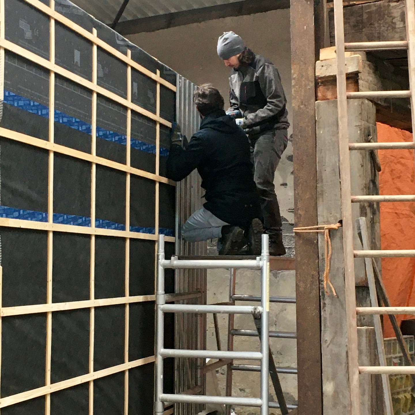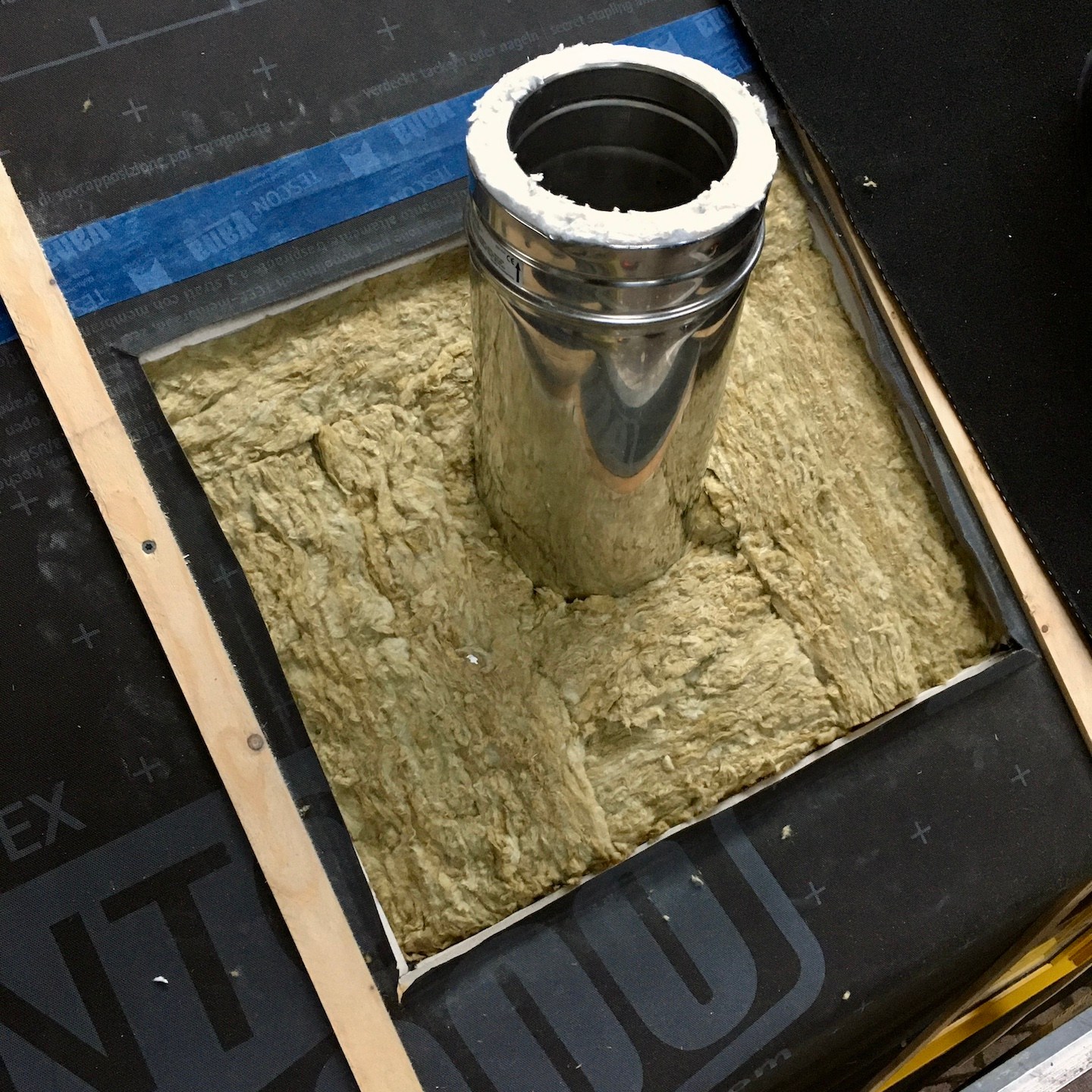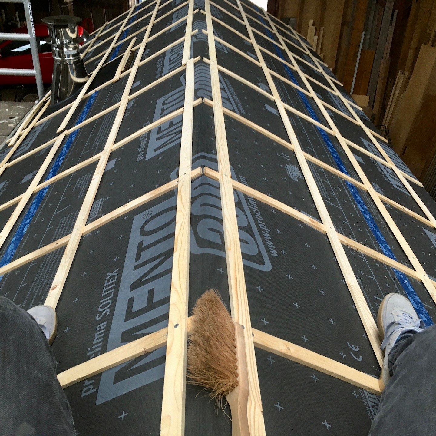 Blablabla, lalala, na het verhuizen van de huisjes kon er vervolgens, mede weer met hier en daar en zo nu en dan de hulp van vooral Ray (en een verdwaalde Bou, haha) (al was het soms vooral om dingen vast te houden terwijl Pat en ik aan het nadenken en puzzelen waren of gewoonweg om ditmaal niet de binnenkant van de vloer maar binnenin het dak te stofzuigen, haha. Je vraagt je misschien af waarom we dat doen? Nou, naast dat we een kleine, lichte schoonmaaktik hebben, doen we dit in dit geval vooral om de potentieel brandbare materialen weg te halen en ons streven naar “brandschoon-heid” en controle over het vuur, geheel in lijn met onze grote vriend Prometheus (diegene die het vuur van de goden stal en aan de mensen gaf), in eigen handen te houden), in ieder geval weer lekker doorgewerkt worden. Een extra absurdistisch/ironisch moment hierbij was dat Pat de laatste (brandwerende) isolatie (van Rockwool) aan mijn buitenschil aan het toevoegen was (we willen natuurlijk niet dat de kachelpijp kou hoeft te lijden hè, haha) en het besef binnenkwam dat zijn huisje nu wel warm en droog binnen stond en mijn huisje aangenaam ingepakt was, maar hijzelf nog tot voorbij medio februari in de tent verbleef (waarvan de rits regelmatig was vastgevroren…(a)). Pas tegen het einde van februari wilden mijn ouders eindelijk “uit huis” gaan (ze blijven ook zo lang plakken soms, maar nee vooral omdat toen het veel comfortabelere bijgebouw in ver genoege staat was om in te gaan wonen) en kon Pat de tent uit en ook de stacaravan in komen (wat zoals eerder ook al omschreven was, niet altijd een pretje was/is. Maar nu hoeft hij in ieder geval niet door de regen en kou naar buiten voordat hij naar het toilet kan gaan en kan hij gewoon rechtop staan om zich aan te kleden, haha)…en kon er met de herboren energie die deze verschillende woon-upgrades en huisjes-verplaatsingen voor eenieder met zich meebrachten, weer in een meer vol te houden tempo en met een rustigere gemoedstoestand verder gewerkt worden aan mijn buitenschil.