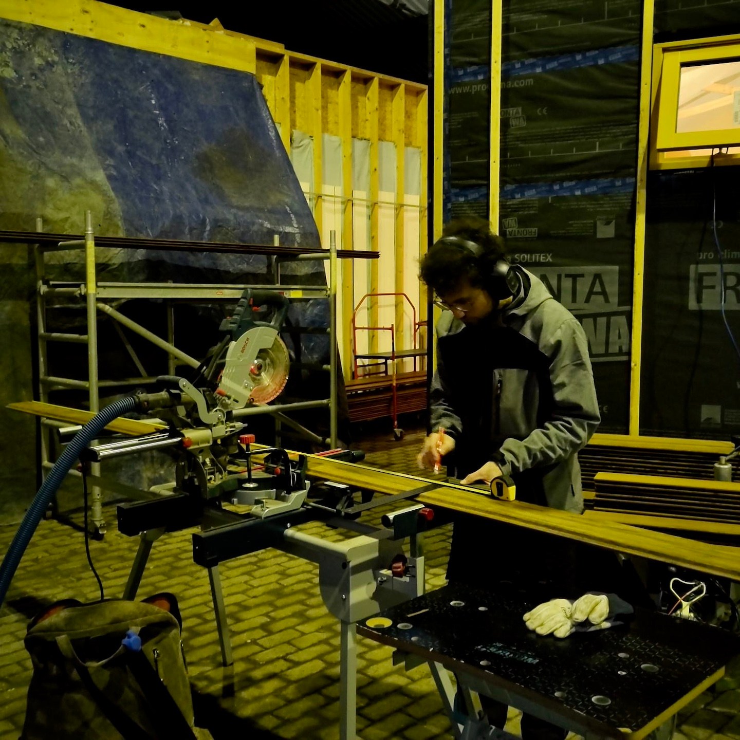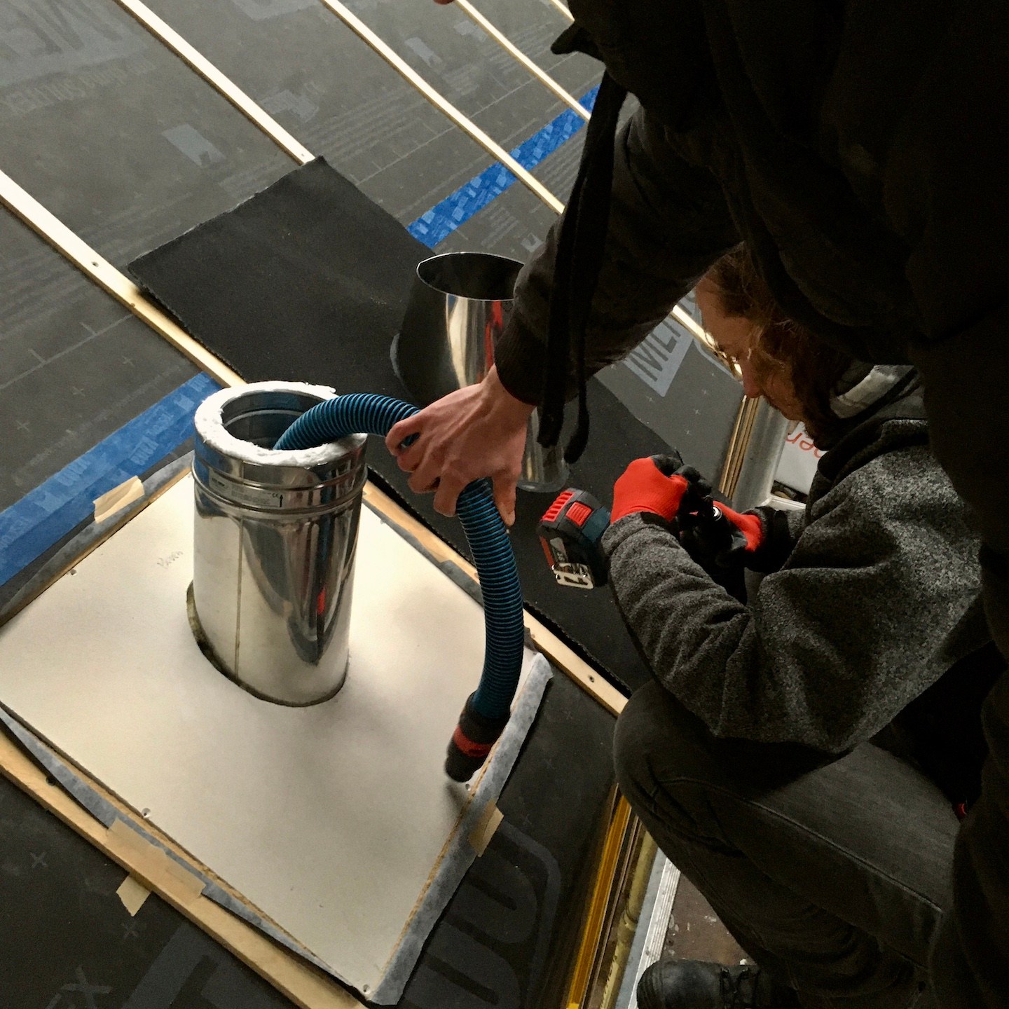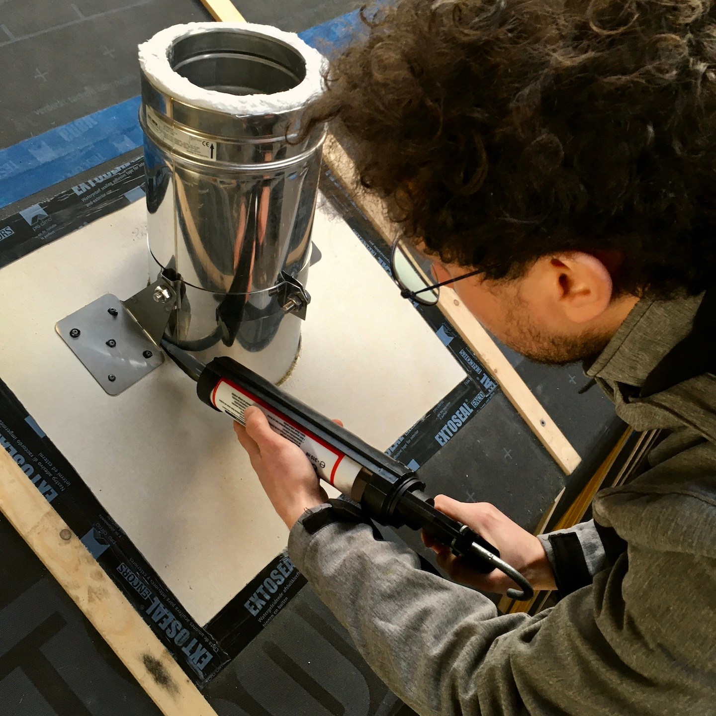 Blablabla, lalala, na het verhuizen van de huisjes kon er vervolgens, mede weer met hier en daar en zo nu en dan de hulp van vooral Ray (en een verdwaalde Bou, haha) (al was het soms vooral om dingen vast te houden terwijl Pat en ik aan het nadenken en puzzelen waren of gewoonweg om ditmaal niet de binnenkant van de vloer maar binnenin het dak te stofzuigen, haha. Je vraagt je misschien af waarom we dat doen? Nou, naast dat we een kleine, lichte schoonmaaktik hebben, doen we dit in dit geval vooral om de potentieel brandbare materialen weg te halen en ons streven naar “brandschoon-heid” en controle over het vuur, geheel in lijn met onze grote vriend Prometheus (diegene die het vuur van de goden stal en aan de mensen gaf), in eigen handen te houden), in ieder geval weer lekker doorgewerkt worden. Een extra absurdistisch/ironisch moment hierbij was dat Pat de laatste (brandwerende) isolatie (van Rockwool) aan mijn buitenschil aan het toevoegen was (we willen natuurlijk niet dat de kachelpijp kou hoeft te lijden hè, haha) en het besef binnenkwam dat zijn huisje nu wel warm en droog binnen stond en mijn huisje aangenaam ingepakt was, maar hijzelf nog tot voorbij medio februari in de tent verbleef (waarvan de rits regelmatig was vastgevroren…(a)). Pas tegen het einde van februari wilden mijn ouders eindelijk “uit huis” gaan (ze blijven ook zo lang plakken soms, maar nee vooral omdat toen het veel comfortabelere bijgebouw in ver genoege staat was om in te gaan wonen) en kon Pat de tent uit en ook de stacaravan in komen (wat zoals eerder ook al omschreven was, niet altijd een pretje was/is. Maar nu hoeft hij in ieder geval niet door de regen en kou naar buiten voordat hij naar het toilet kan gaan en kan hij gewoon rechtop staan om zich aan te kleden, haha)…en kon er met de herboren energie die deze verschillende woon-upgrades en huisjes-verplaatsingen voor eenieder met zich meebrachten, weer in een meer vol te houden tempo en met een rustigere gemoedstoestand verder gewerkt worden aan mijn buitenschil.