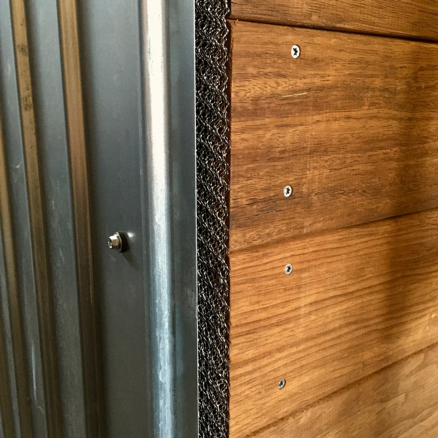 Ik ben benieuwd wat jullie ervan vinden, maar mijn eigen eerste indrukken zijn vooral dat de uitstraling uiteindelijk iets industriëler is geworden dan eerst verwacht, maar zowel het B-kwaliteit thermisch gemodificeerde Fraké-hout van Platowood (wat wij bij Gewoon Hout Dordrecht (echt een hele toffe en vriendelijke plek) hebben gehaald en overigens echt super lekker ruikt) als het met een magnesium/zink/aluminium (lees: magnelis) gecoate staal van Precit (waar alle dakbenodigdheden verder ook van zijn) hebben een enorm hoge duurzaamheidsklasse en zijn gelukkig zo speels mooi onderhevig aan diverse lichtinvloeden (deze soort van “Komorebi” (het effect van licht dat door de bladeren heen valt) is precies wat ik wilde bewerkstelligen met de materialen) dat ik in ieder geval reuzeblij ben met het resultaat, jeeej (tussen alle kieren van het hout en het plaatwerk hebben wij trouwens insectengaas geplaatst en Rubberseal van Bison/Griffon en/of Extoseal van Pro Clima gebruikt om zo hopelijk zo veel mogelijk ongewenste diertjes buiten de gehele schil te houden – spinnen zijn altijd welkom natuurlijk, haha).