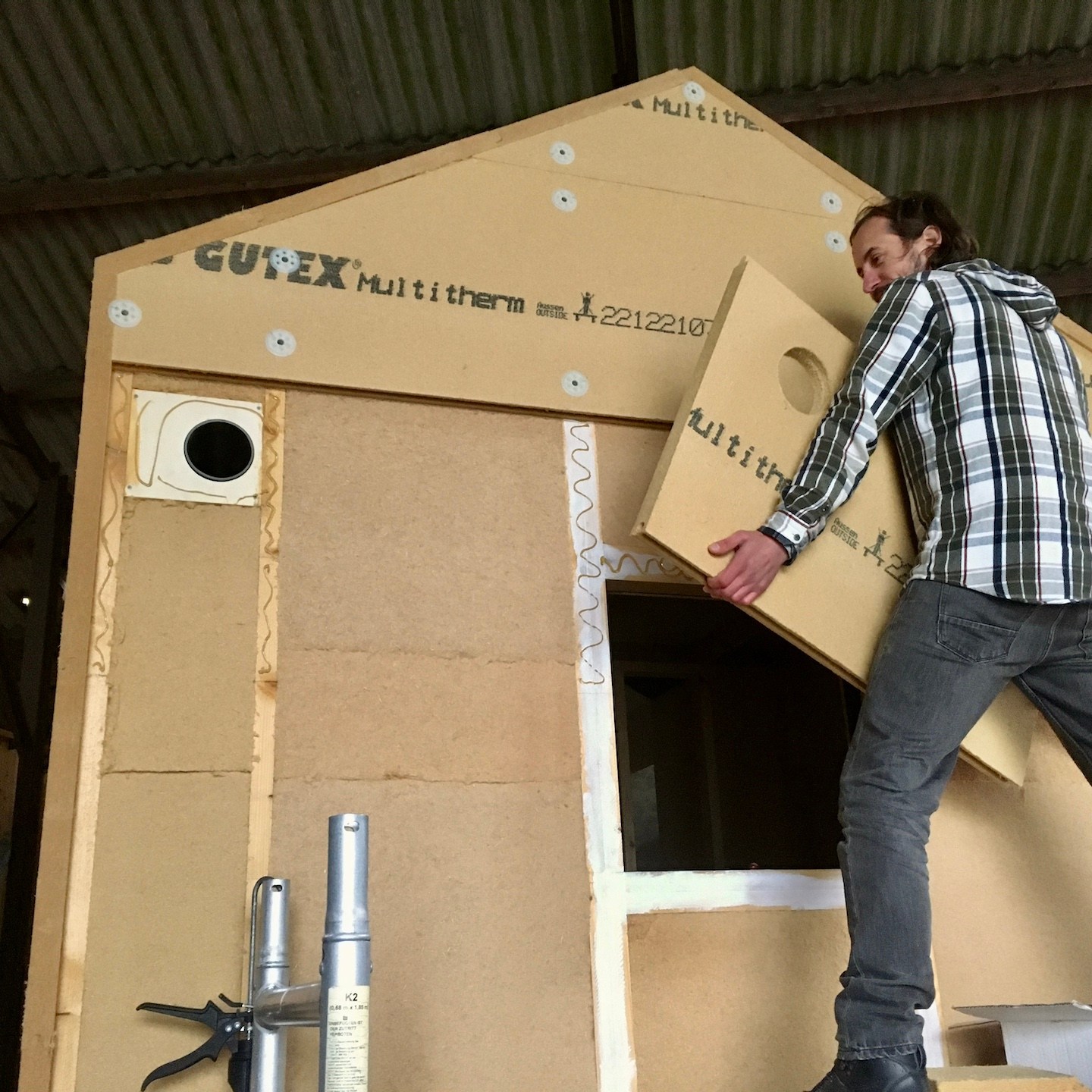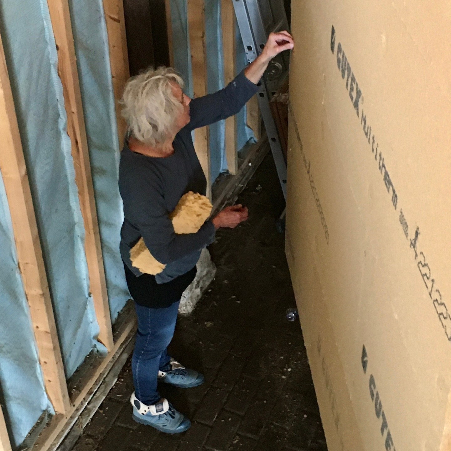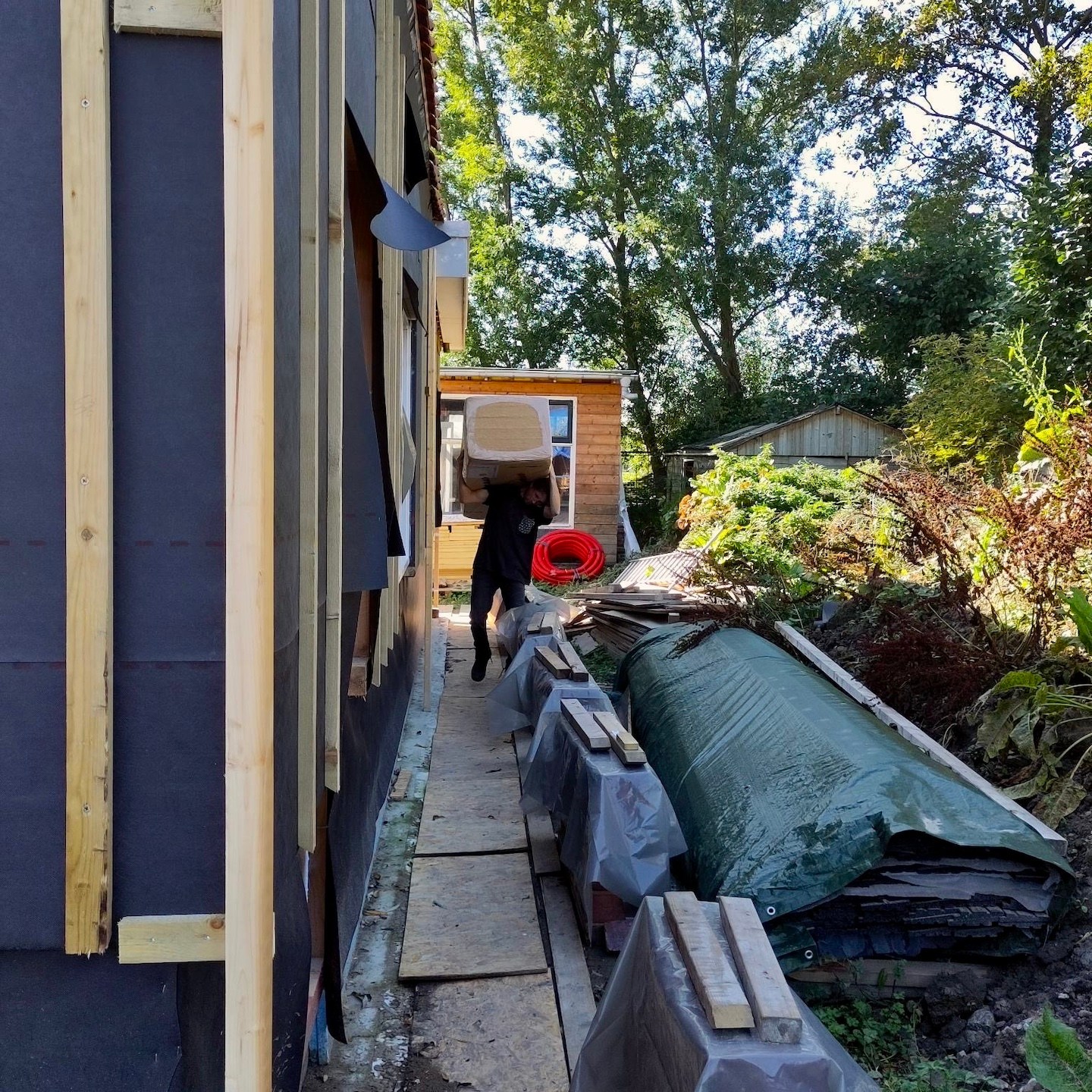 Het dak gaf ons vervolgens een goed referentiekader om hetzelfde riedeltje toe te passen op de gevels. Bijkomstigheid hier was echter wel dat er met de hoogste precisie ook doorvoerbuizen gezaagd en geplaatst moesten worden en dat op de horizontale gevels het gevecht tegen de zwaartekracht (hmmm, nu ik eraan denk, ken ik geen Griekse god(in) van de zwaartekracht…mocht iemand dit wel weten, weet dan dat ik altijd open sta voor dergelijke kennis) begon. Gelukkig stonden de hulptroepen hierbij zo nu en dan ook klaar om ons zowel bij het denkwerk als bij de fysieke inspanning te ondersteunen (voor diegene die geholpen hebben, jullie mogen zelf uitmaken of je respectievelijk meer een Hephaistos (smeedkunst/vakmanschapgod) bent geweest of juist eerder in lijn met Atlas’ (de titaan die er met brute kracht voor zorgde dat de hemel en de aarde gescheiden bleven) sterktes hebt geholpen, hihi, voor mij hadden alle hulptroepen zowel iets goddelijks als titaans in zich:)). De doorvoerbuizen zijn overigens voor de warmtepomp (of nitro/turbo) op de westgevel, al het elektra (of ’s werelds kleinste pijporgel) op de noordgevel en de afzuiging, watertoevoer en riolering (of een geraffineerd speakersysteem) op de oostgevel, en zijn allemaal ingestopt met wol, omdat wol nou eenmaal beter tegen potentieel ontstane condens kan dan houtvezelisolatie.