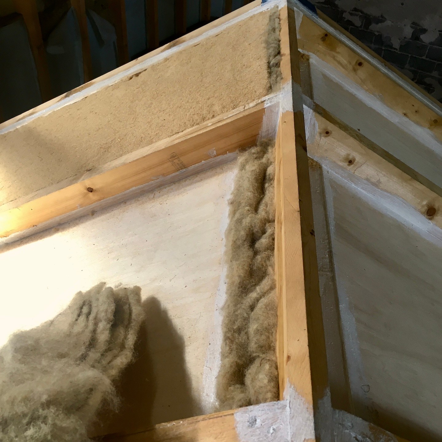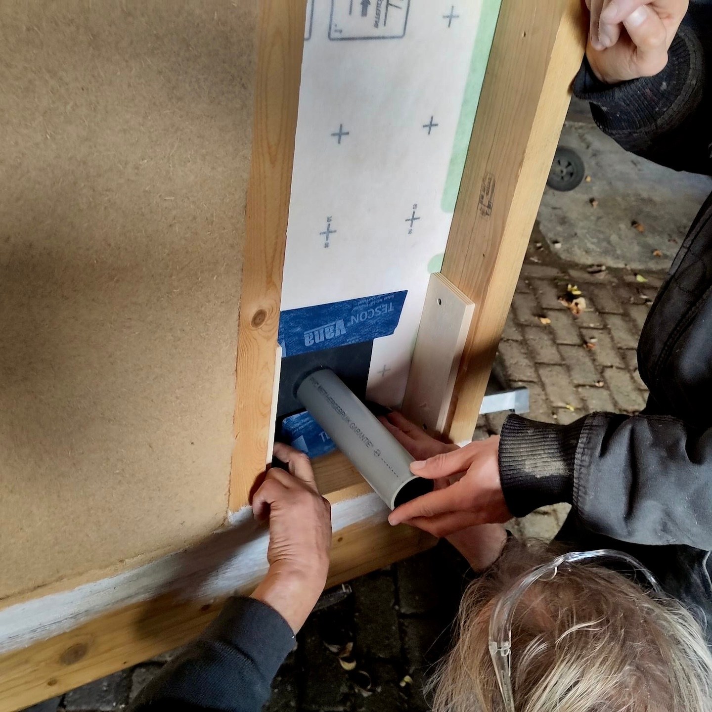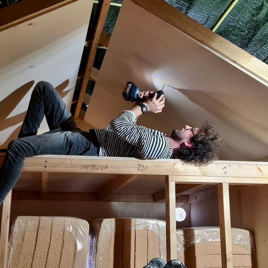 Het dak gaf ons vervolgens een goed referentiekader om hetzelfde riedeltje toe te passen op de gevels. Bijkomstigheid hier was echter wel dat er met de hoogste precisie ook doorvoerbuizen gezaagd en geplaatst moesten worden en dat op de horizontale gevels het gevecht tegen de zwaartekracht (hmmm, nu ik eraan denk, ken ik geen Griekse god(in) van de zwaartekracht…mocht iemand dit wel weten, weet dan dat ik altijd open sta voor dergelijke kennis) begon. Gelukkig stonden de hulptroepen hierbij zo nu en dan ook klaar om ons zowel bij het denkwerk als bij de fysieke inspanning te ondersteunen (voor diegene die geholpen hebben, jullie mogen zelf uitmaken of je respectievelijk meer een Hephaistos (smeedkunst/vakmanschapgod) bent geweest of juist eerder in lijn met Atlas’ (de titaan die er met brute kracht voor zorgde dat de hemel en de aarde gescheiden bleven) sterktes hebt geholpen, hihi, voor mij hadden alle hulptroepen zowel iets goddelijks als titaans in zich:)). De doorvoerbuizen zijn overigens voor de warmtepomp (of nitro/turbo) op de westgevel, al het elektra (of ’s werelds kleinste pijporgel) op de noordgevel en de afzuiging, watertoevoer en riolering (of een geraffineerd speakersysteem) op de oostgevel, en zijn allemaal ingestopt met wol, omdat wol nou eenmaal beter tegen potentieel ontstane condens kan dan houtvezelisolatie.