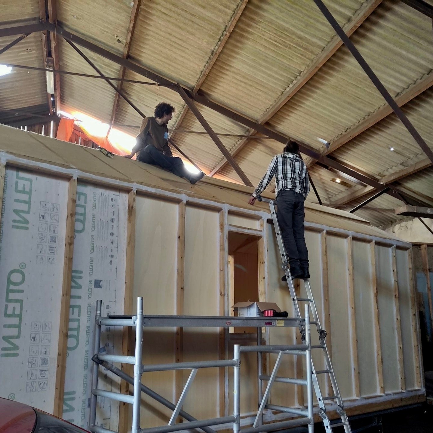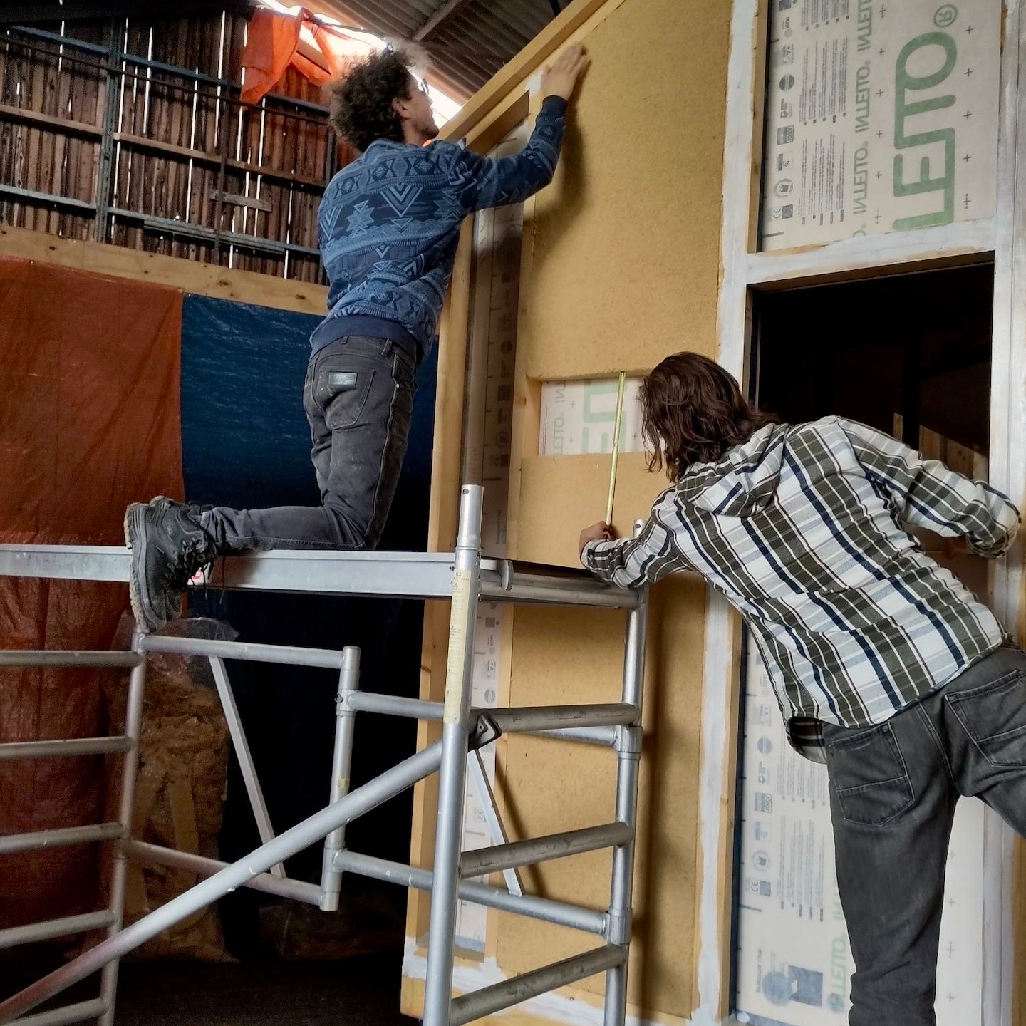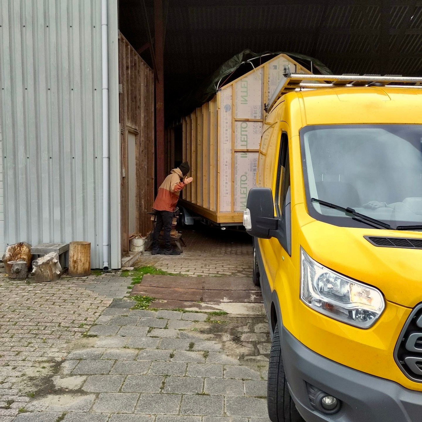 Gelukkig volgde in diezelfde week nog een positieve wending en mogen we (omdat zij ons leed en onze struggle op de kavel waarschijnlijk niet meer konden aanzien) gebruik maken van de schuur van de ouders van onze nieuwe buren hier, die op enkele honderden meters loopafstand van de kavel en het kantoor ligt, jeej familie Bakker! Oké, de schuur heeft verder geen deur (dus kan ook niet op slot), het dak is beschadigd en hier en daar lekjes door de storm van afgelopen voorjaar (dus dat moeten we nog steeds in de gaten houden) en zal in december moeten worden vervangen (dus dan moeten we er ook weer uit zijn) en zodoende is het er dus ook gewoon koud en ondanks de open “deur” en gaten in het dak best wel snel donker, haha, en kan er echter maar één huisje tegelijkertijd in die schuur staan, maar èh, het is als nog beter dan buiten staan en klussen. Al betekent dit aan de ene kant overigens ook dat dit de eerste keer is dat onze huisjes langdurig(er) van elkaar verwijderd zullen zijn en dat zij daarmee ook niet tegelijkertijd zullen worden opgebouwd, maar aan de andere kant brengt deze wending met zich mee dat het zeil er weer af kan bij (in dit geval) mijn huisje en er ongeacht wat voor weer het is er met een groep of zelfs weer alleen fijn doorgewerkt kon worden.