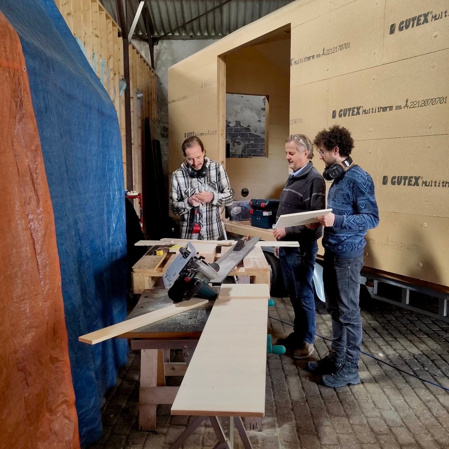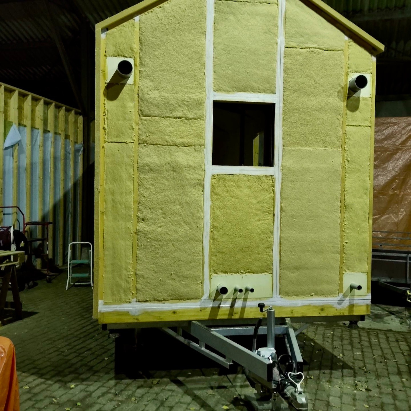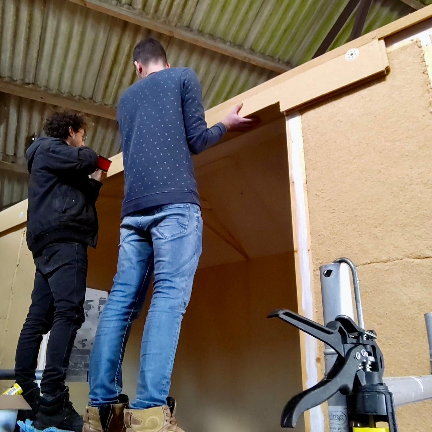Gelukkig volgde in diezelfde week nog een positieve wending en mogen we (omdat zij ons leed en onze struggle op de kavel waarschijnlijk niet meer konden aanzien) gebruik maken van de schuur van de ouders van onze nieuwe buren hier, die op enkele honderden meters loopafstand van de kavel en het kantoor ligt, jeej familie Bakker! Oké, de schuur heeft verder geen deur (dus kan ook niet op slot), het dak is beschadigd en hier en daar lekjes door de storm van afgelopen voorjaar (dus dat moeten we nog steeds in de gaten houden) en zal in december moeten worden vervangen (dus dan moeten we er ook weer uit zijn) en zodoende is het er dus ook gewoon koud en ondanks de open “deur” en gaten in het dak best wel snel donker, haha, en kan er echter maar één huisje tegelijkertijd in die schuur staan, maar èh, het is als nog beter dan buiten staan en klussen. Al betekent dit aan de ene kant overigens ook dat dit de eerste keer is dat onze huisjes langdurig(er) van elkaar verwijderd zullen zijn en dat zij daarmee ook niet tegelijkertijd zullen worden opgebouwd, maar aan de andere kant brengt deze wending met zich mee dat het zeil er weer af kan bij (in dit geval) mijn huisje en er ongeacht wat voor weer het is er met een groep of zelfs weer alleen fijn doorgewerkt kon worden.