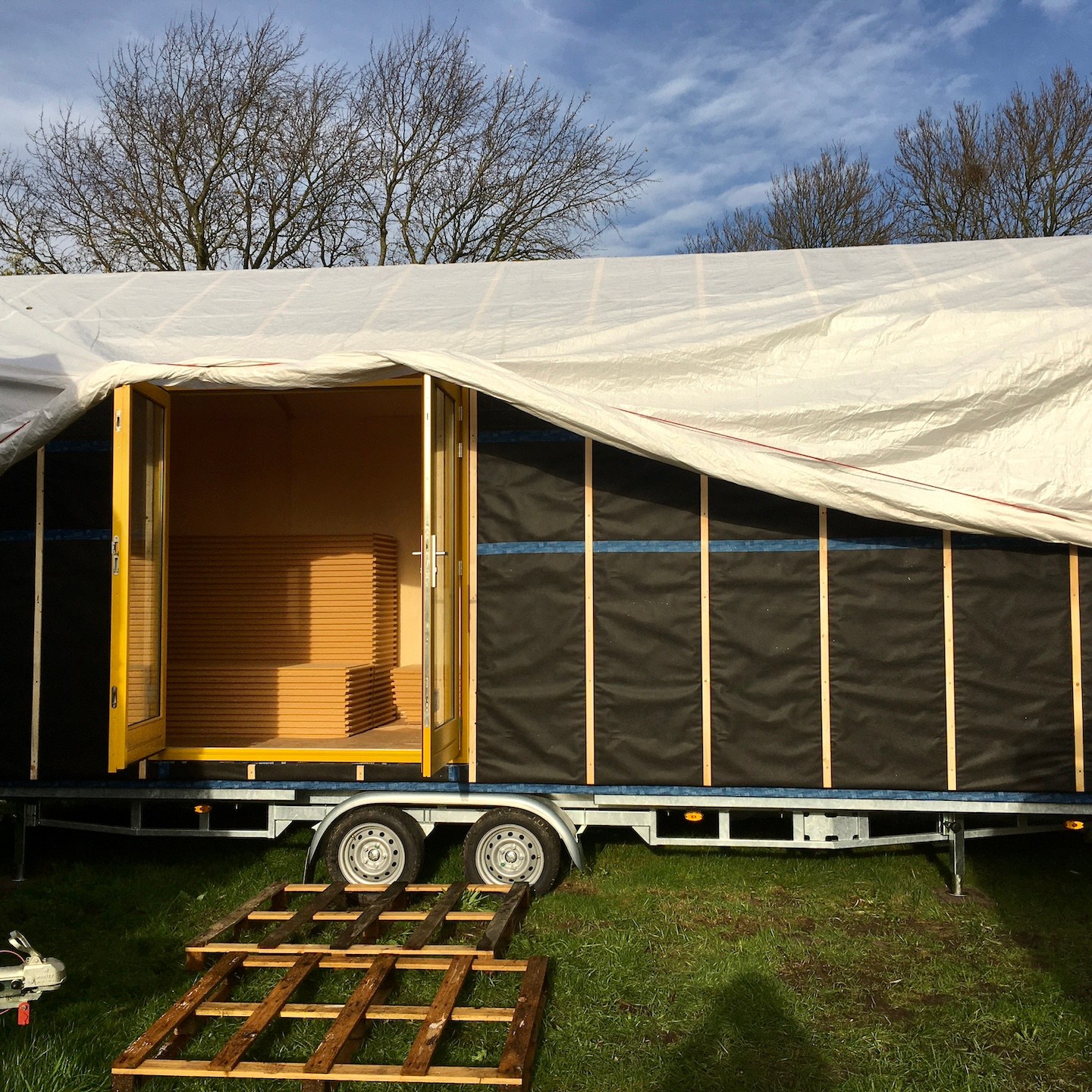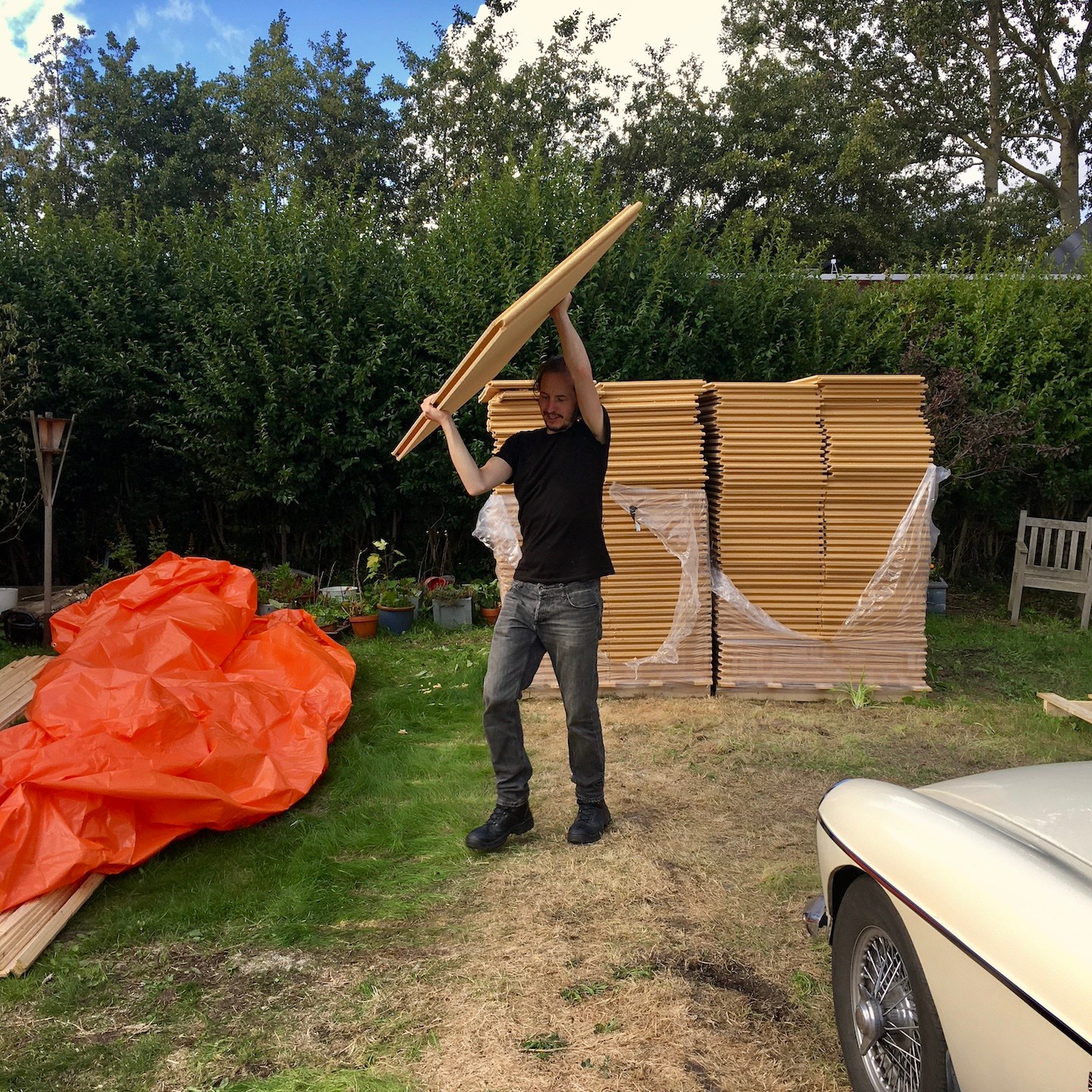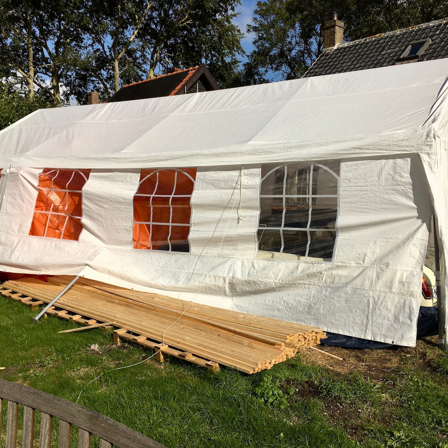 Oohwja, we hadden net de energie slurpende maand september achter de rug. En hoewel oktober echt wel haar best deed om ons op te vrolijken en te verwarmen met een met zonnestralen overgoten eerste ochtend, openbaarde dat zonnige bij aankomst op de kavel ook direct op de eerste dag van de maand al de ravage die zich in de nacht daarvoor had afgespeeld… De tent (waar een groot deel van ons materiaal lag opgeslagen) was een paar meter verschoven en had een aanzienlijk deel van onze buitenisolatieplaten beschadigd. Ach ja, het is wat het is en dat komt vast ook wel weer goed, want er zal met het op maat zagen van die platen, sowieso hier en daar zaagverlies zijn. Het wordt alleen weer wat meer puzzelen straks met de voorbereiding op de montage. Gelukkig houden we van puzzelen, haha(a).