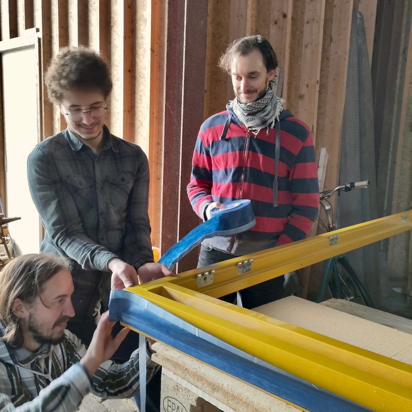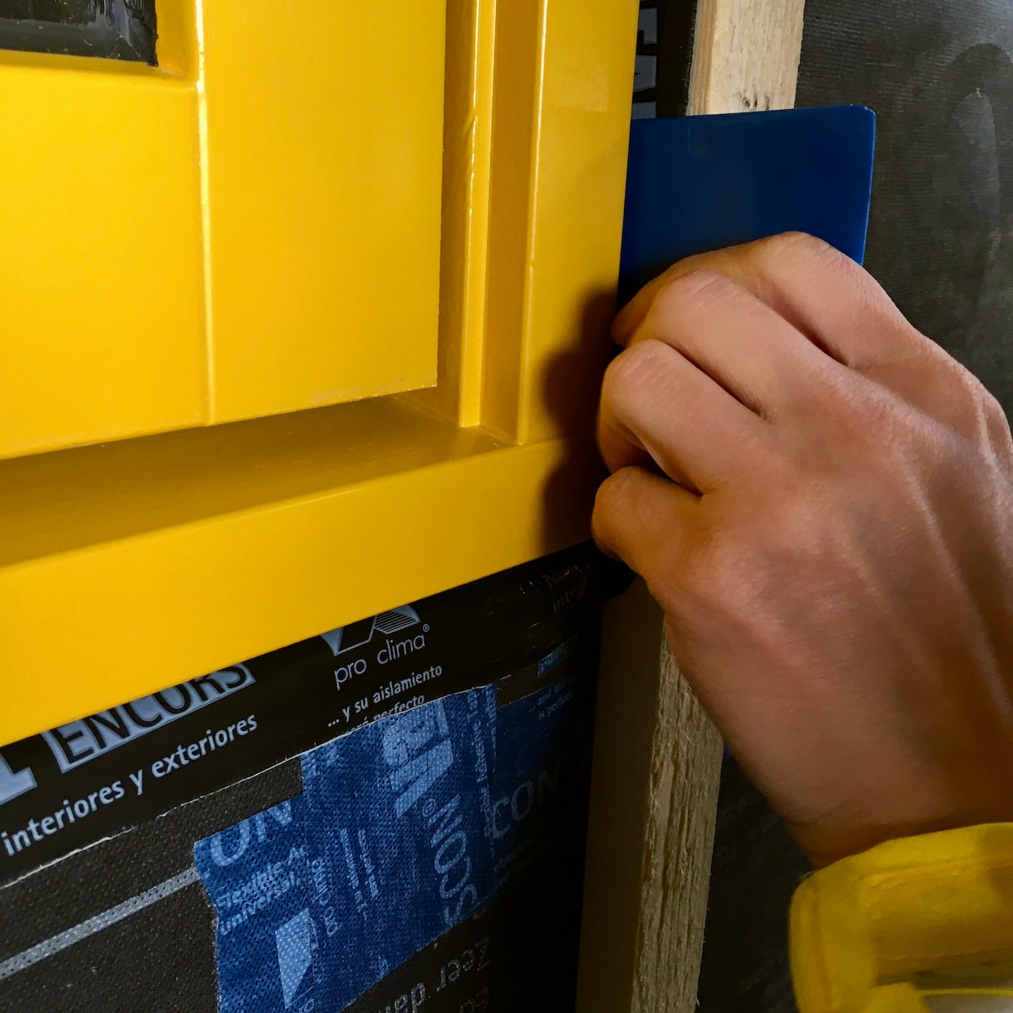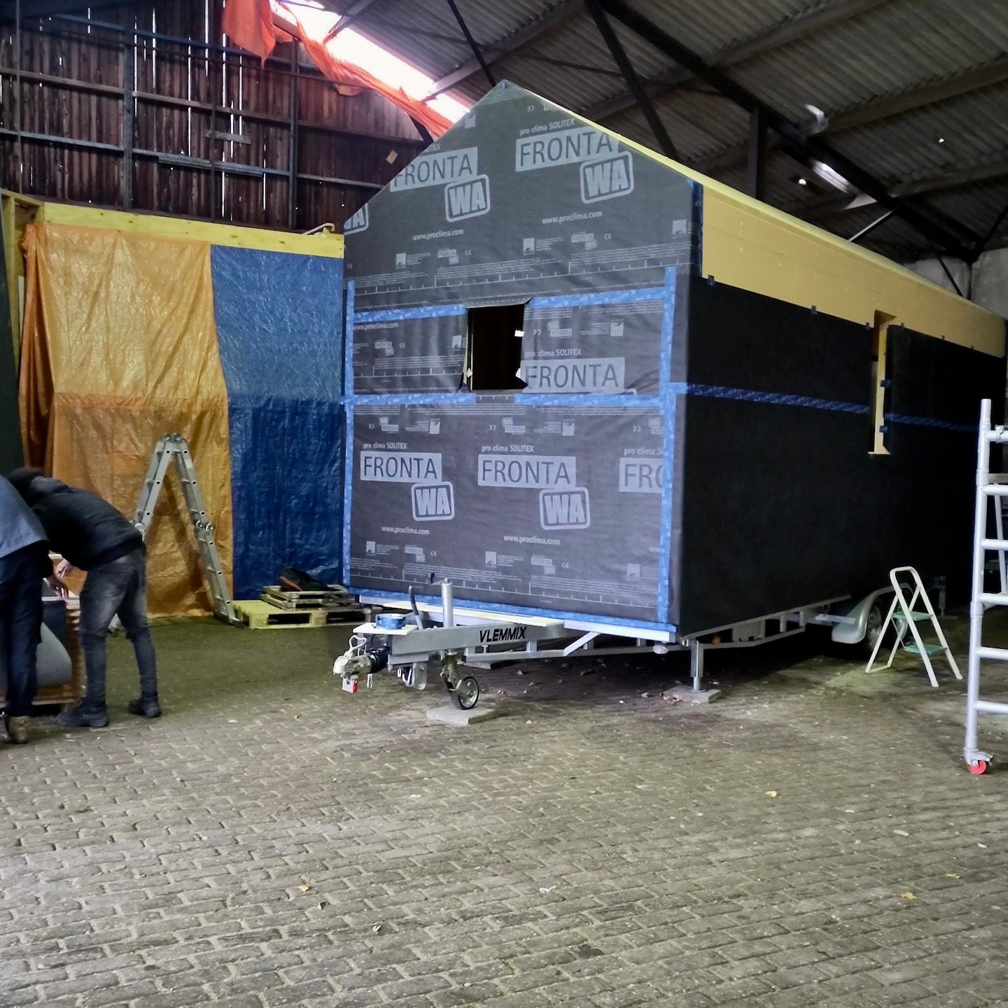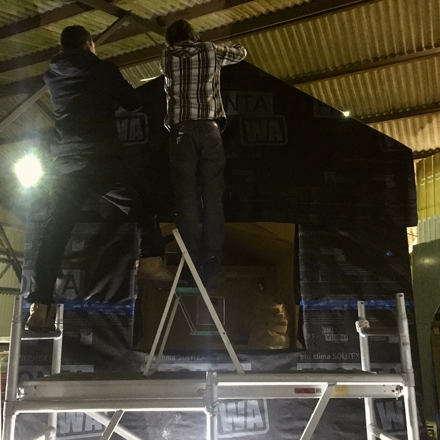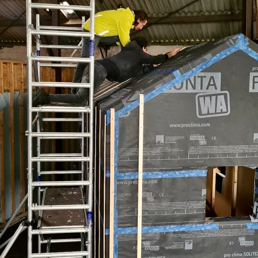 Nadat het huisje volledig was voorzien van een warm dekentje, restte tot slot enkel en alleen nog het aanbrengen van de waterdichte laag, die bij ons bestaat uit verschillende dampfolies (waardoor vocht niet naar binnen, maar wel naar buiten kan) van Pro Clima (Fronta WA, Quattro FB en Mento 3000), verticale regelwerklatten (om de folie vast te zetten en later de buitenafwerking (wat na heel veel contactmomenten eindelijk besteld is en over een paar weken zelfs in Nederland (i.p.v. in Duitsland) afgehaald kan worden) aan te monteren) en tot slot natuurlijk de langverwachte (week 39/40 werd uiteindelijk week 46) kozijnen en ventilatieroosters. De kozijnen waren uiteindelijk gelukkig net op tijd binnen voor ons om mijn huisje waterdicht (oké, de ventilatieroosters van Duco zijn pas net binnen, dus die kunnen we pas dit weekend gaan monteren) af te krijgen vóór de deadline van 27 november en het huisje voor de derde keer alweer te verhuizen naar de kavel (voor nu is Odysseus weer even herenigt met Penelope, maar voor hoelang dat duurt, wie zal het zeggen?). Hier was wel wederom het laten invliegen van een aantal hulptroepen (kozijnen zijn écht enorm zwaar en wat hadden wij zonder Bou de tape-dispenser kunnen beginnen?) voor nodig, evenals het dankbaar meedenken door de eigenaren van de schuur (die onze niet zo “verantwoorde” (ik snap het niet, Marc en Pat staan daar toch helemaal prima boven hun schouders dampfolie op het dak te snijden)) klimconstructies niet meer kon aanzien en besloten had een hogere rolsteiger voor ons op te bouwen (echt super bedankt ook daarvoor, want dat heeft ons enorm veel tijd en risico bespaard. Niet dat we op de hoge rolsteiger altijd even “verantwoord” werkte, haha(a)).