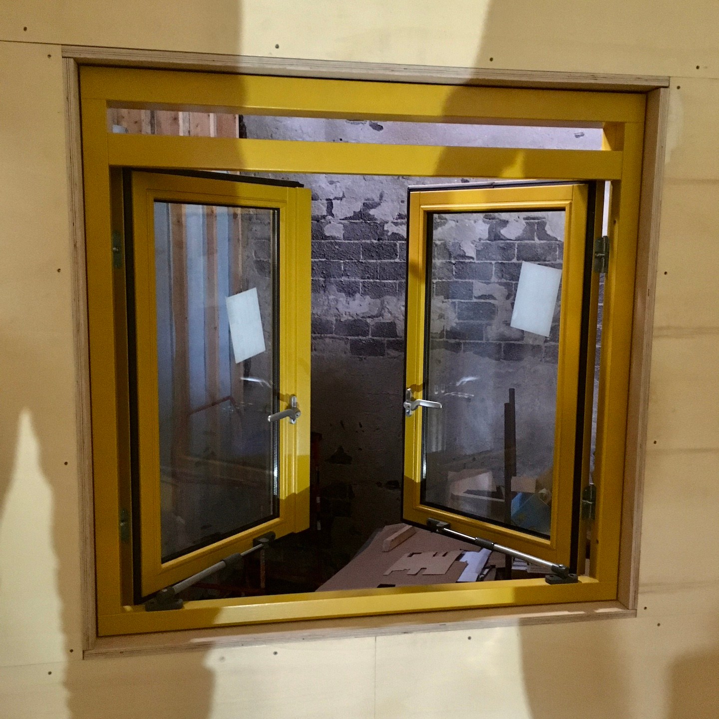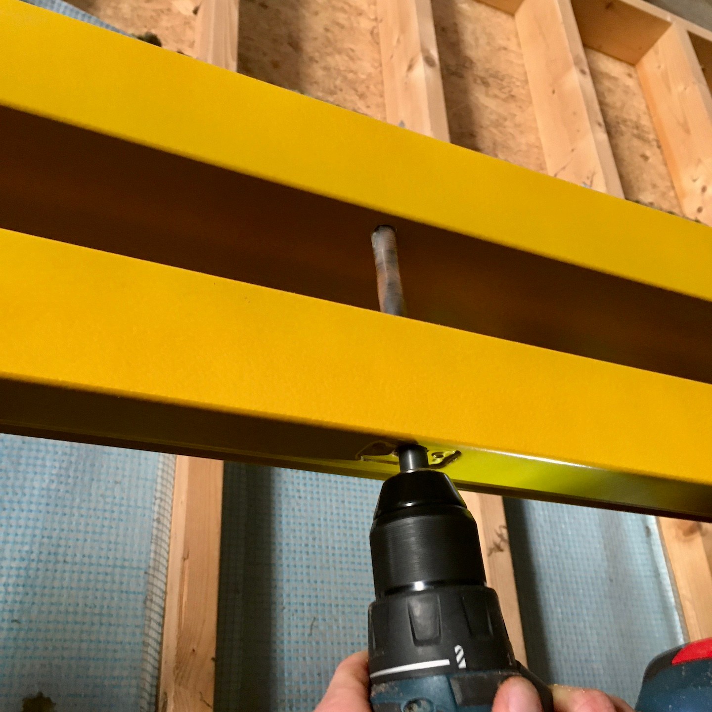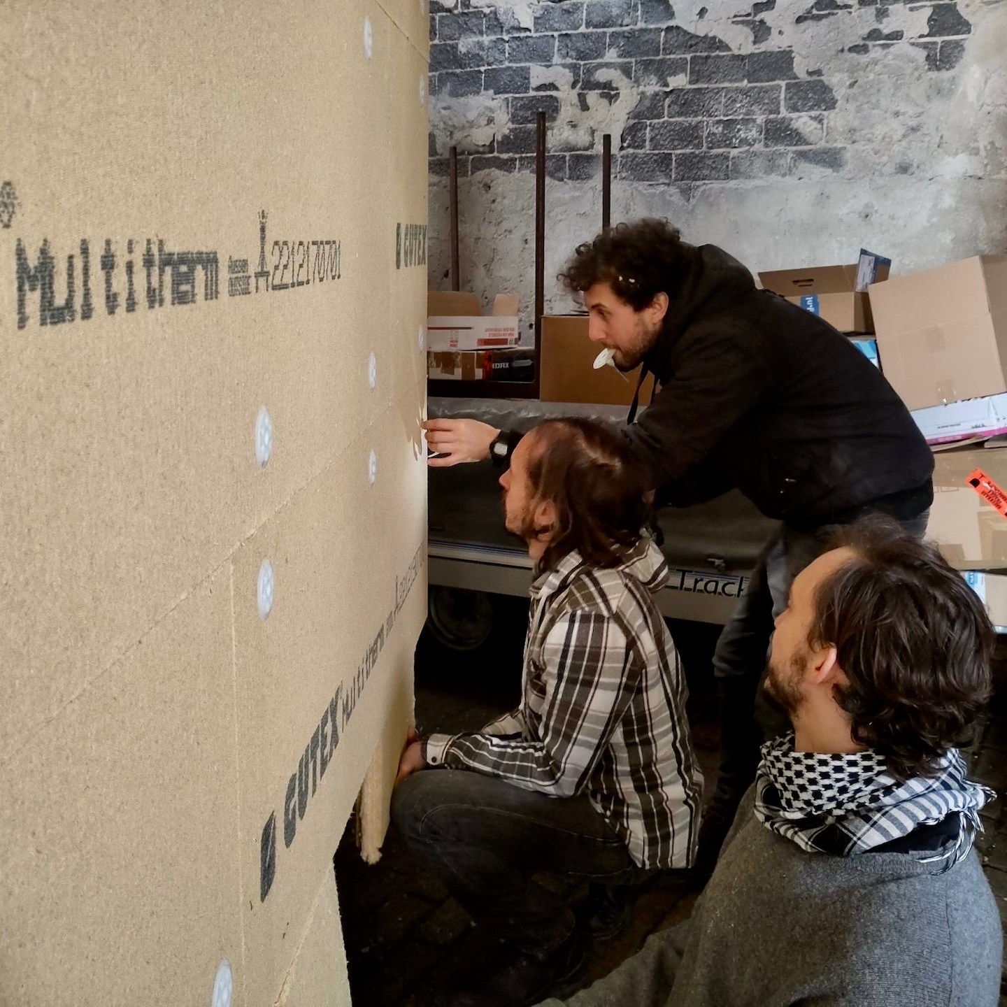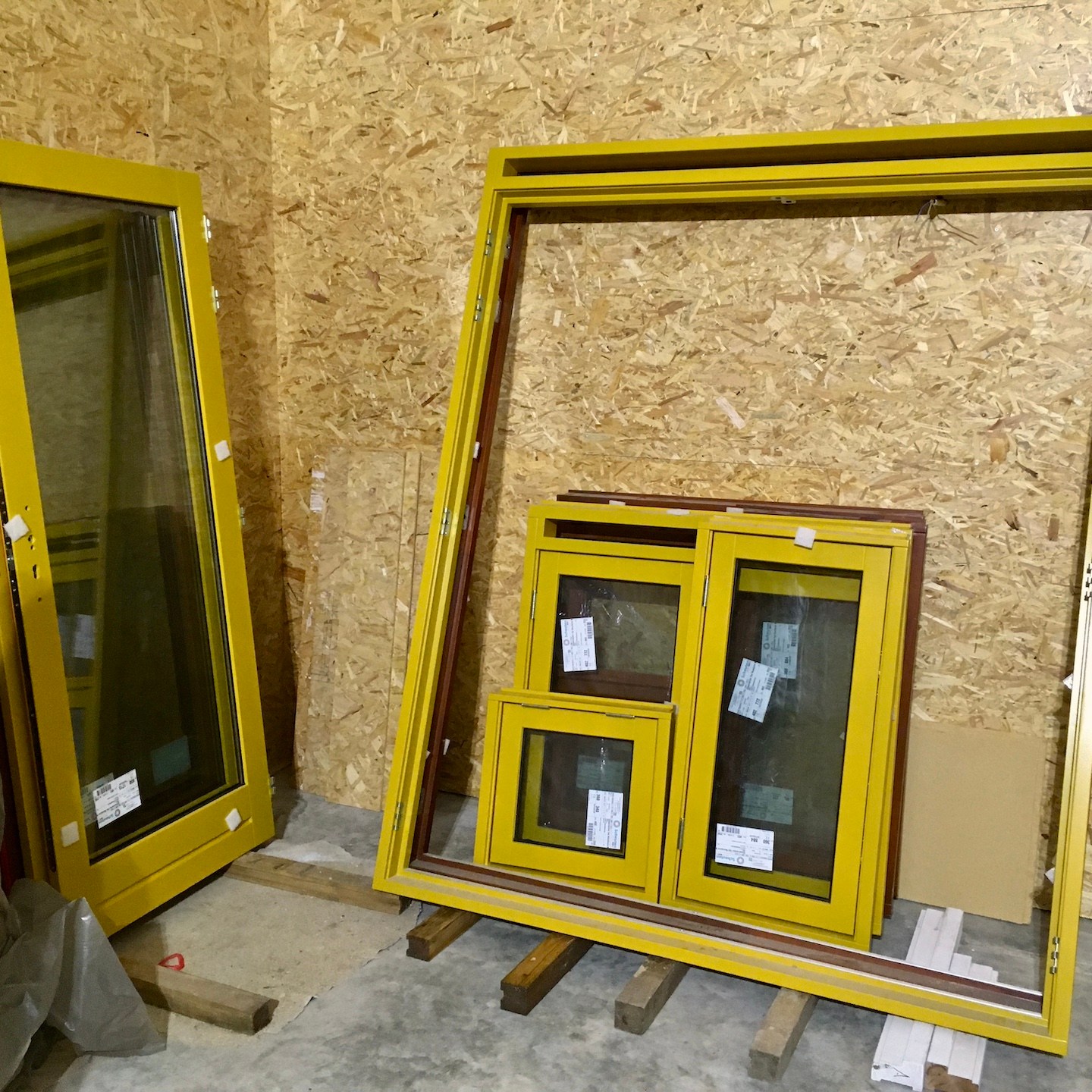 Nadat het huisje volledig was voorzien van een warm dekentje, restte tot slot enkel en alleen nog het aanbrengen van de waterdichte laag, die bij ons bestaat uit verschillende dampfolies (waardoor vocht niet naar binnen, maar wel naar buiten kan) van Pro Clima (Fronta WA, Quattro FB en Mento 3000), verticale regelwerklatten (om de folie vast te zetten en later de buitenafwerking (wat na heel veel contactmomenten eindelijk besteld is en over een paar weken zelfs in Nederland (i.p.v. in Duitsland) afgehaald kan worden) aan te monteren) en tot slot natuurlijk de langverwachte (week 39/40 werd uiteindelijk week 46) kozijnen en ventilatieroosters. De kozijnen waren uiteindelijk gelukkig net op tijd binnen voor ons om mijn huisje waterdicht (oké, de ventilatieroosters van Duco zijn pas net binnen, dus die kunnen we pas dit weekend gaan monteren) af te krijgen vóór de deadline van 27 november en het huisje voor de derde keer alweer te verhuizen naar de kavel (voor nu is Odysseus weer even herenigt met Penelope, maar voor hoelang dat duurt, wie zal het zeggen?). Hier was wel wederom het laten invliegen van een aantal hulptroepen (kozijnen zijn écht enorm zwaar en wat hadden wij zonder Bou de tape-dispenser kunnen beginnen?) voor nodig, evenals het dankbaar meedenken door de eigenaren van de schuur (die onze niet zo “verantwoorde” (ik snap het niet, Marc en Pat staan daar toch helemaal prima boven hun schouders dampfolie op het dak te snijden)) klimconstructies niet meer kon aanzien en besloten had een hogere rolsteiger voor ons op te bouwen (echt super bedankt ook daarvoor, want dat heeft ons enorm veel tijd en risico bespaard. Niet dat we op de hoge rolsteiger altijd even “verantwoord” werkte, haha(a)).