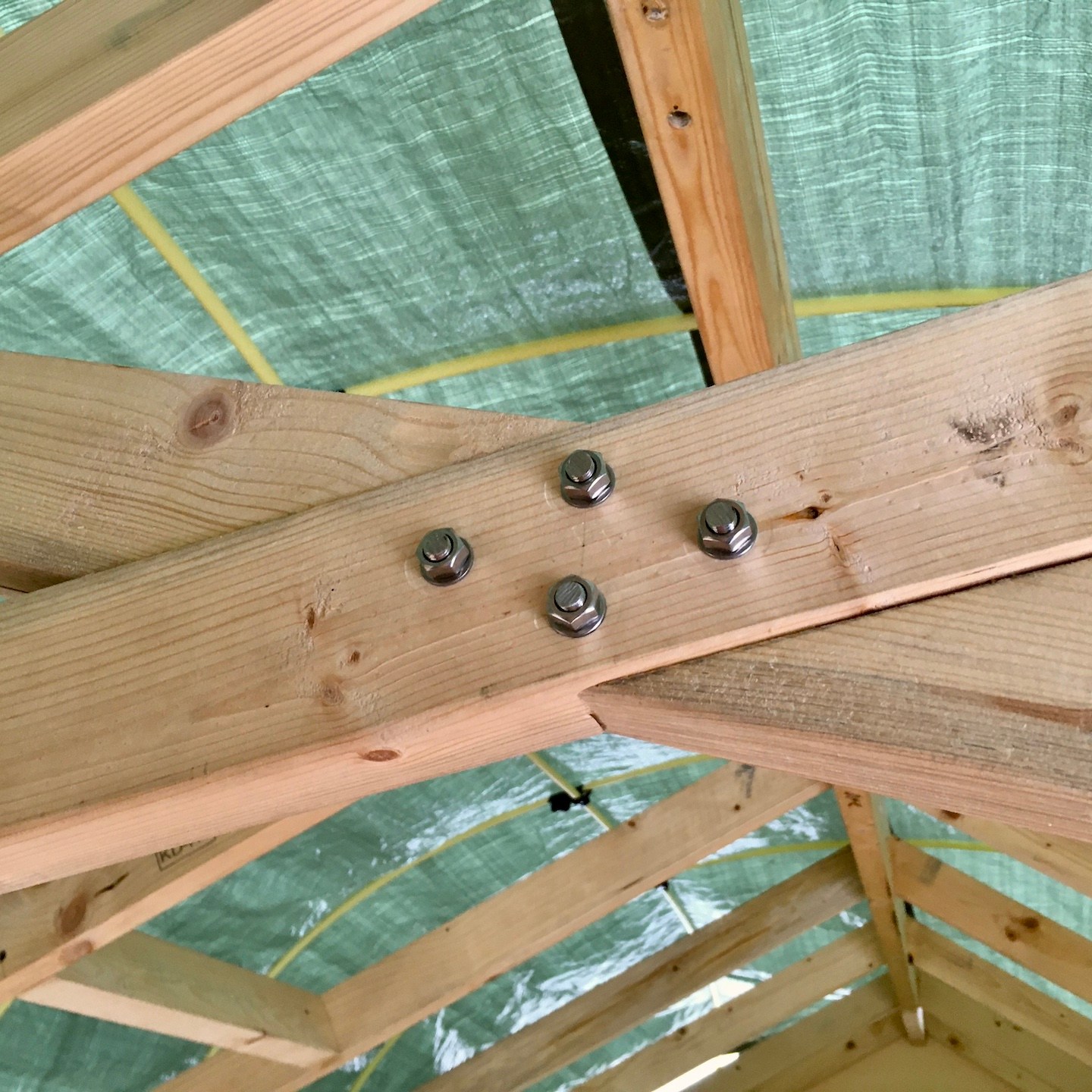 Allereerst hebben wij dan ook de beide huisjes (nog voor het compleet verplaatsen en veiligstellen van alle materialen) kunnen voorzien van de spanten (zelf zijn we onder andere heel erg tevreden met de kruisverbinding en de daarbij horende draadstaal/moeren-combinatie dat in de kruisverbinding zit) en hebben wij de schoorsteenbalkjes kunnen plaatsen, waarmee wij nu (voorlopig) alle constructieve balken (in totaal (voor beide huisjes dus) 346 balken) verwerkt hebben, jeej. Daarnaast konden we bij mijn huisje eindelijk aan de slag met alle plafondplaten, wat hier en daar een enorm gepuzzel was, zeker rondom de spanten.