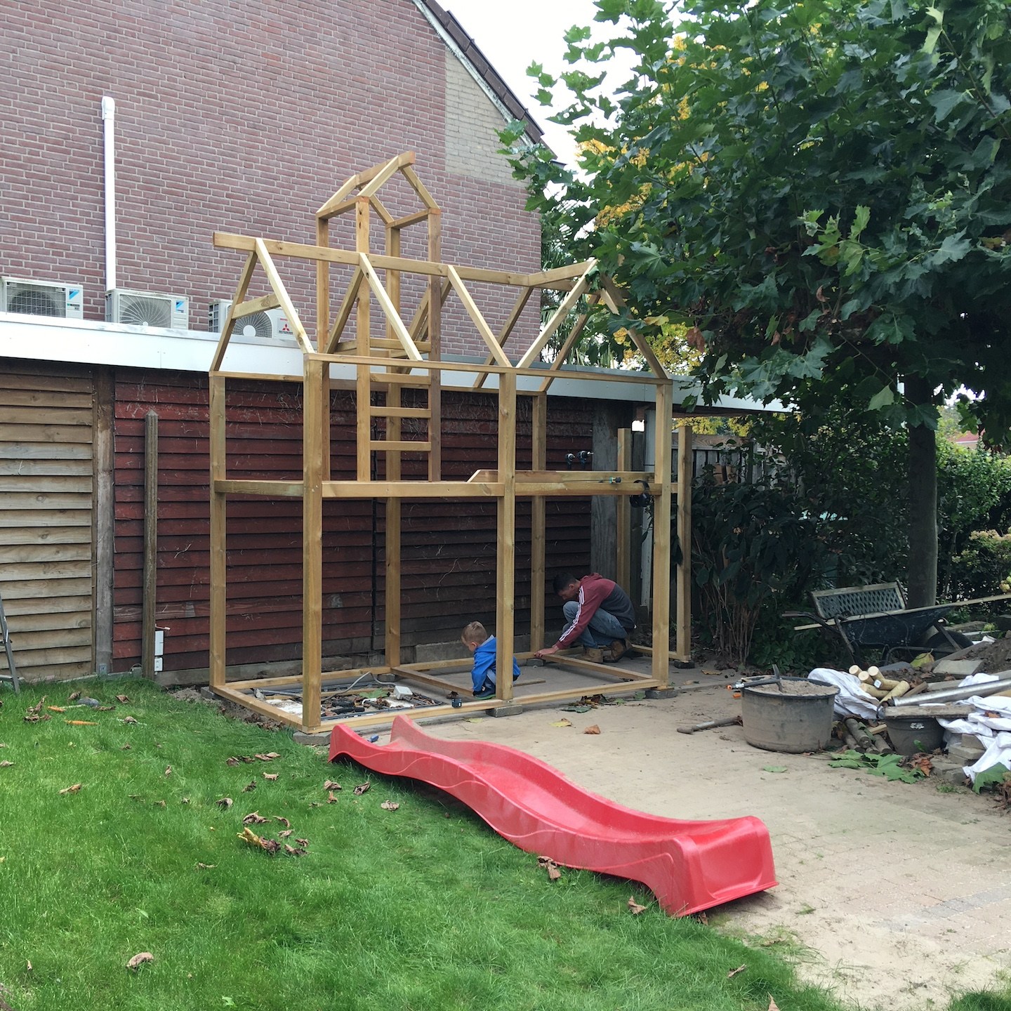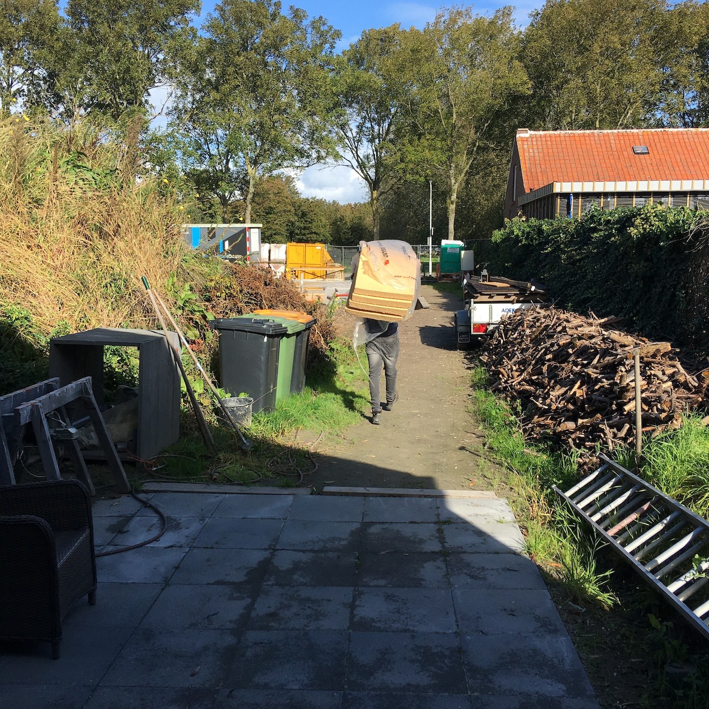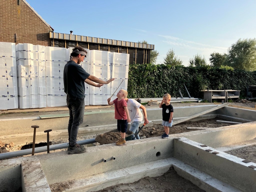 Waar waren we gebleven…oohw ja, nadat wij aan het einde van september een paar dagen in het verre oosten van het land bij hem hadden geklust, kwam Marc aan het begin van oktober op zijn beurt juist weer naar het uiterste westen van Nederland om hier te helpen met het verder weggraven van de plaatselijke Haamse Heuvelrug en het opvullen van de fundering van het huis van onze ouders. Nu zou je zomaar kunnen denken dat het wel een klein beetje een slechte deal is voor hem om na zo’n lange reis ook nog eens een paar uur te gaan lopen kruien, maar net als bij de voorstellen van een hoop goden (ik kijk in het bijzonder naar jullie Hera en Zeus) is het de listige schijn die bedriegt en lijkt niets zoals het is, want geloof mij, het is intensiever om deze twee actieve schavuitjes (ik verwijs niet naar Hera en Zeus hier mensen) (en mede doordat zij de gehele autorit hadden liggen slapen) te vermaken dan een paar kuub grond te verplaatsen, haha (a). En geheel in lijn met de eerdergenoemde goden betekende deze al (aghumaghum) geheel “altruïstische” hulp vanuit zijn kant natuurlijk toevallig niet ook nog eens dat ik aan het einde van de dag weer mee kon rijden naar het oosten van het land om daar verder te helpen met het klussen (en spelen, hihi (a)) daar. Nee hoor, de hulp was wederom zeer belangrijk en deze keer zelfs extra welkom, want de volgende dag moesten de bouwvaklui weer verder kunnen gaan met het (voorbereiden op het) deels storten van de vloer.