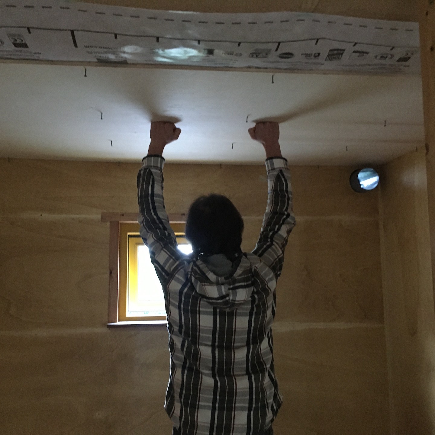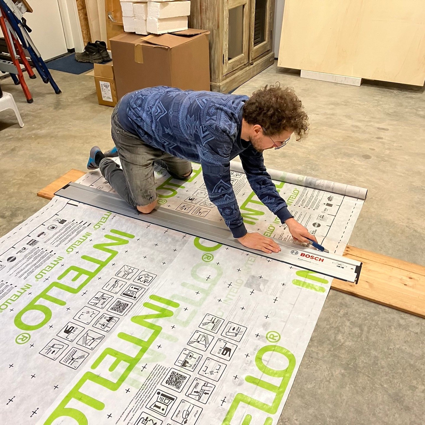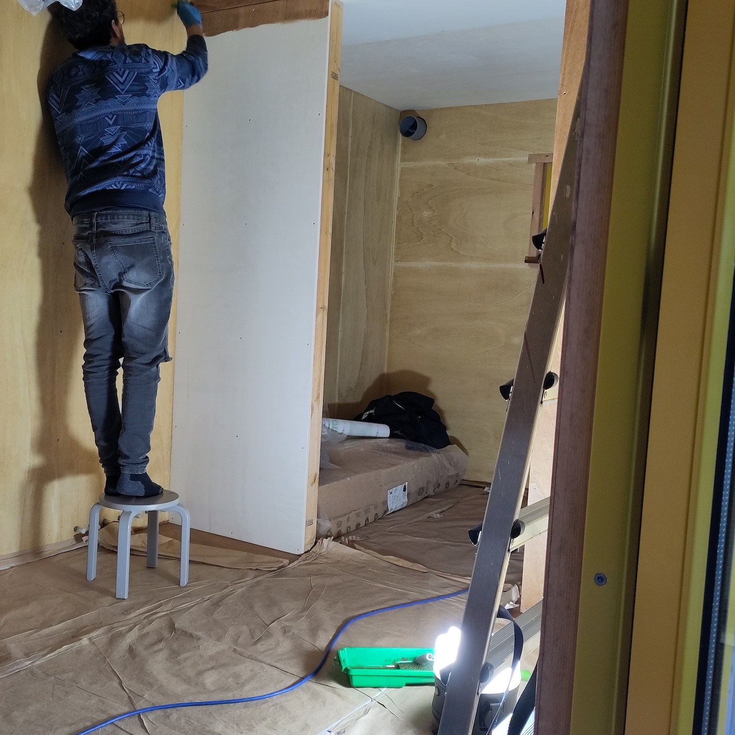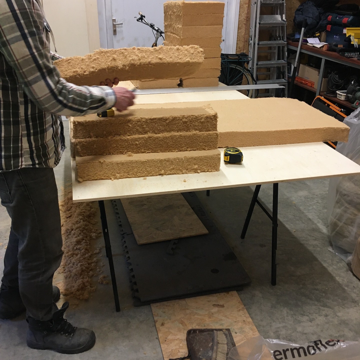 In oktober lukte het verder ook eindelijk om een paar hardnekkige, veel werkgeheugen-innemende knopen door te hakken wat betreft het technische ontwerp van de meterkast en de verdere uitwerking van de infrastructuur door het plafond en de binnenmuren van de badkamer, waarna we haast telepathisch en unaniem besloten om een deel daarvan ook gelijk maar in de praktijk uit te gaan werken (gelukkig waren onze ouders deze periode (goed getimed voor de verandering:p) regelmatig weg met “dé” auto, waardoor de schuur eindelijk ook eens gebruikt kon worden als…uhm…schuur (a) (notitie voor in het retorische bouwdagboek: “het is fijn om genoeg ruimte en goed licht te hebben als je aan het klussen bent”)), voordat onze hoofden weer potentiële bedenkingen en/of andere opties konden gaan opperen, haha (als Mnemosyne (godin van het geheugen) en Hephaistos (god van de smeedkunst en vakmanschap) te lang met elkaar om de tafel blijven zitten, ontstaan de gekste ideeën en potentiële creaties, maar wordt er helaas weinig in de praktijk uitgevoerd…(a)). Dit knopen doorhakken was overigens extra welkom deze maand, want dit betekende dat wij (op een enkele zaagsnede na die ergens later in de praktijk bepaald zal moeten gaan worden) eindelijk klaar waren met alle pluisjes en fluff die het zagen en het verplaatsen van de isolatie met zich meebrengt. En misschien wel belangrijker nog was dat met het verplaatsen van de laatste stukken isolatie naar Patricks tiny huisje mijn tiny huisje eindelijk ontslagen kon worden als veredelde opslagbox en het einde van deze vorm (ja, we hebben met meerdere vormen te maken hier, haha) van Sisyfusarbeid eindelijk in zicht kwam, jeej:) (Pat doet hier en daar overigens ook zijn soort van “yoga-oefeningen” tussendoor, haha, “nog maar heel eventjes volhouden Pat, ik kom je hoogstwaarschijnlijk na deze ene foto zo snel mogelijk helpen:p”).