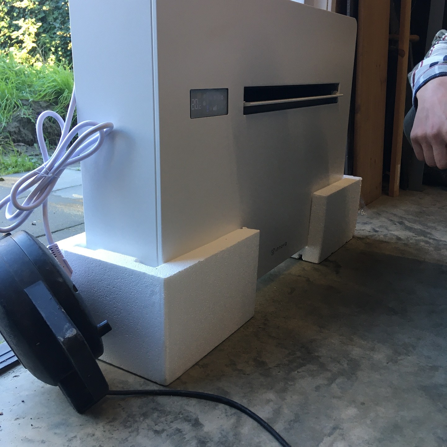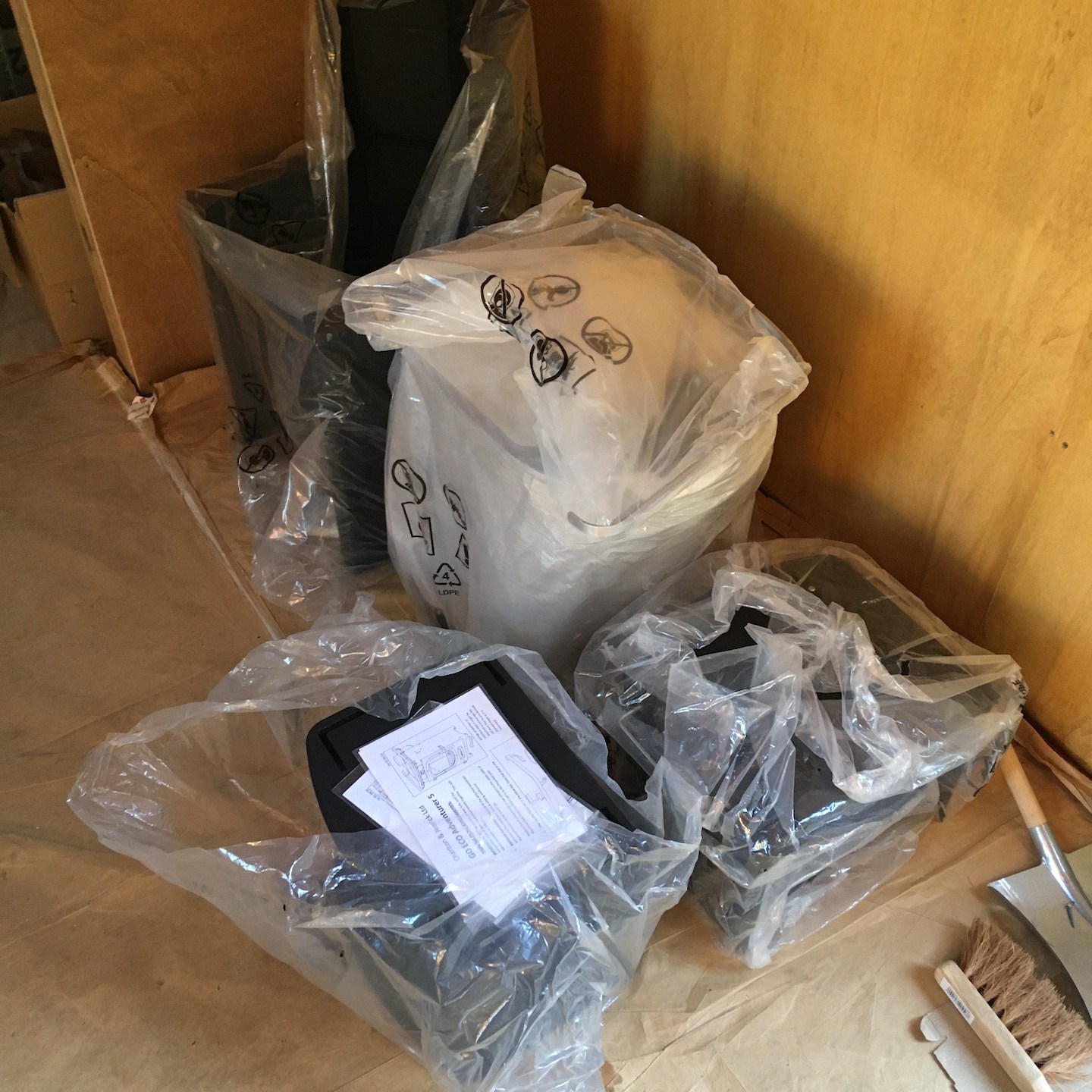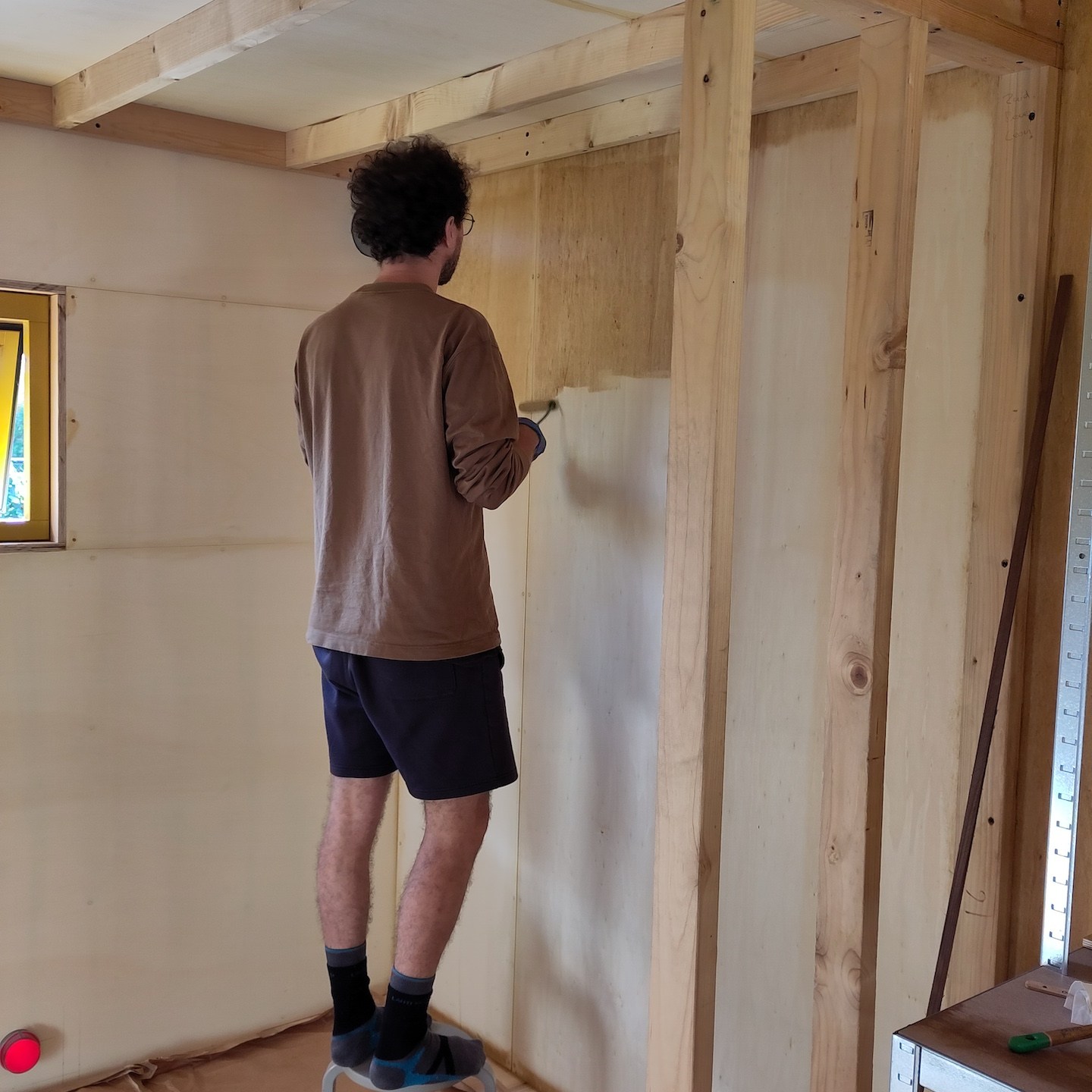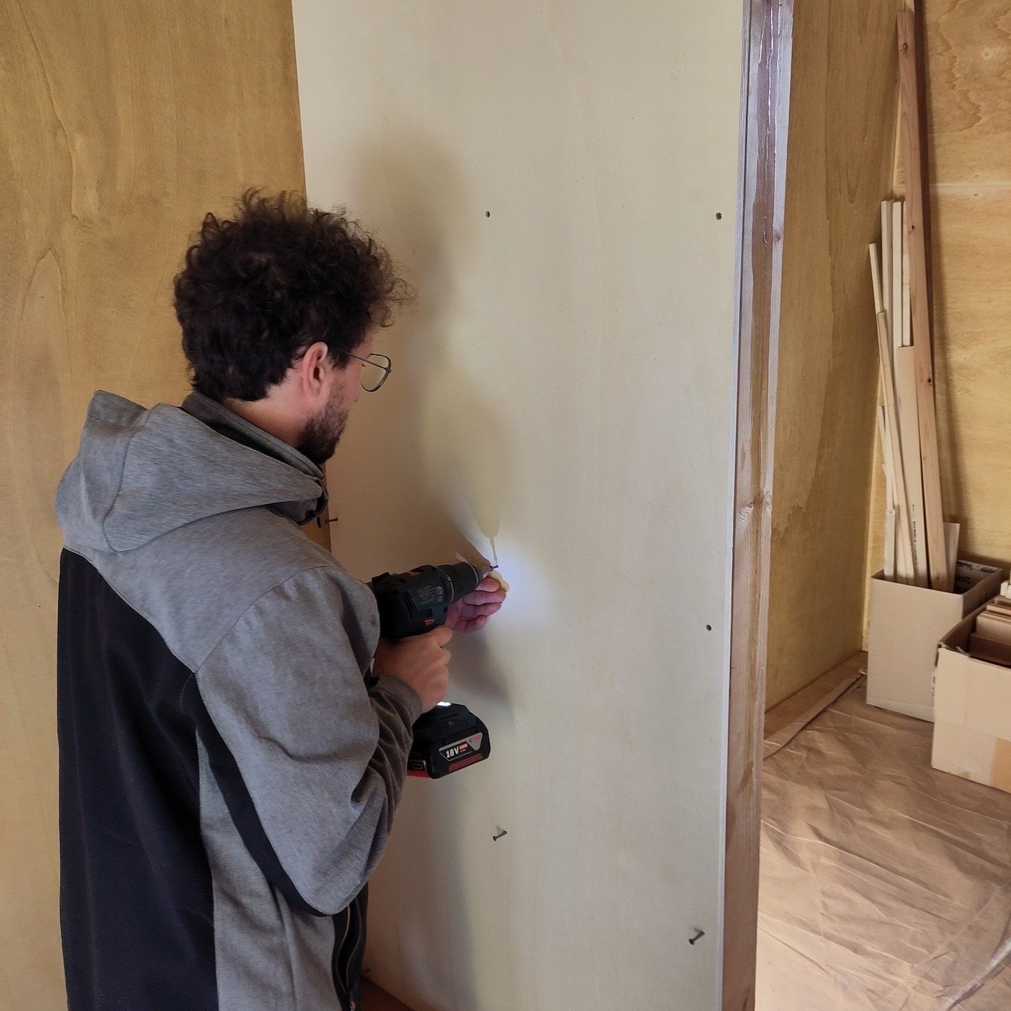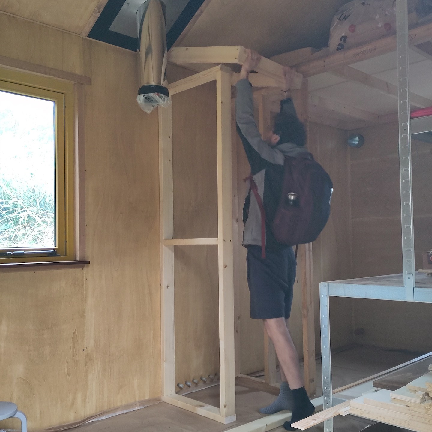 In oktober lukte het verder ook eindelijk om een paar hardnekkige, veel werkgeheugen-innemende knopen door te hakken wat betreft het technische ontwerp van de meterkast en de verdere uitwerking van de infrastructuur door het plafond en de binnenmuren van de badkamer, waarna we haast telepathisch en unaniem besloten om een deel daarvan ook gelijk maar in de praktijk uit te gaan werken (gelukkig waren onze ouders deze periode (goed getimed voor de verandering:p) regelmatig weg met “dé” auto, waardoor de schuur eindelijk ook eens gebruikt kon worden als…uhm…schuur (a) (notitie voor in het retorische bouwdagboek: “het is fijn om genoeg ruimte en goed licht te hebben als je aan het klussen bent”)), voordat onze hoofden weer potentiële bedenkingen en/of andere opties konden gaan opperen, haha (als Mnemosyne (godin van het geheugen) en Hephaistos (god van de smeedkunst en vakmanschap) te lang met elkaar om de tafel blijven zitten, ontstaan de gekste ideeën en potentiële creaties, maar wordt er helaas weinig in de praktijk uitgevoerd…(a)). Dit knopen doorhakken was overigens extra welkom deze maand, want dit betekende dat wij (op een enkele zaagsnede na die ergens later in de praktijk bepaald zal moeten gaan worden) eindelijk klaar waren met alle pluisjes en fluff die het zagen en het verplaatsen van de isolatie met zich meebrengt. En misschien wel belangrijker nog was dat met het verplaatsen van de laatste stukken isolatie naar Patricks tiny huisje mijn tiny huisje eindelijk ontslagen kon worden als veredelde opslagbox en het einde van deze vorm (ja, we hebben met meerdere vormen te maken hier, haha) van Sisyfusarbeid eindelijk in zicht kwam, jeej:) (Pat doet hier en daar overigens ook zijn soort van “yoga-oefeningen” tussendoor, haha, “nog maar heel eventjes volhouden Pat, ik kom je hoogstwaarschijnlijk na deze ene foto zo snel mogelijk helpen:p”).