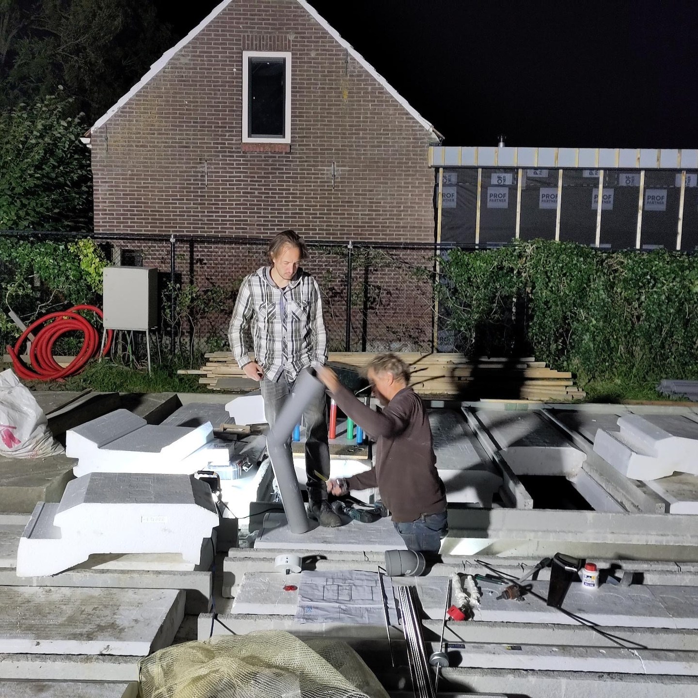 Tijdens het droogproces van het gestorte werk konden wij (ik zeg hier wel “wij”, maar dit waren natuurlijk de achterblijvers die dit deden, want ik was weer enorm “druk” aan het klussen (en hier en daar wellicht een beetje…aghumm…aan het Mario-en met de semi-zieke kids, haha:) – je snapt wel dat dit een deel van de deal was die ik met Marc op voorhand had gemaakt hè :P) in het oosten van het land, waar het speelhuisje tussen de regenbuien door nu ook écht vorm begon te krijgen. Nog “eventjes” geduld kleine boefjes, het huisje is nu “echt” bijna klaar (met het schrijven van deze zin voel ik gelijk Tanja’s semi-cynische blik in de door zweepslagen gekerfde groeven op mijn rug branden…haha – big love Tanja (k))) vervolgens in de avonduren de waterleidingen, rioleringsbuizen en overige onderdelen in de fundering aanleggen, zodat de bouwers zonder enige vertraging een enkele dag later weer verder konden gaan met hun geplande werk. Ze hebben immers voorgesteld om het huis wind/waterdicht te hebben voor de kerst, dus dan moeten wij ook wel ons best doen om hen daarbij in ieder geval niet in de weg te zitten, toch?
