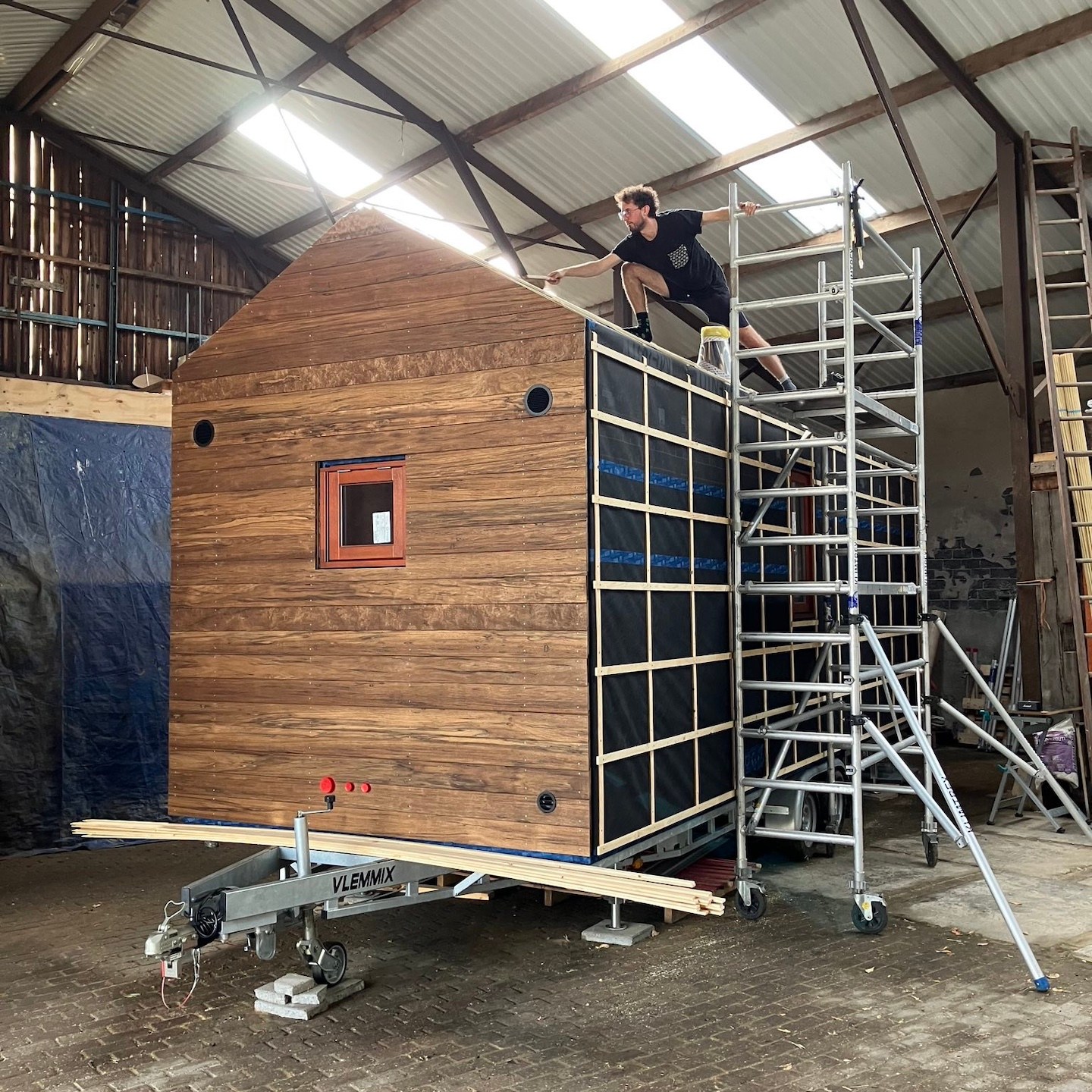 Met al deze deadlines en het vele geravot aan het begin van de maand was het vervolgens wel extra lekker om weer even rustig in mijn eentje (lees vooral: zonder snotterende kiddo’s die continu aan je benen, armen en om je nek hangen, haha) en met wat neoklassieke muziek op de badkamer te oliën:) (je snapt nu ook wel dat het niet voor niets is dat ik al die fysieke en mentale yoga-oefeningen doe tijdens het klussen hè), waarna Pat en ik in het weekend eigenlijk iets te snel maar desalniettemin wel redelijk opgeladen en met verrassend warm en droog weer voor oktober (dankjewel alle bij het weer betrokken goden:)) aan de buitenschil van zijn huisje konden werken. “Kom maar snel onder de trailer vandaan latjes, jullie zijn na al die maanden geduldig wachten in het duister en de kou dan ook eindelijk aan de beurt” (geluiden van latjes die in vreugde uitbarsten – ik ben benieuwd wat mensen denken als ze deze zin lezen, haha – helaas kan ik (nog) niet, á la Ghost in the Shell, (tegelijkertijd) inpluggen bij anderen om de symfonie hiervan te horen…wie weet ooit, wie weet ooit (a)).