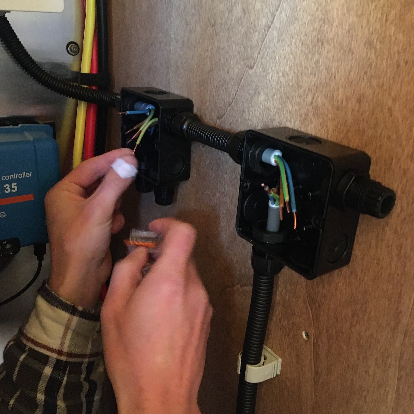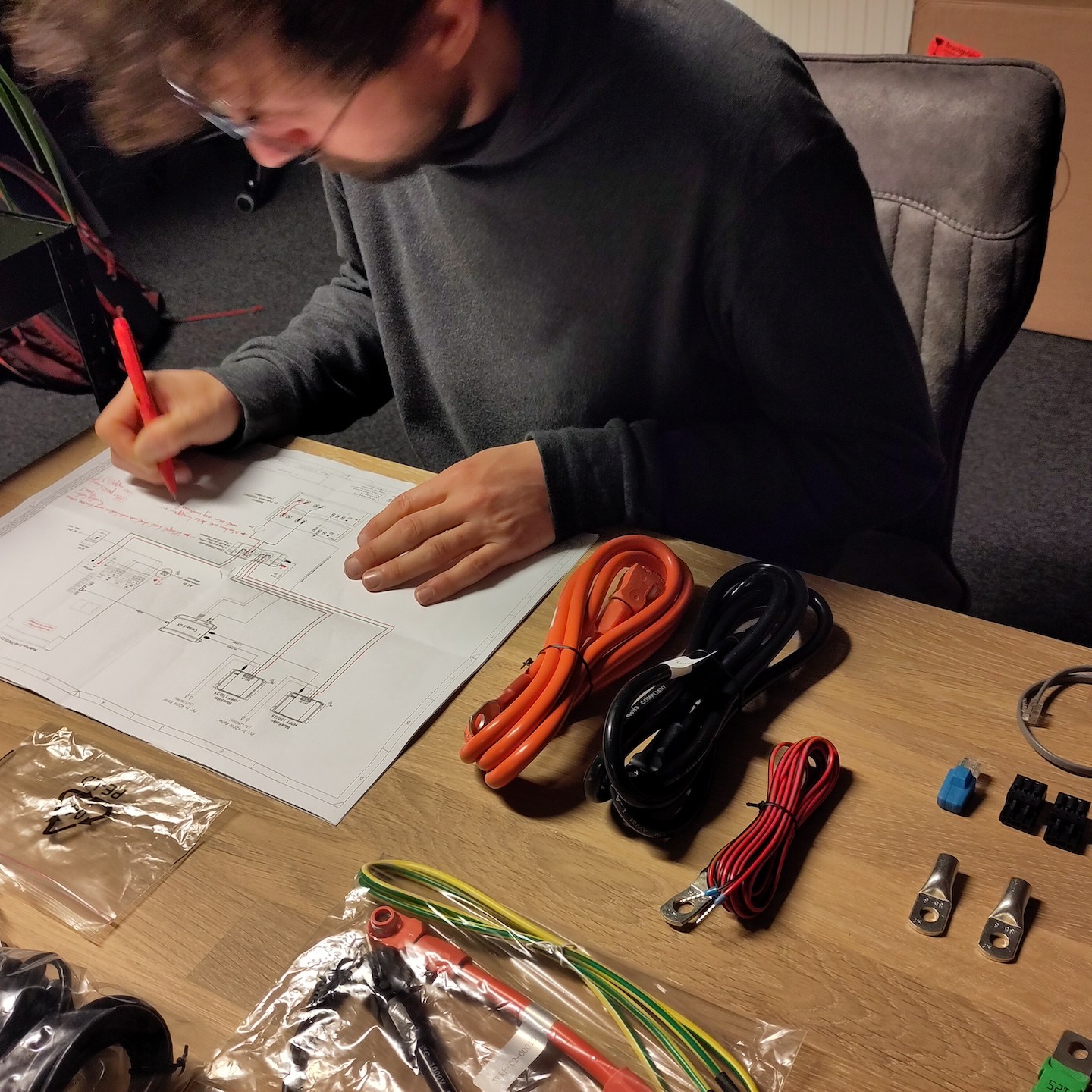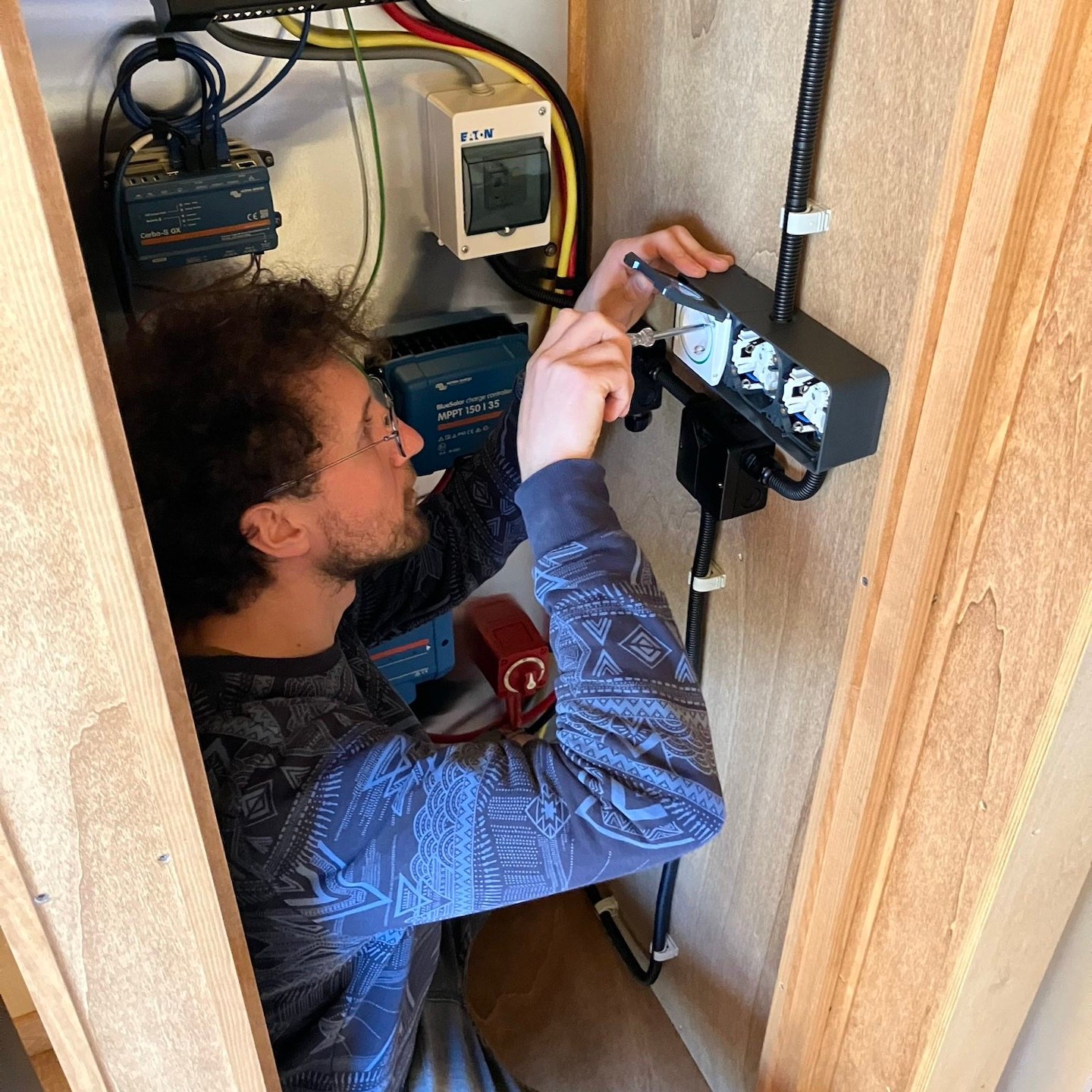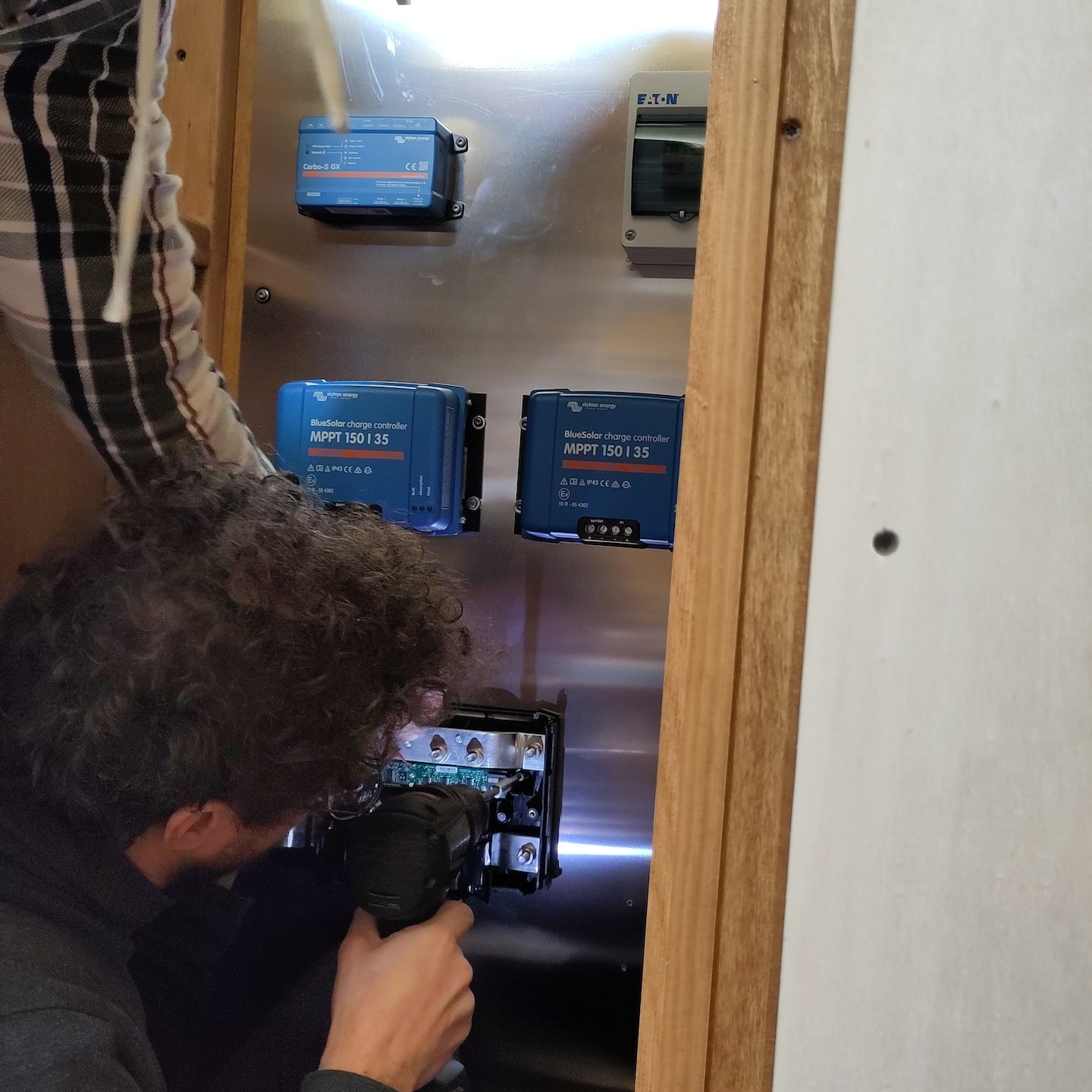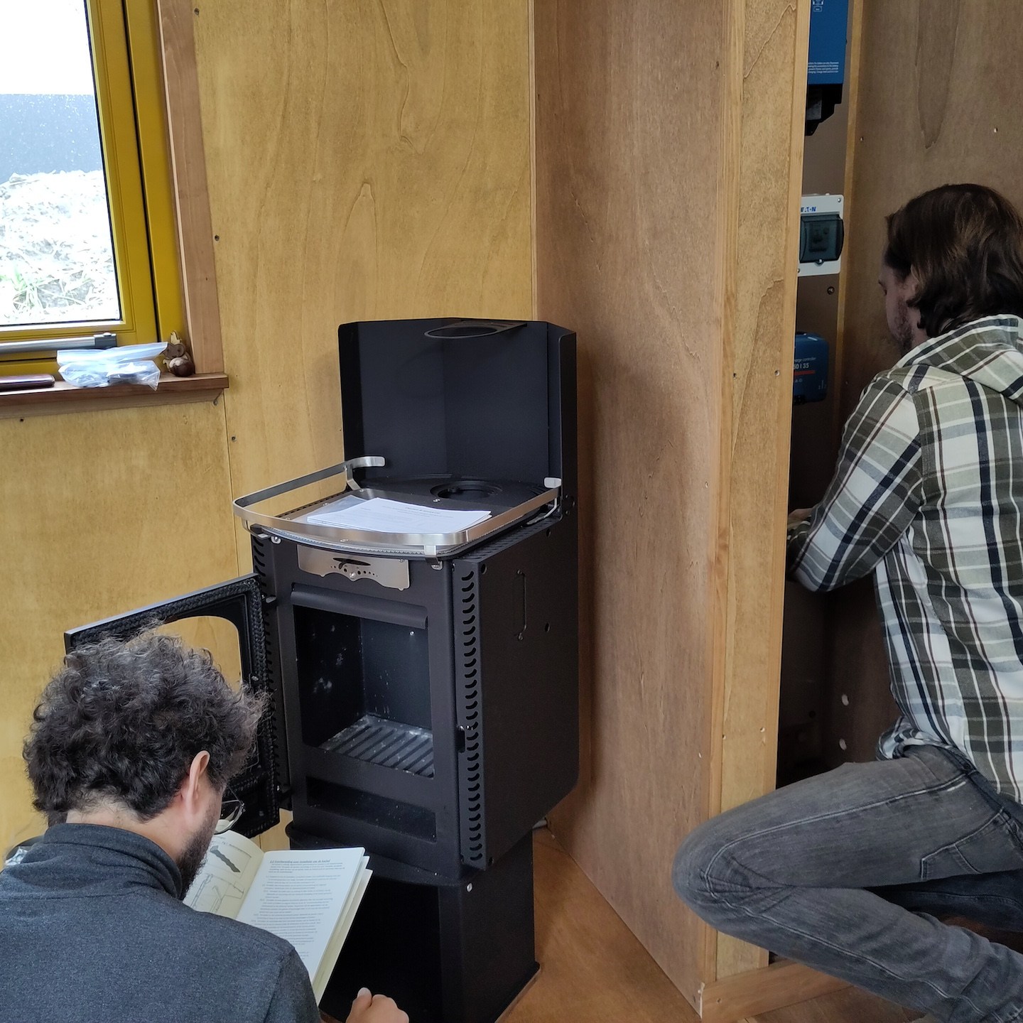 De nieuwe deadline betekende ook dat we als de wiedeweerga verder moesten gaan met het uitdenken en voorbereiden van ons stroomschema en technische hart, want als we niet echt dakloos wilde zijn in december, moest in ieder geval dit deel voor de “verhuizing” geregeld zijn. Gelukkig was TopSystems en in het bijzonder Thijs goed bereikbaar om ons te helpen met de enkele vragen die wij nog hadden, zodat wij tegen het einde van november alvast konden beginnen met het opbouwen van de meterkast en het vastzetten van alle offgrid-hoofdelementen (als je het volledige resultaat van de technische ruimte wilt zien, dan raad ik je aan om vooral een keertje in het echt te komen kijken hier – het voorstel van de vroegboek-tickets voor de “grand tour” staat natuurlijk nog steeds en loopt zelfs op tot helemaal gratis, zelfs als je spontaan op de dag zelf langskomt, hihi(a)).