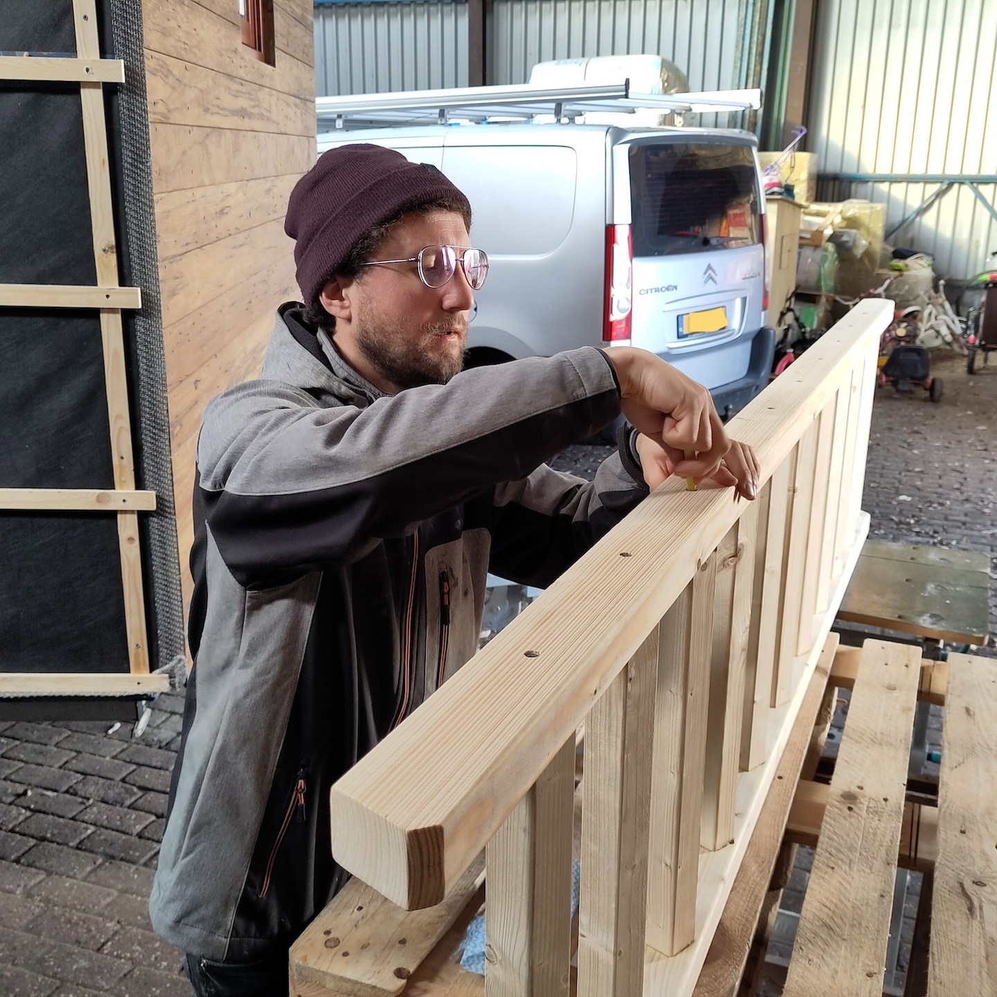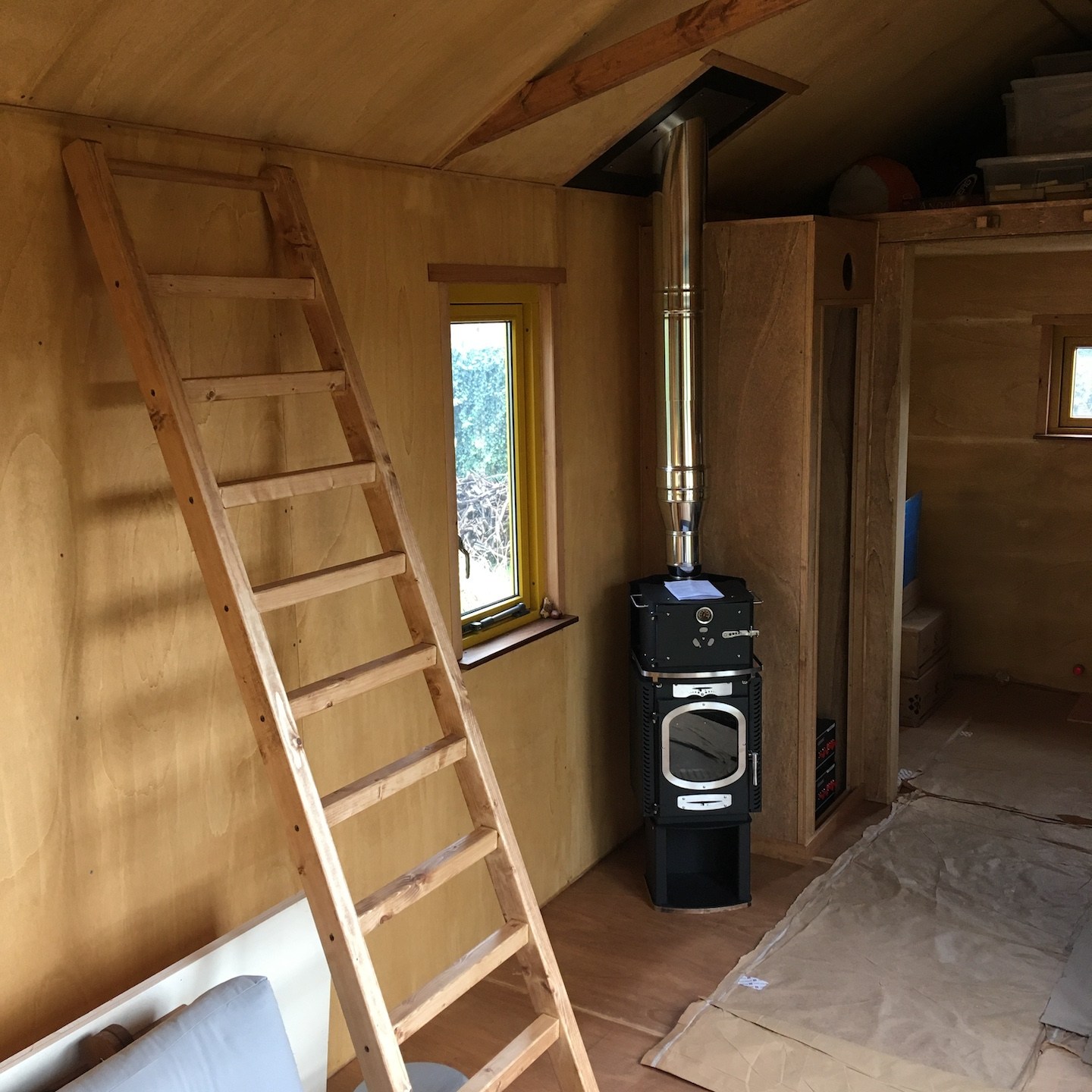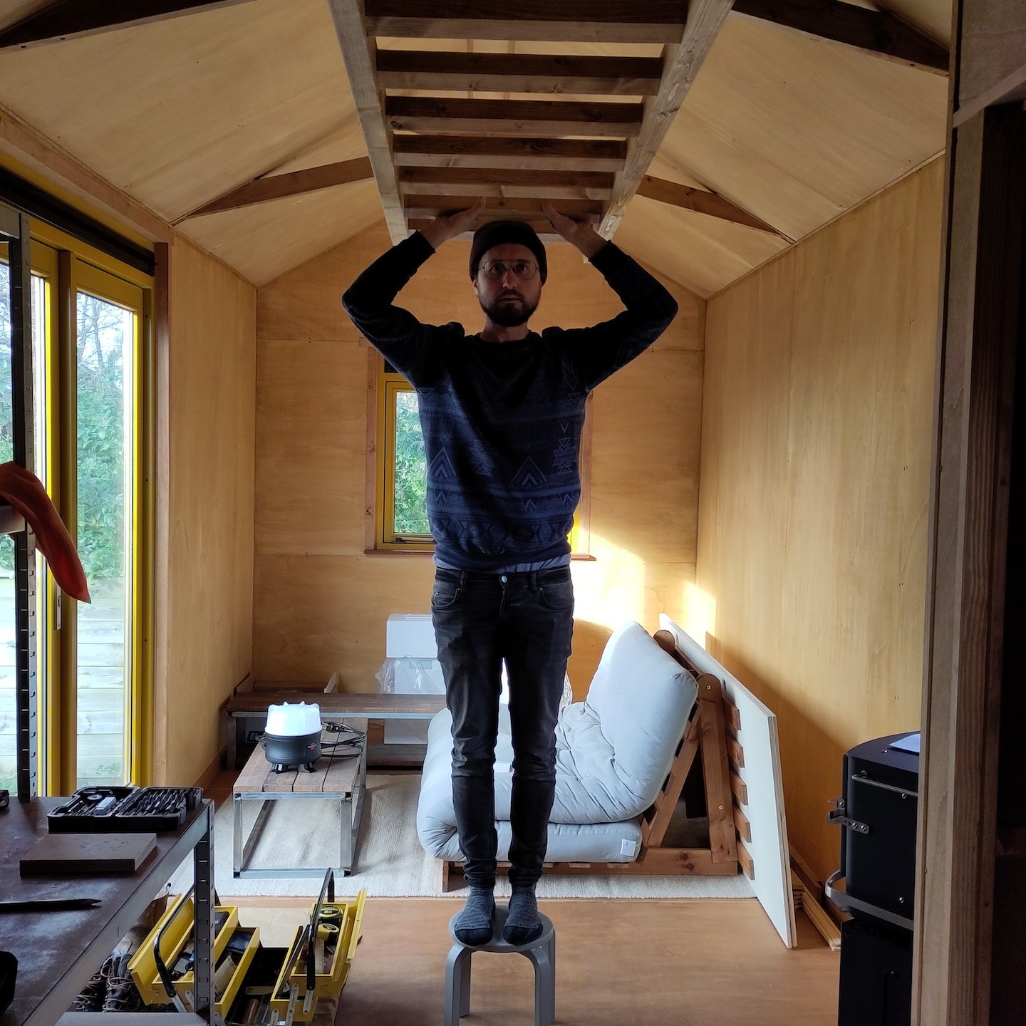 Wanneer ik niet met dergelijke tijdverspillingen bezig was (ik bedoel niet het klussen bij Pats huisje natuurlijk hè:p), kon ik mij in mijn vrije tijd weer meer bezighouden met het ontwerpen en uitwerken van diverse interieuronderdelen van mijn eigen huisje, zoals allereerst de onderplaat voor de houtkachel (waardoor we dit zware onderdeel op een vaste plek stabiel vast kunnen zetten aan de vloer, maar juist ook heel makkelijk weer los kunnen halen wanneer we bijvoorbeeld het huisje gaan verplaatsen) maar daarnaast ook een trap die voor diverse, op dit moment voor jullie nog uiterst geheime(a), doeleinden gebruikt zal gaan worden. En natuurlijk zoals altijd ging het waxoliën ook gewoon door…soms zelfs tot heel laat in de donkere avond, maar wees niet bang, zelfs in deze late nachtelijke uurtjes is het bouwvakkersdecolleté gewoon netjes weggewerkt hoor, haha en kon ik halverwege november alvast een klein beetje demonstreren wat het idee van de trap is (en nee, niet per se voor de work-outs en de gains, wat, nu ik eraan denk, op zich wel een extra positieve bijkomstigheid is – het is altijd tof om een extra functie aan een ding toe te kunnen voegen, zeker in kleine huisjes als deze:)).