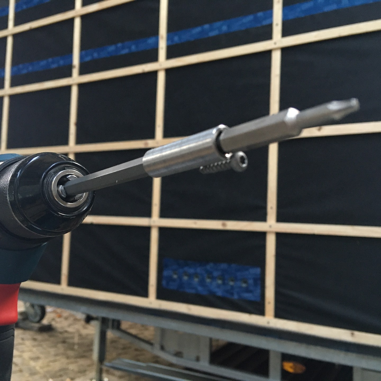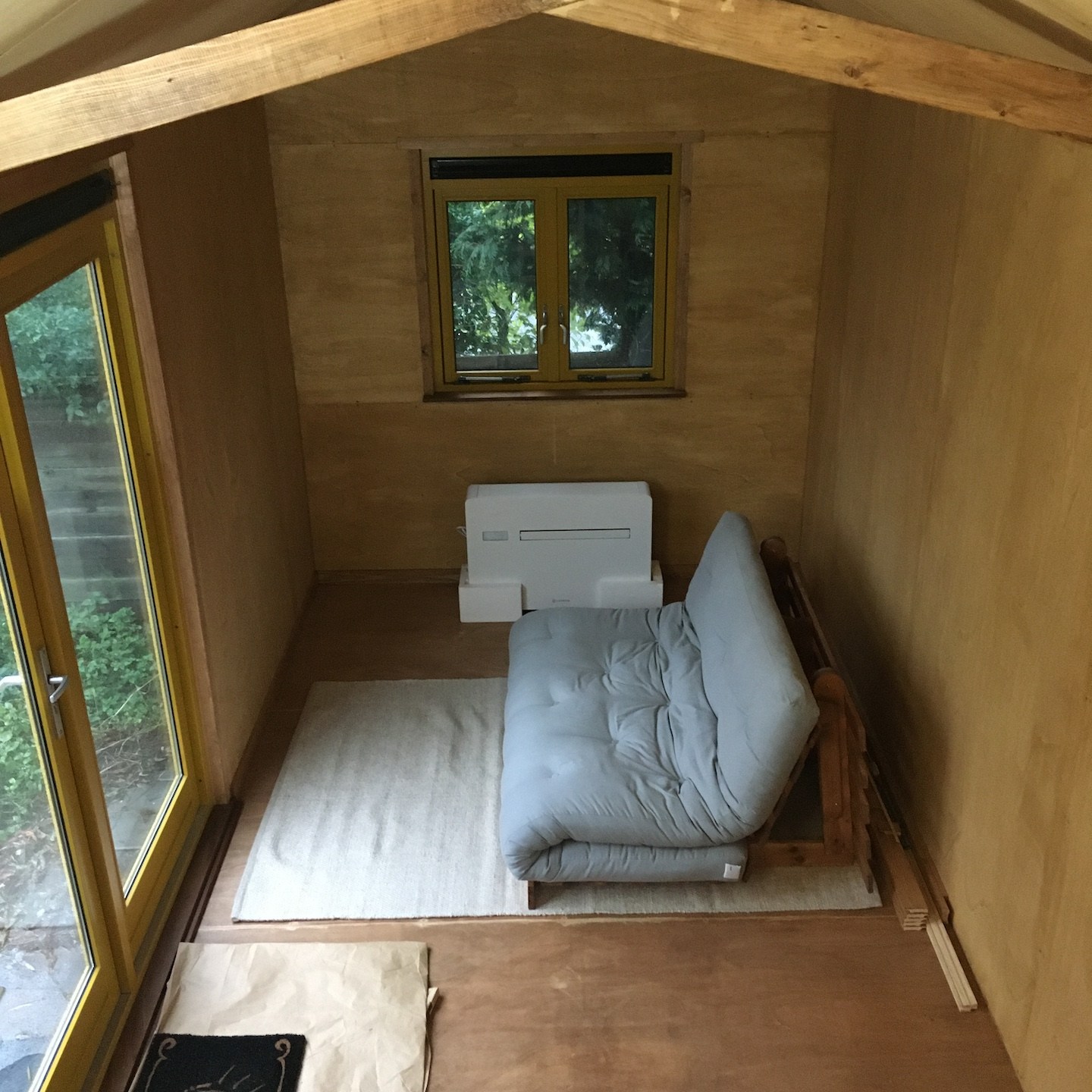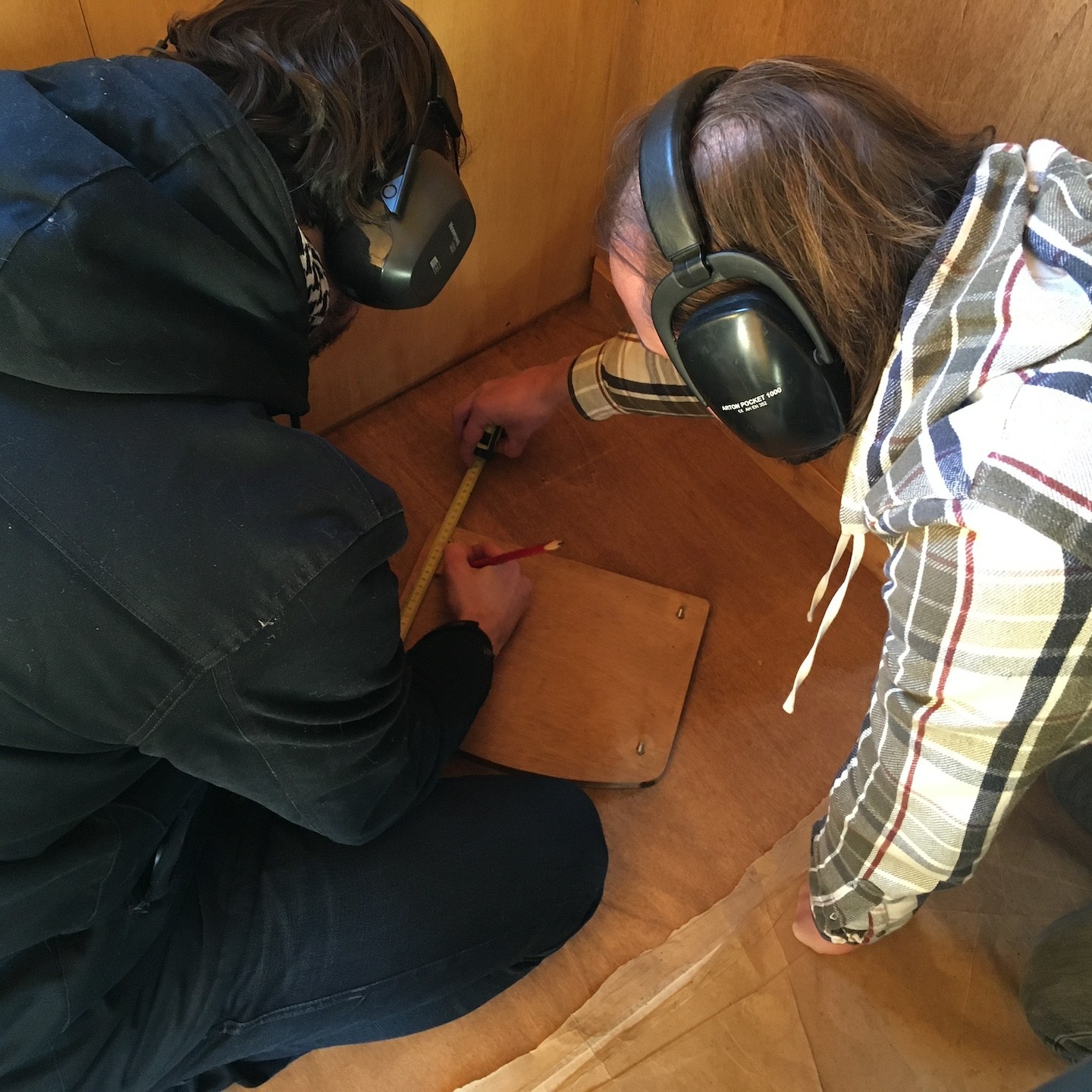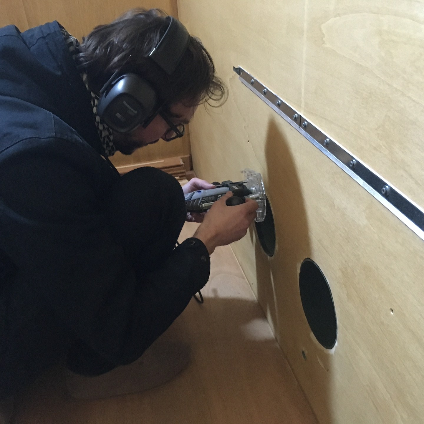 Wanneer ik niet met dergelijke tijdverspillingen bezig was (ik bedoel niet het klussen bij Pats huisje natuurlijk hè:p), kon ik mij in mijn vrije tijd weer meer bezighouden met het ontwerpen en uitwerken van diverse interieuronderdelen van mijn eigen huisje, zoals allereerst de onderplaat voor de houtkachel (waardoor we dit zware onderdeel op een vaste plek stabiel vast kunnen zetten aan de vloer, maar juist ook heel makkelijk weer los kunnen halen wanneer we bijvoorbeeld het huisje gaan verplaatsen) maar daarnaast ook een trap die voor diverse, op dit moment voor jullie nog uiterst geheime(a), doeleinden gebruikt zal gaan worden. En natuurlijk zoals altijd ging het waxoliën ook gewoon door…soms zelfs tot heel laat in de donkere avond, maar wees niet bang, zelfs in deze late nachtelijke uurtjes is het bouwvakkersdecolleté gewoon netjes weggewerkt hoor, haha en kon ik halverwege november alvast een klein beetje demonstreren wat het idee van de trap is (en nee, niet per se voor de work-outs en de gains, wat, nu ik eraan denk, op zich wel een extra positieve bijkomstigheid is – het is altijd tof om een extra functie aan een ding toe te kunnen voegen, zeker in kleine huisjes als deze:)).