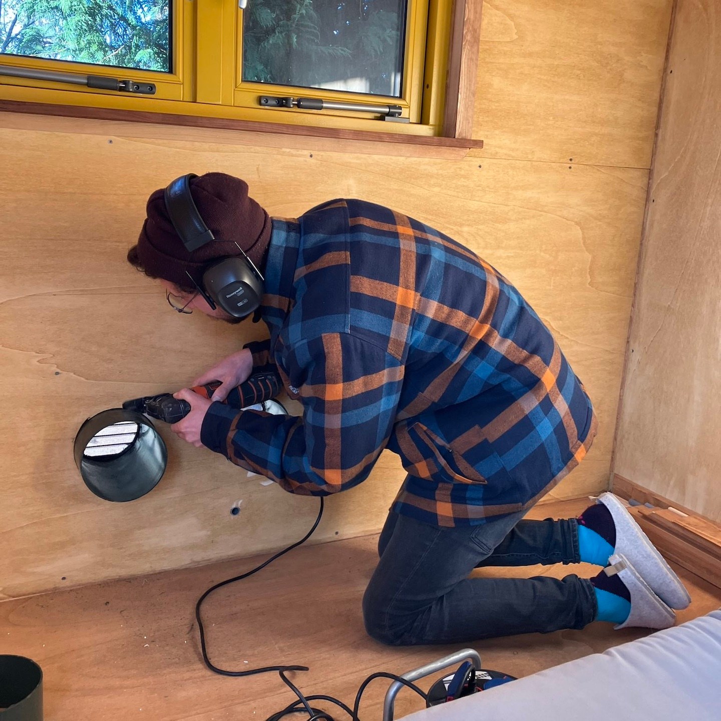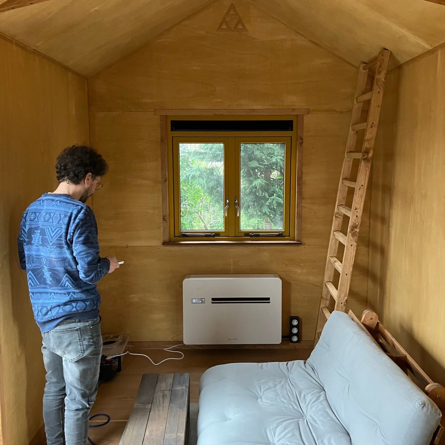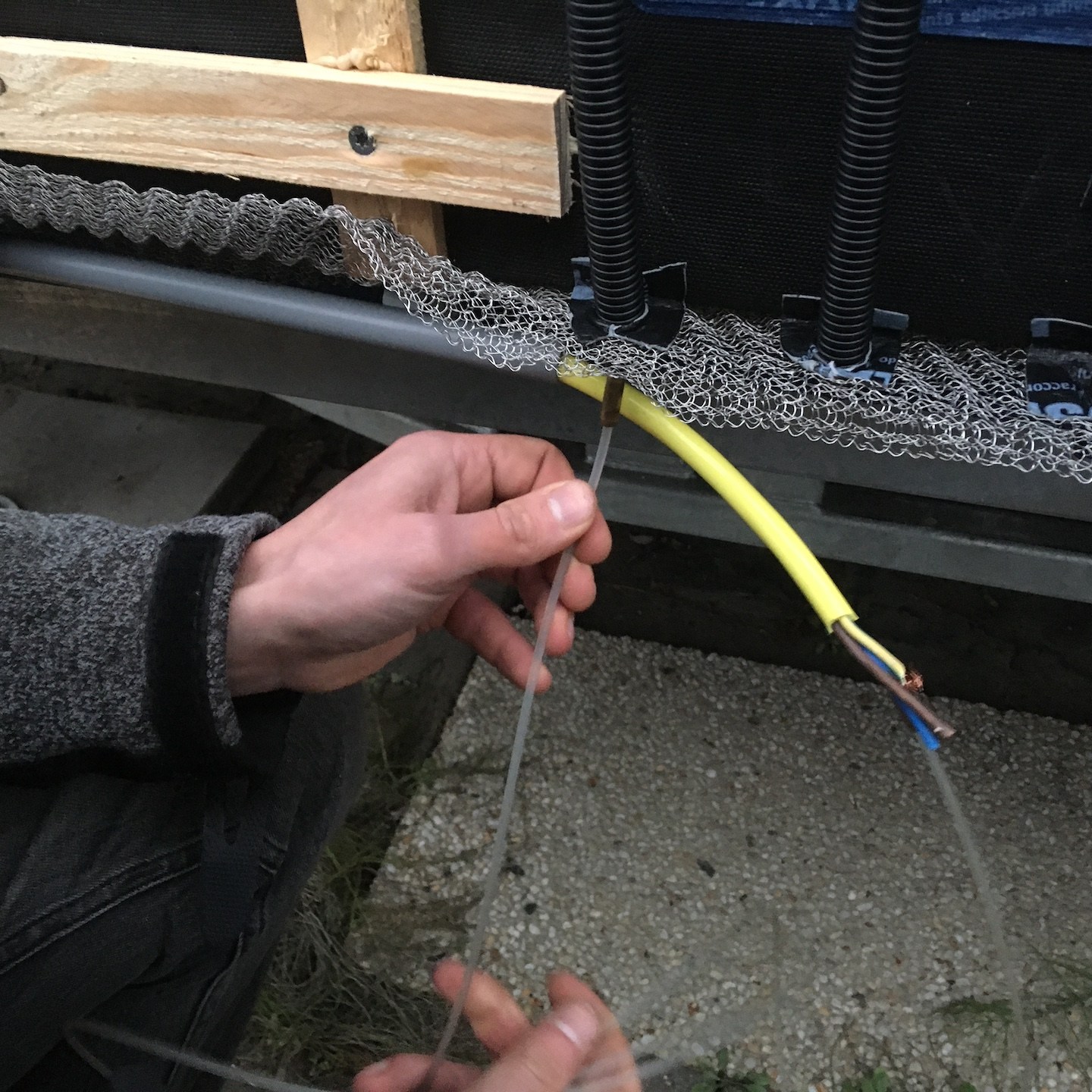 Onze andere broeder van een andere moeder, in de vorm van Bou, kon daar natuurlijk niet op gaan zitten wachten en verraste ons aan het begin van december met een spontaan (klus)bezoek, zodat wij met extra goede moed en energie konden toewerken naar het sneller, zij het basaal, bewoonbaar maken van mijn huisje – alles wel onder strikte vier-ogen-principe natuurlijk hè, want voor je het weet plundert de oude scavenger de voorraaddoos, hihi:p. Nee hoor, Bou was heel goed bezig op de westgevel met het voorbereiden van allerlei zaken voor de warmtepomp, terwijl Pat en ik cardioloog aan het spelen waren bij de beide technische harten van de woning – nog even en Hestia’s (de godin van huis & haard), Calcifers (de vuurgeest in Howl’s Moving Castle van Ghibli Studios) en Salamanda’s (de vuurgeest in Secret of Mana van de Super Nintendo) harten kunnen de warmte voluit rondpompen in mijn huisje (jeeej en bij voorbaat dank alvast alle drie:)), zij het op dit moment nog wel aan het infuus van de walstroom natuurlijk (de zonnepanelen zullen pas later in het proces volgen, zodra het huisje iets meer op een definitievere plek staat…wellicht en hopelijk(a)). Voor het aansluiten van dit infuus, moesten we nog wel wat extra doorvoerzaken regelen aan de buitenkant van mijn huisje, waardoor er helaas weer wat plaatwerk verwijderd moest worden…maar uiteindelijk hebben we alles volgens mij gelukkig heel netjes kunnen wegwerken en afdichten, evenals de condensleiding van de warmtepomp aan de achterkant van de trailer en konden we binnenin de meterkast verder met opereren uhhh nee, spelen, nee wacht, het monteren van de elektrische onderdelen daar (voor de kindertjes thuis, niet altijd met elektra spelen, of beter gezegd eigenlijk (bijna) nooit, hihi, maar soms wel – zeker wanneer de kabeldoosjes heel erg op poppetjes lijken en elkaars “handjes” lijken vast te houden(a)), en is het ons gelukt, ook al was het kielekiele, om op de dag van het verhuizen uit de stacaravan binnenin mijn tiny huisje stroom te hebben en de warmtepomp voor het eerst écht te kunnen draaien:). En extra net op tijd ook, want buiten de stacaravan begint het in de nacht steeds vaker te spoken, haha(a) – de stacaravan ga ik niet missen, maar deze surrealistische taferelen waren wel erg mooi daar:).