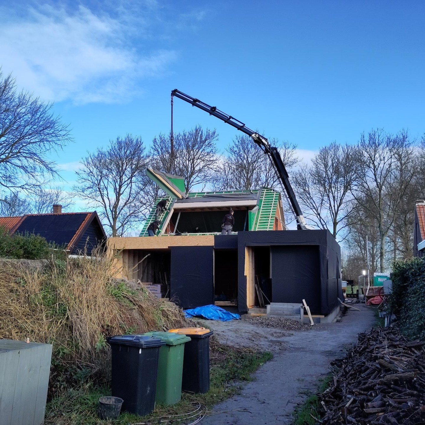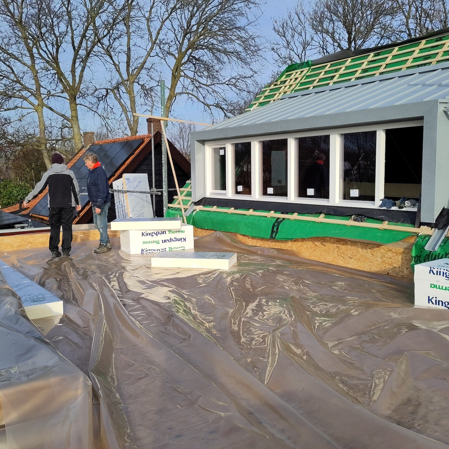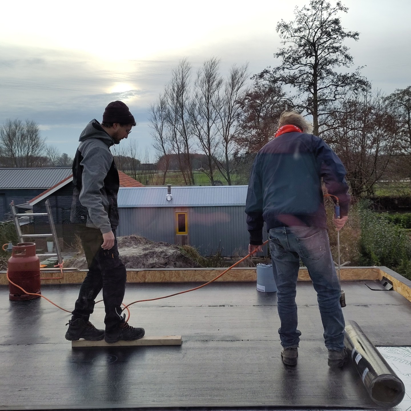 Bij het huis van onze ouders gaan ze trouwens ook hard. Daar plaatsten de bouwvakkers met grof geschut en een groot team eventjes tussendoor het gehele prefab-dak binnen no time. Zodat mama, mijn vader en ik ad hoc de isolatie en de eerste te branden daklaag van het platte dak moesten gaan doen. Wat met de vele regen en de aanhoudende dreigende lucht best stressvol was, want je wilt zo weinig mogelijk water in je dak hebben natuurlijk. Oohw en gelukkig wordt het niet ook super vroeg donker en is het niet behoorlijk koud en winderig in december aan de kust, hah, haha, hahahahaha…ach ja, we hebben het overleefd:), maar het zou wel fijn zijn als mijn vader iets beter wordt in plannen en communiceren en iets minder ervanuit gaat dat alles wel even in een mum van tijd gedaan wordt op het moment dat hij dat ongevraagd wil…