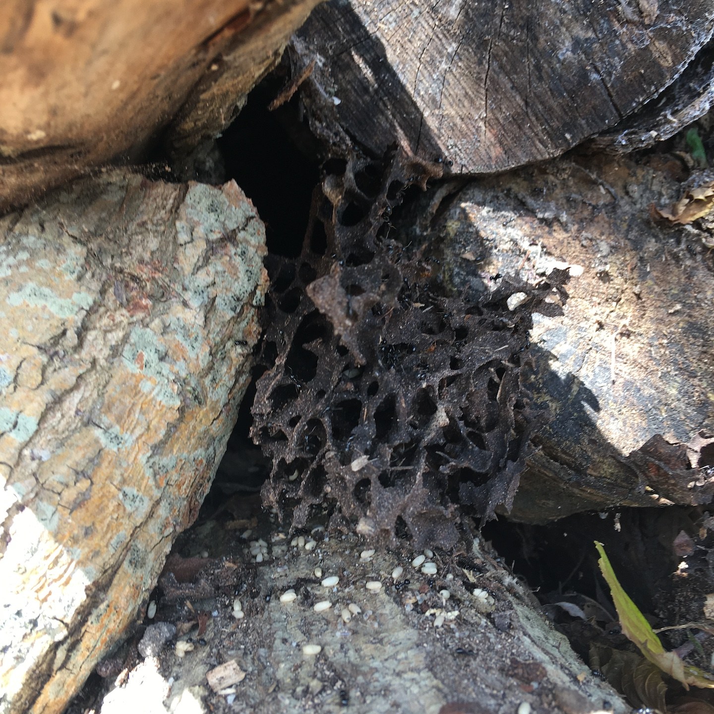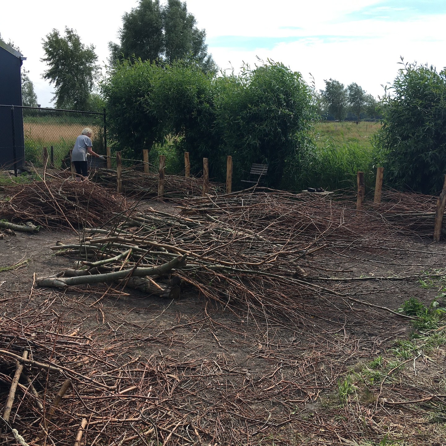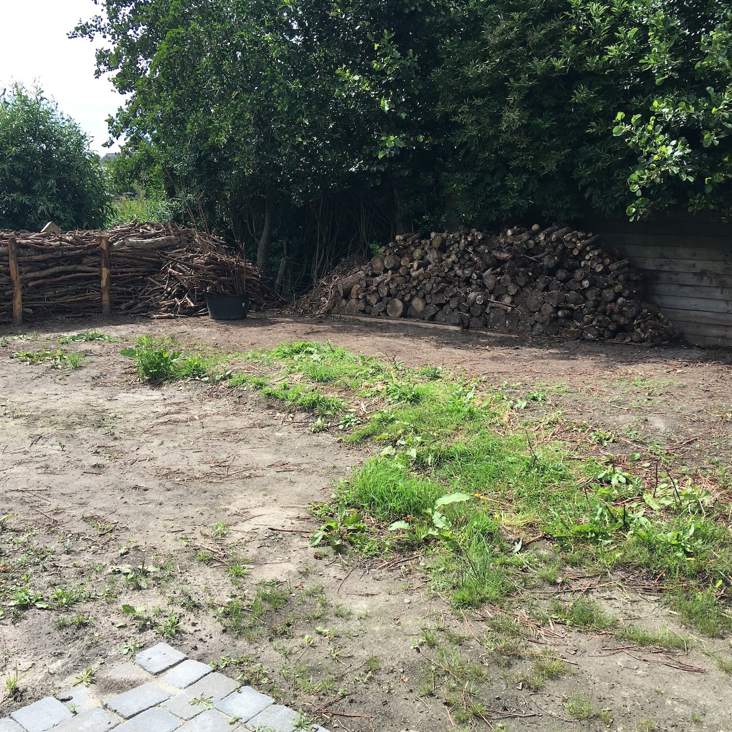 Nee hoor, ook al lijkt het werk soms eindeloos uitzichtloos, is het ook gewoon heel fijn om voortgang te zien. Zeker wanneer er weer iets nieuws ontstaat (zoals deze vrij forse takken – en hier en daar eerder stronken(a) – wal), er vervolgens daardoor een nieuwe dynamiek met de flora en fauna in de achtertuin opkomt (vooral de roodborstjes moesten regelmatig trots laten zien en horen dat dit hun nieuwe domein is, hihi:), wat ik ook wel begrijp, want tussen al die takken bevindt zich een enorm metropool van allerlei soorten mushi (krioelende (enge) insecten in het Japans), er was zelfs een verticaal mierennest gebouwd dat zich ruim één meter boven de grond had uitgestrekt – zo lang het maar niet wordt zoals in Hunter x Hunter, haha:p), en er tot slot weer wat meer ruimte en een klein beetje orde komt op de kavel om (ja voorlopig ook hier weer) verder te kunnen gaan met ophogen en uitvlakken(a).