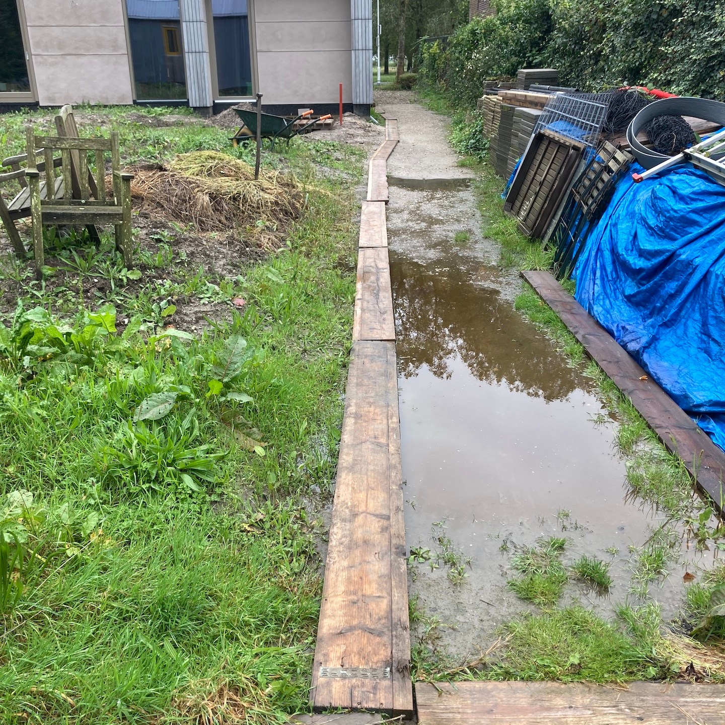 En ik zeg niet voor niets een klein beetje orde, want na het deels verplaatsen van de bergen en heuvels en het nog niet professioneel laten uitvlakken ontstaan er hier en daar spontaan wadi’s, en dat natuurlijk ook precies op de meest “tactische” plekken(a). We willen op ten duur ook zeker één of twee wadi’s ergens op de kavel, maar dan wel graag iets verder verwijderd van de deuren en looppaden, haha:p. Voor de komende tijd is het in ieder geval aan deze soort van loopplanken om onze voeten (en die van de vele nattigheidschuwe poezen die elke dag graag door onze tuin lopen) enigszins droog te houden, al is het nog onzeker of dat zo blijft uitpakken, want we zijn er ook achter gekomen dat de vlinders en libellen het heel fijn vinden om daar hun vleugels op op te warmen, en als ik een fijne Tomodachi moet geloven, kan je beter geen ruzie krijgen met vlinders (haha, sorry …n(n).. xx) :).