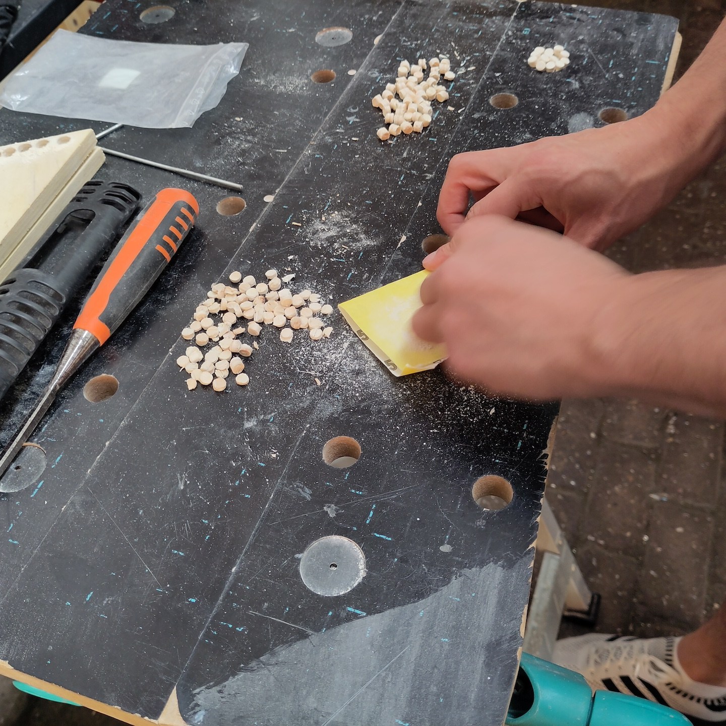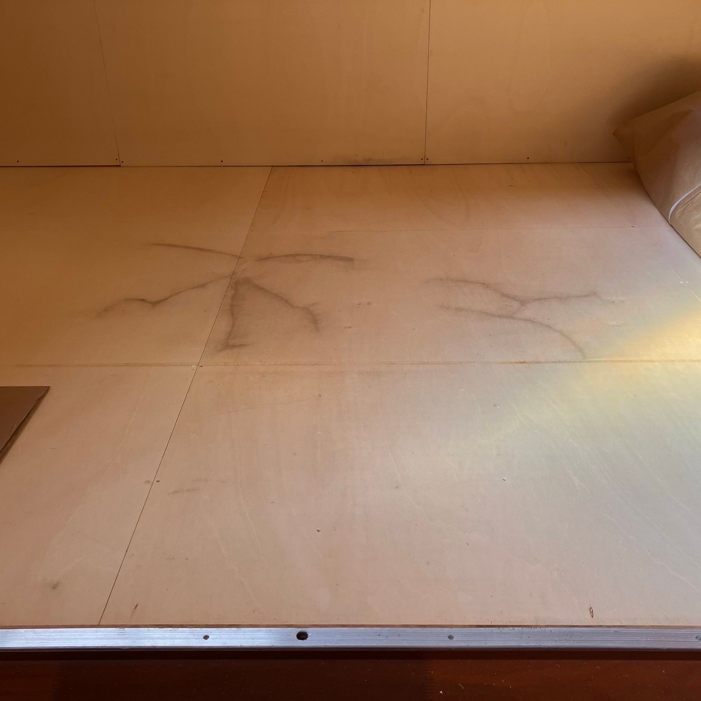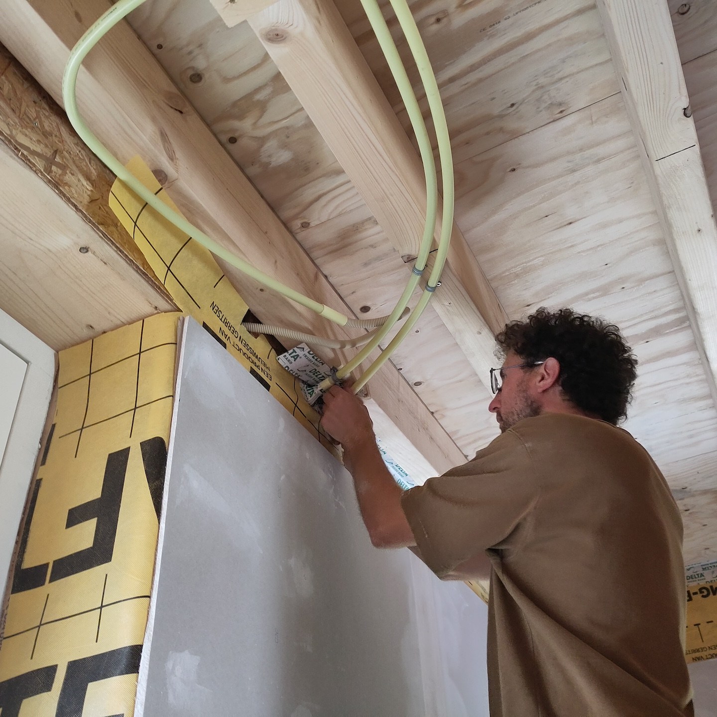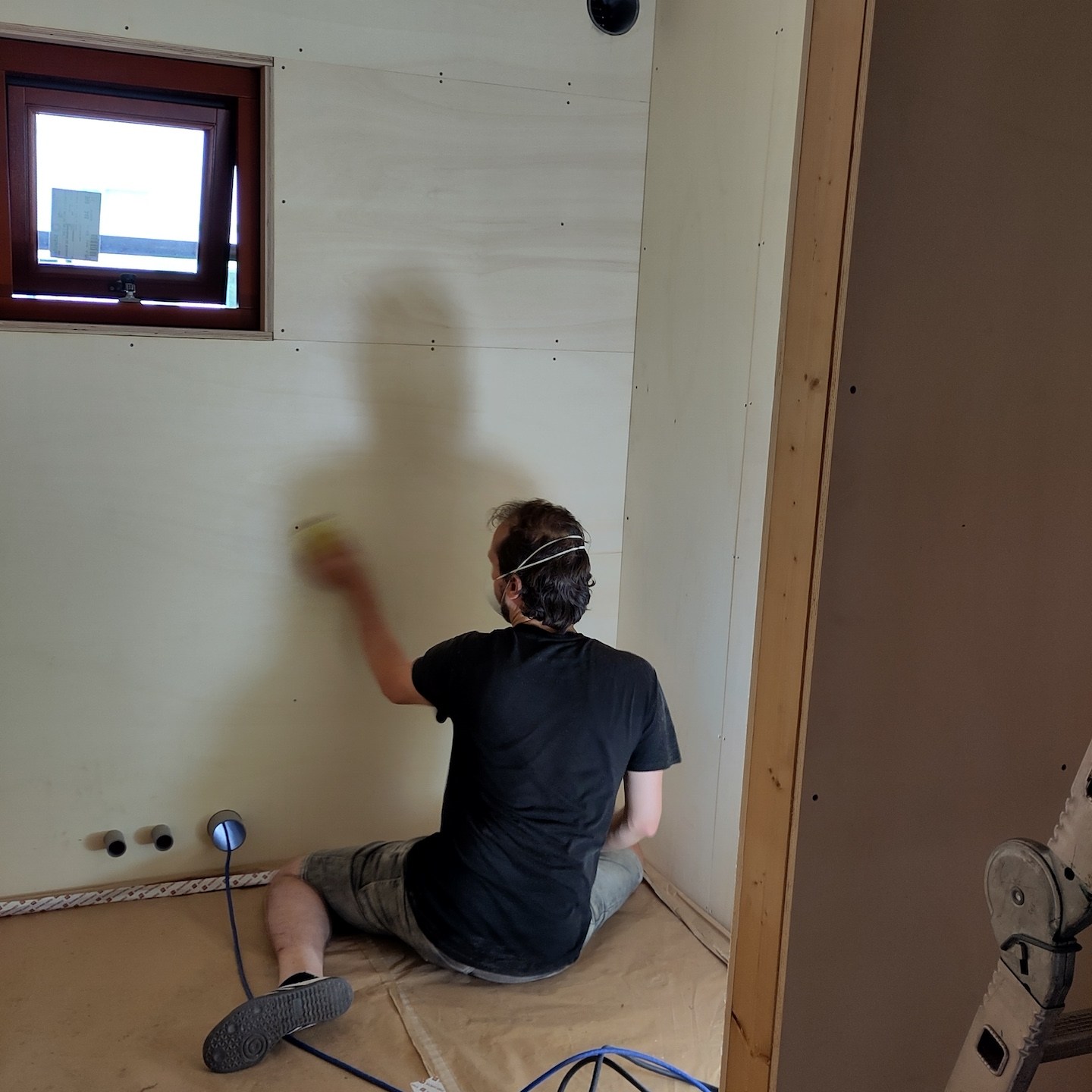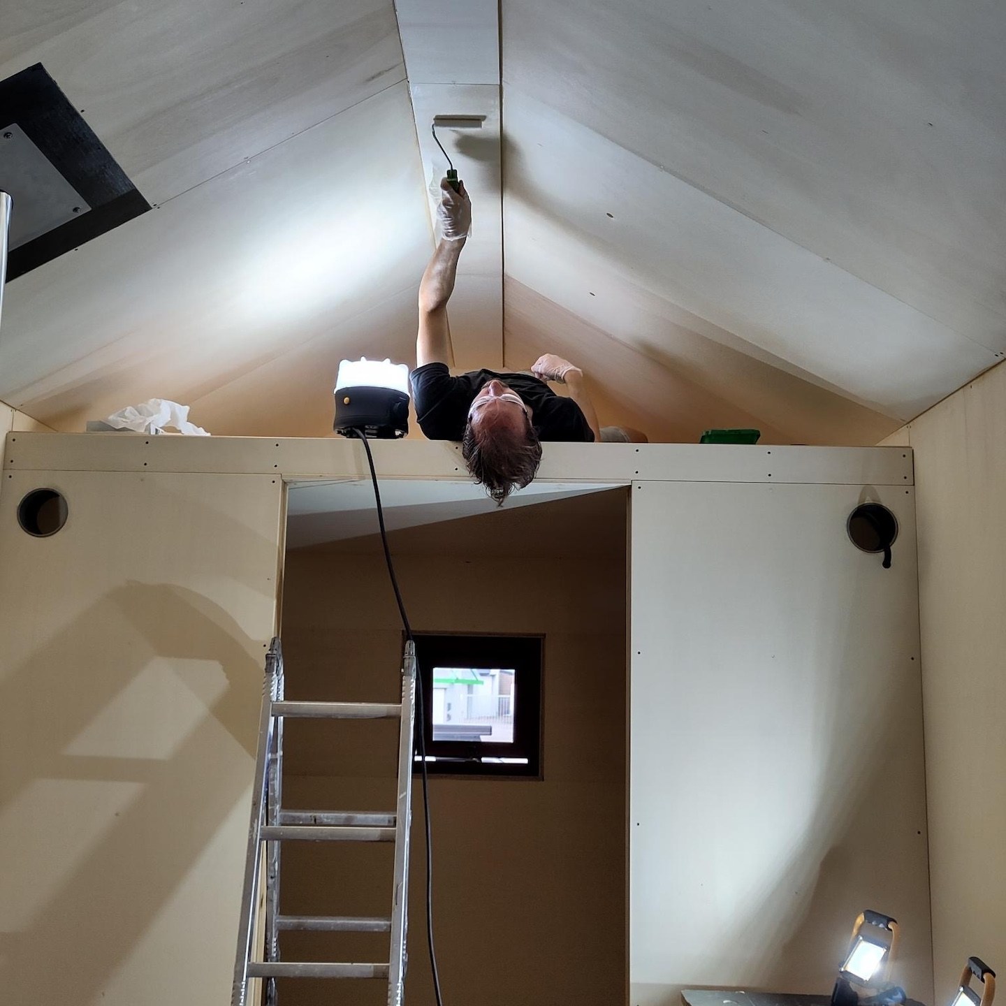 Nu lijkt het er wellicht op alsof wij deze zomer vooral in de tuin hebben “gespeeld”, maar dat is natuurlijk niet zo:). Naast al het noodzakelijke buitenwerk, kon ten eerste Pat zich eindelijk weer eens mentaal focussen op zijn eigen tiny huisje, waar hij vooral druk bezig is (geweest) met het uitgebreid prepareren op het oliën van zijn interieur. En uitgebreid is totaal niet gelogen hier (haha(a)), want Pat heeft (in tegenstelling tot wat ik heb gedaan bij mijn tiny huisje en mede doordat hij kleurloze olie gebruikt) ervoor gekozen om al (ja mensen dat zijn er héél wat meer dan ik heb gedaan) zijn (zichtbare) schroefgaten te gaan deuvelen… Moet je nagaan hè…dan slaap je al zo lang op een smal luchtbedje met verder niet zo veel comfort en voorzieningen bij de hand en dan heb je als nog hier geduld voor…(chapeau hoor, ik had dat nooit gekund – soms vraag ik mij wél af of hij stoïcijns is of gewoon masochistisch is ingesteld:p). Oohw en over comfort gesproken. Het oliën van het vervloekte (niet per se door al deze Poltergeist-achtige doodskopjes die hier en daar in de Ecoplexplaten zitten, maar vooral vanwege de houdingen waar je je in moet bewegen) entresol blijft een aanslag op het lichaam. Gelukkig is een tiny huisje niet zo groot, dus ben je er als het goed is ook snel weer vanaf:)…behalve natuurlijk als je van het entresol afdaalt (ja dan ben je er fysiek wél af natuurlijk) naar de vloer waar de volgende ‘Blair Witch Project en Resident Evil-achtige’ vervloekingen op je staan te wachten, haha:p.