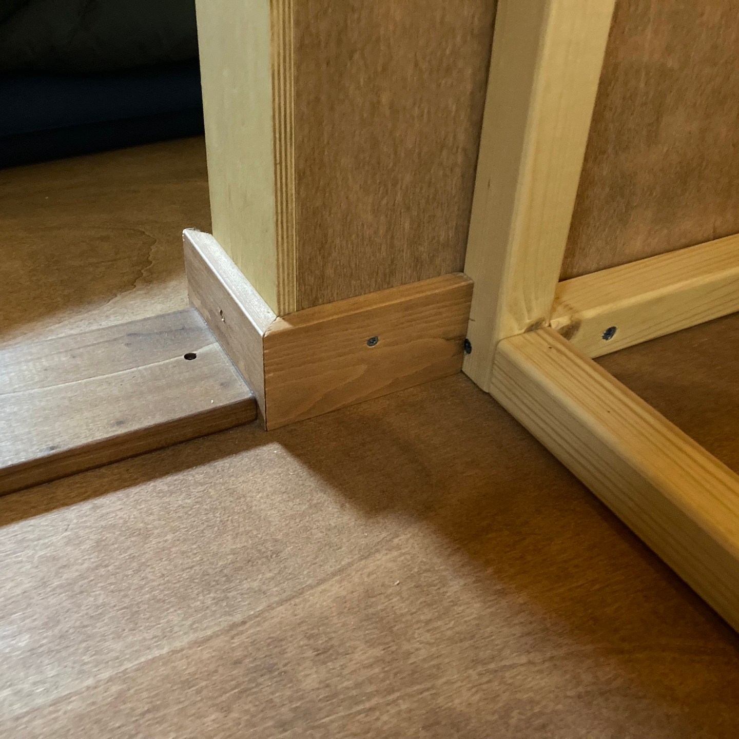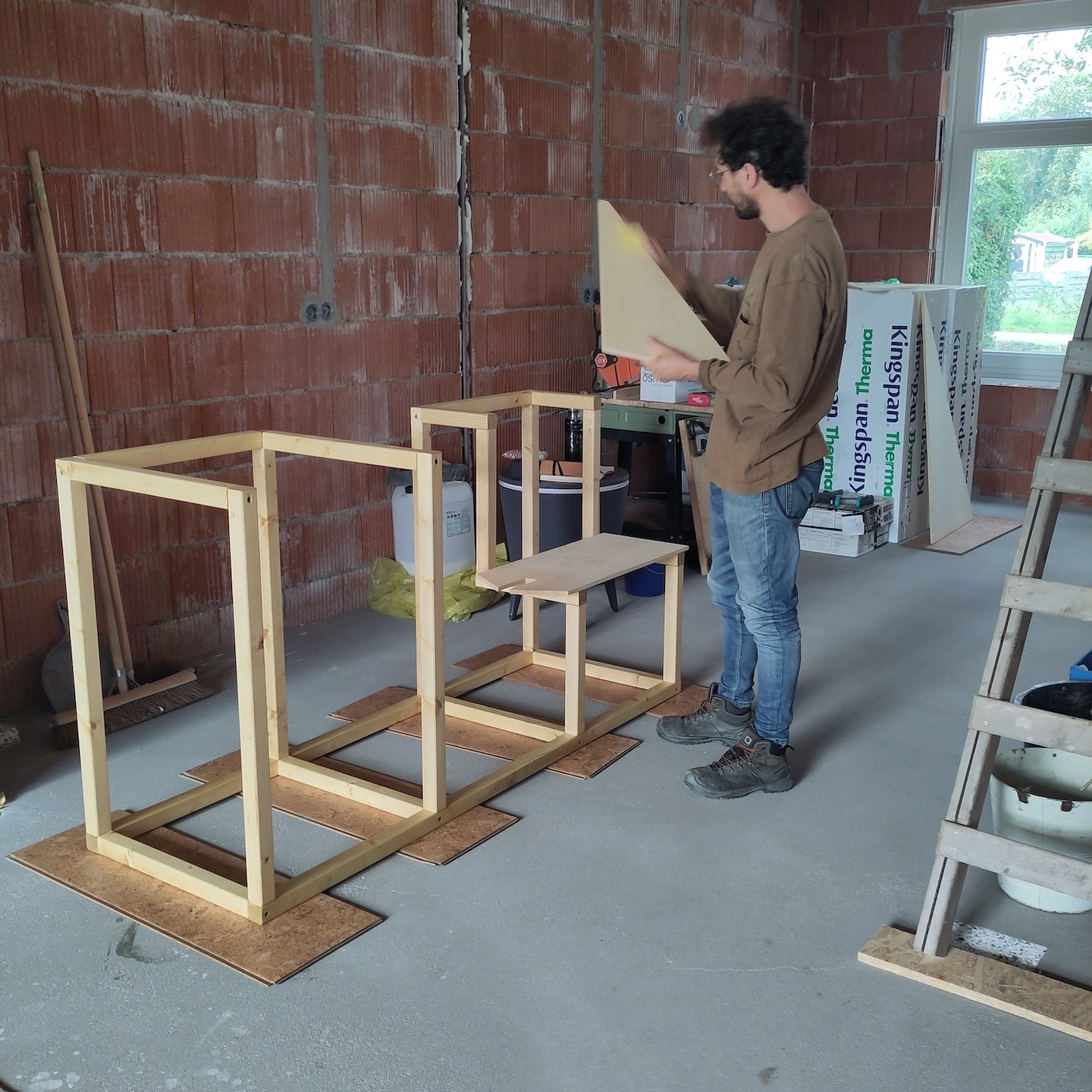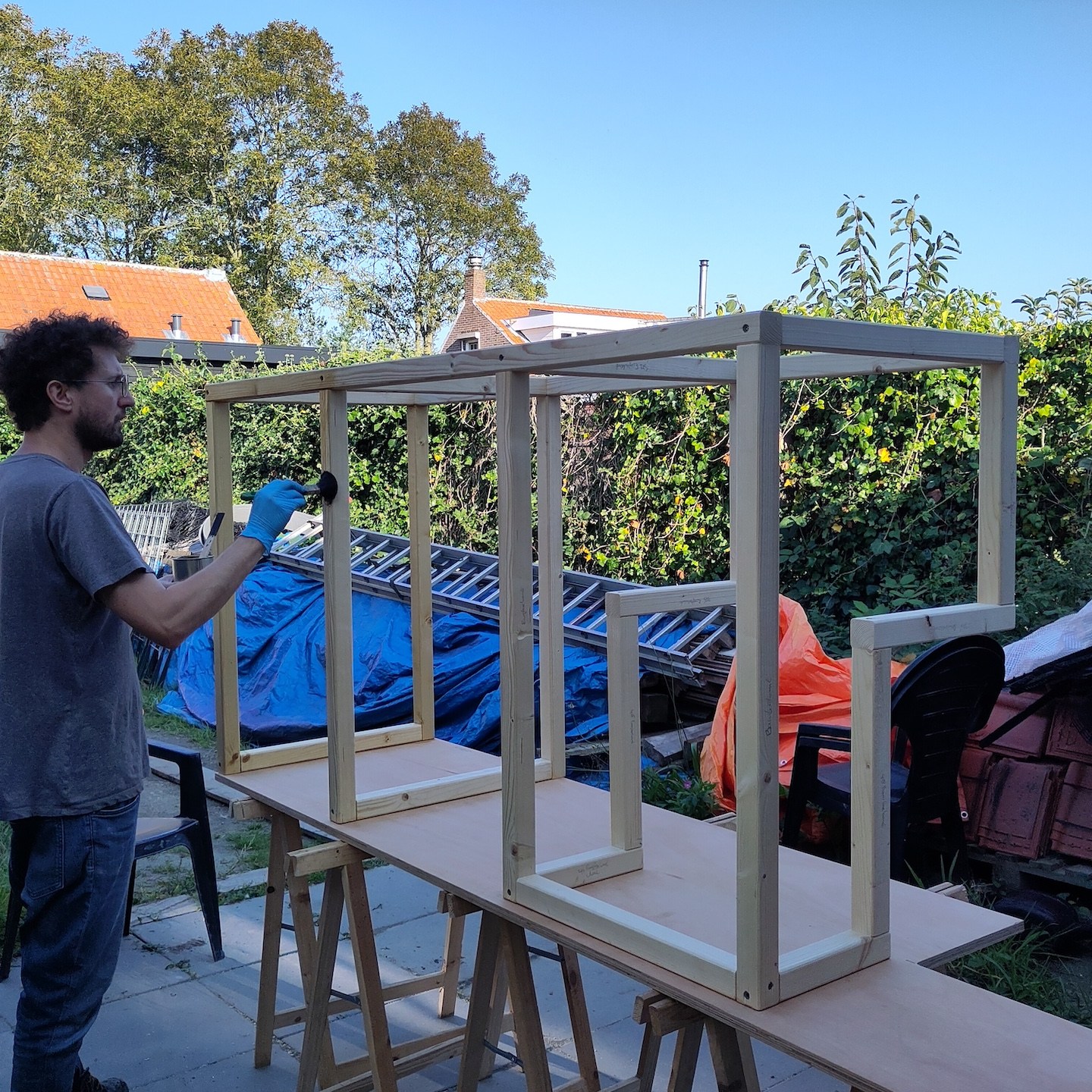Ach ja, tussen Demeters tranen door en veilig in het bezit zijnde van de bamboebladen kon ik in september nog wel even lekker buiten aan de slag met mijn keukenframe (die ik gelukkig en in tegenstelling tot mampap en Pat gewoon waxolie in een kleurtje en zodoende dus lekker kan Bob-Rossen uit de losse pols en met de Franse slag:)), zodat deze tegen het einde van de maand stevig verankerd een eigen plekje in mijn tiny huisje kon krijgen:). Oohw, en je weet dat je keukenframe goed vastzit als je eraan trekt en je hele huisje begint te schudden, haha:). Oohwoohw, en ook dit meubel is gelukkig weer makkelijk te verwijderen mocht het gewicht een probleem zijn voor het vervoeren in de toekomst:)). Oohwoohwoohw, en nee, dit is niet hoe ik mijn keuken per se wil inrichten, maar “iemand” vond het comfort van de horren deze zomer blijkbaar niet genoeg en wilde niet wéér een herfst/winter op een luchtbedje slapen, waardoor mijn nog steeds niet écht badkamer (met opgeslagen spullen) eerst de functie bedkamer (Leon, is dat geen slaapkamer, nee nee neen, mensen, dit is een bedkamer, dat wil zeggen een kamer waar precies één bed in past en meer niet, haha:p) krijgt. Misschien mag het na twee jaar ook wel eens toch?:) – en no worries, ik zal geen huurverhoging toepassen Pat:p. Ik ben al blij dat ik met deze laatste veertien centimeter eindelijk mijn vloerplintjes in het woongedeelte af heb kunnen maken, en Pat denk ik ook, want nu hoeft hij geen gekke heks-achtige kkhhhiiiggggg-geluiden (samen met gekruiste vingers) meer van mij te horen wanneer ik uit bed stap en die kant op kijk(a) (niet vanwege Pat, maar dat plintje bedoel ik dan hè – richting Pat maak ik heel andere geluiden:p).