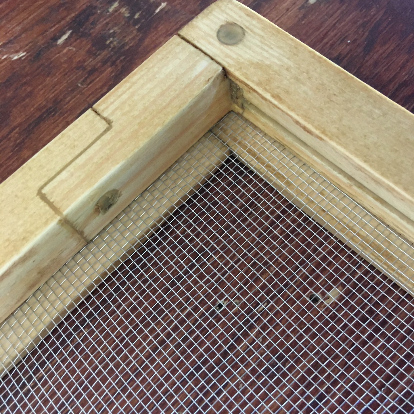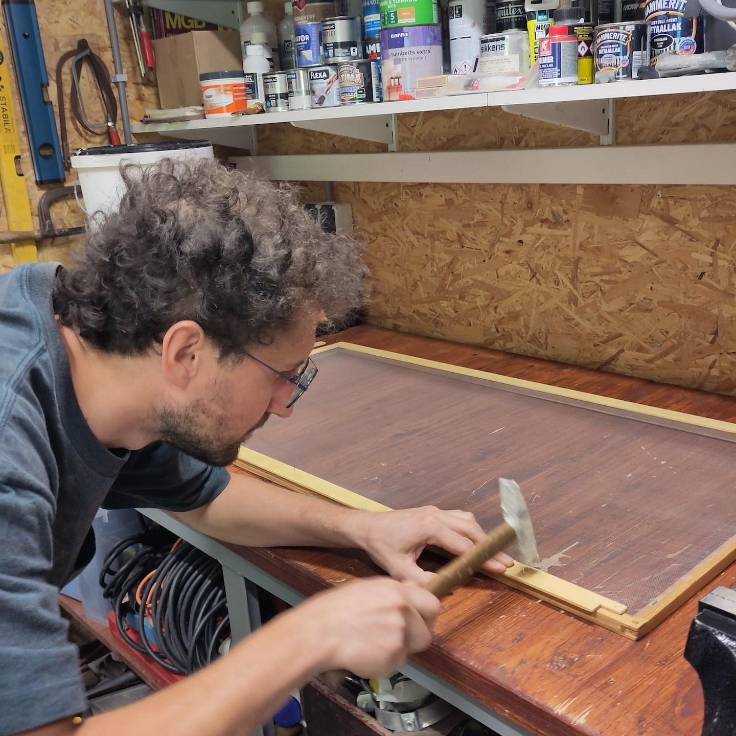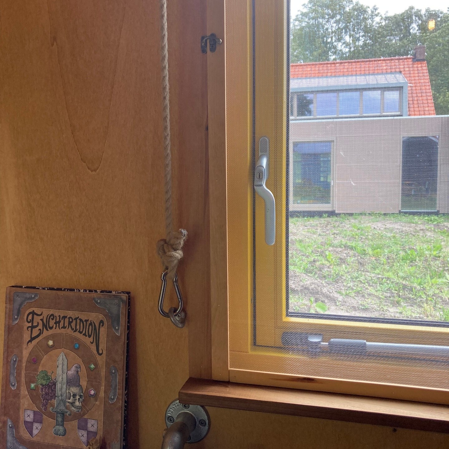 Tussen het graven en vooral de regenbuien door, en in opdracht van Pat die deze zomer hoe dan ook horren voor mijn ramen wilde hebben (hoe durft hij te vragen om comfort hè…de brutaliteit:p), was ik in juni met name aan het experimenteren met het maken van horren uit materialen als aluminiumgaas en diverse soorten hout, wat na wat verschillende ideeën en probeersels dan ook eindelijk helemaal naar wens lukte:). Al moet je ook hier weer niet te veel OCD hebben en een heel klein beetje met vergevingsgezinde ogen naar kijken, haha, want sommige elementen lijken rechtstreeks vanuit de belevingswereld van Mary Shelley te zijn gekropen(a). Ach ja, geheel in lijn weer met Wabi-Sabi en Boris de boswachter (van het boekje ‘Op een Winteravond’) is al dit Frankenstein-achtige bij mij ook gewoon meer dan welkom hoor, net als de koelere avonden en nachten in de tijd van Auxo (seizoensgodin van de zomer) die de Zeeuwse Winden (wellicht moet ik eens gaan nadenken om die hun eigen mythische namen te geven, dat verdienen ze volgens mij wel) met behulp van deze horren teweeg wisten te brengen:).