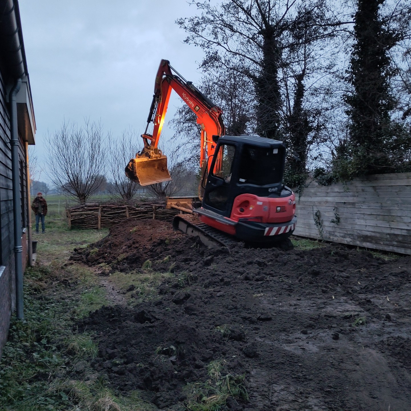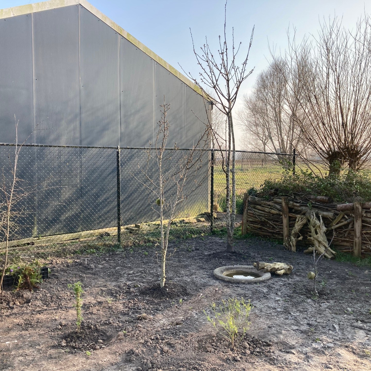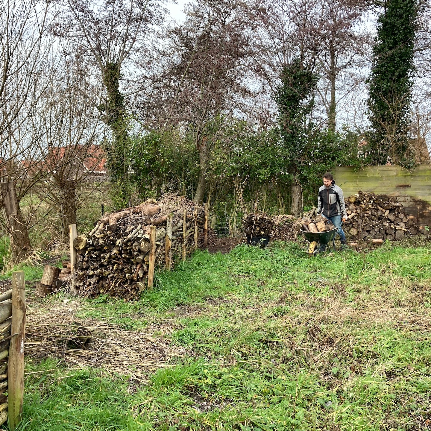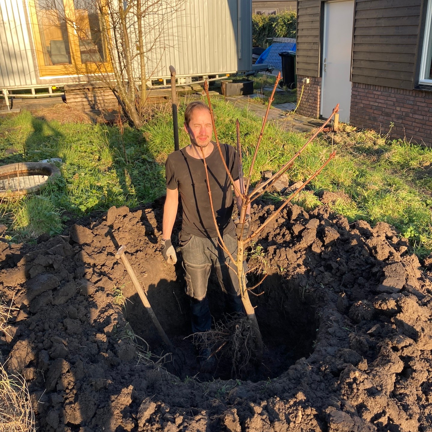 Over de ravage op de kavel gesproken. Aan het begin van februari wist de zon (en met het vallen van de avond ook de andere hemellichamen:)) eindelijk weer eens door het Matrix-achtige wolkendek heen te prikken, jééj:), en konden wij ook weer eens aangenaam aan de slag in de tuin (ja in korte broek zo nu en dan, haha, je moet het mooie weer soms zelf uitnodigen hè(a)), zodat de zoon van de buren van onze toffe buren met zijn (in dit geval) “oranje draak” en enorme vakkundigheid het chaotische heuvellandschap haast in een enkele oogwenk en handomdraai (één schep van zijn “oranje draak” is bijna twee kruiwagens groot en in één kruiwagen zitten weer een hele hoop scheppen van mijzelf, dus ja, dat ging een stuk sneller dan mijn “inzet”, haha(a)) kon omtoveren in een vlakkere oase van rust (overigens helemaal niets mis met chaotische heuvellandschappen natuurlijk, als ik mijn huisje bijvoorbeeld hier in Wales (ja, ik was er even tussenuit om mijn neefje en de natuur daar te bezoeken:)) op deze soort van Akademeia van Plato-achtige locatie kon zetten, dan zou ik dat direct doen, haha:)). Een zeer welkome rust overigens na 2,5 jaar van chaotische wanorde (het is nog lang niet klaar natuurlijk en eerder een fata morgana dan een daadwerkelijke oase, maar nu kan er in ieder geval wél eindelijk constructief gewerkt worden aan het opbouwen (oké, de schutting zal nog afgebroken moeten worden, zoals de Groene Specht ook al veelvuldig liet blijken, haha:)) van (in plaats van enkel verplaatsen van dingen in) de tuin, dubbel jééj, beginnende met het (ver)planten van (fruit)boompjes (dankjewel ook Luuc van Heijboer boomverzorging voor het meedenken en de tips rondom het verpoten van bomen;)). Wisten jullie trouwens dat dit gebied hier vroeger uit allerlei fruitgaarden bestond. Er zijn er nog een paar over, maar wat mij betreft mogen die weer veelvuldiger terugkomen, en dan natuurlijk ook met ruimte voor tiny huisjes hè, haha(a). Wonen en werken op een fruitgaard! Klinkt niet verkeerd toch?