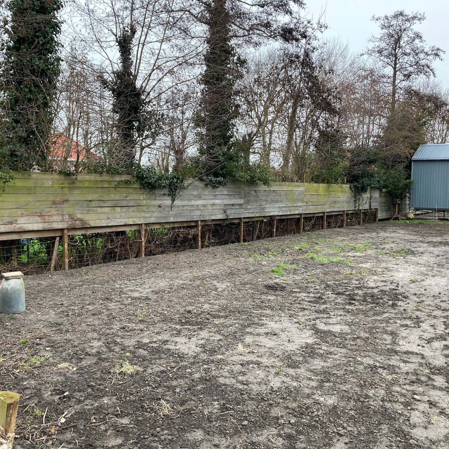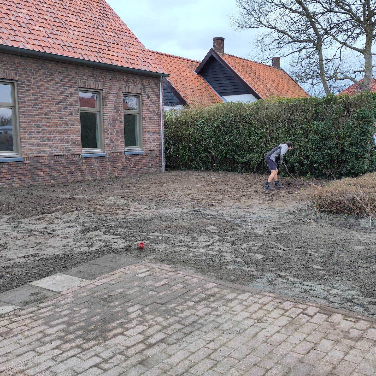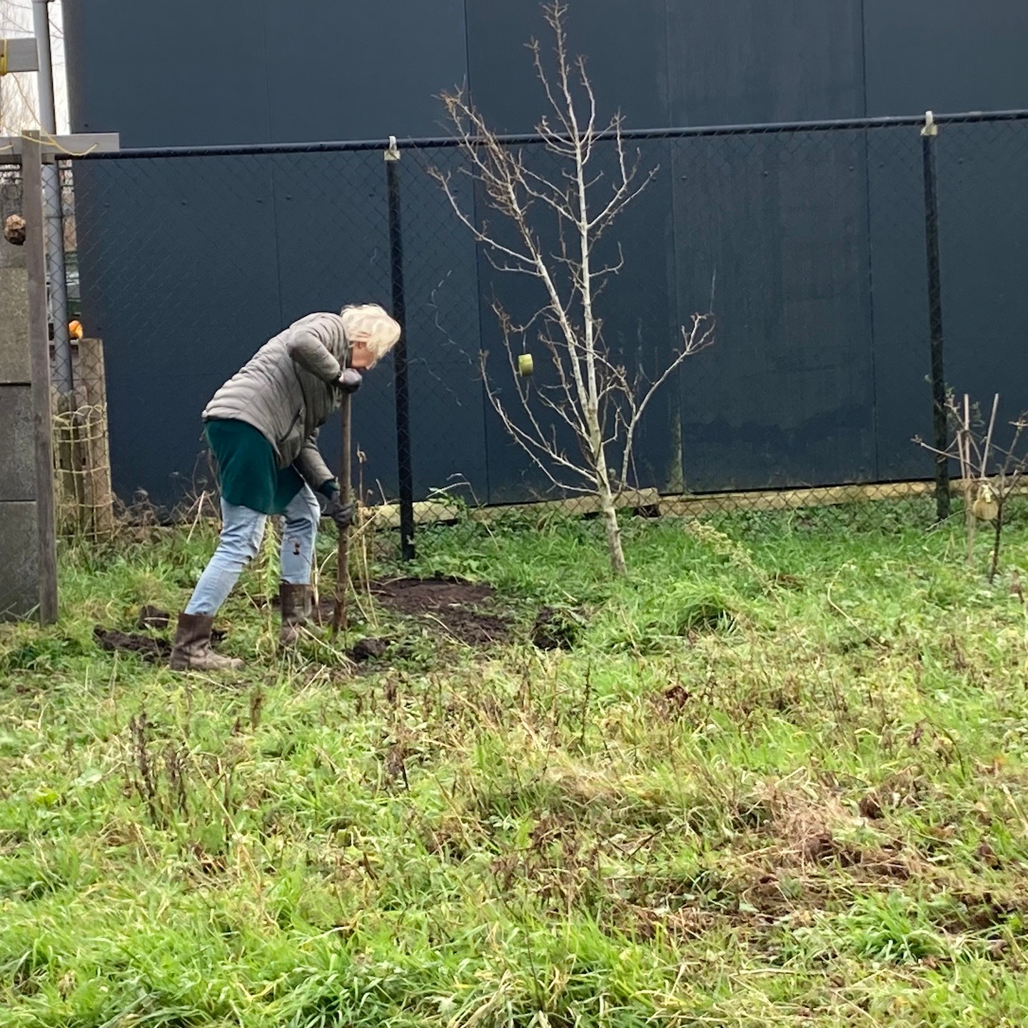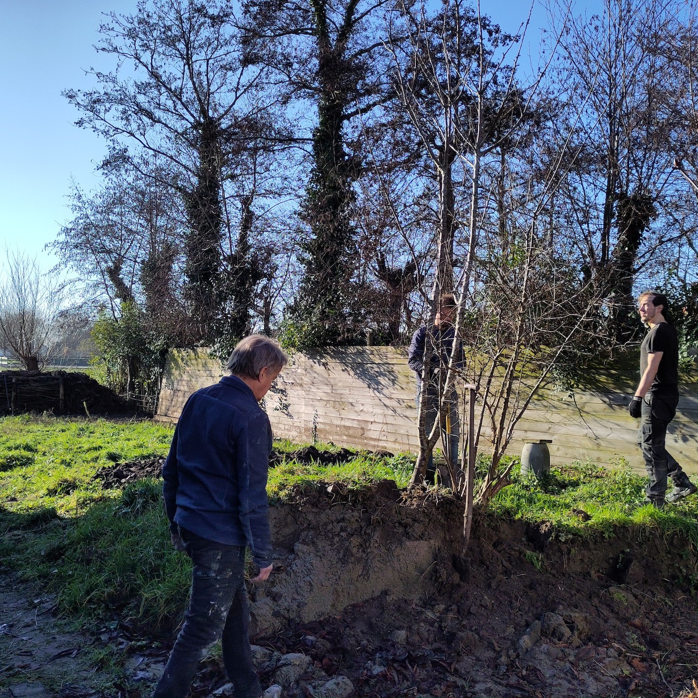 Over de ravage op de kavel gesproken. Aan het begin van februari wist de zon (en met het vallen van de avond ook de andere hemellichamen:)) eindelijk weer eens door het Matrix-achtige wolkendek heen te prikken, jééj:), en konden wij ook weer eens aangenaam aan de slag in de tuin (ja in korte broek zo nu en dan, haha, je moet het mooie weer soms zelf uitnodigen hè(a)), zodat de zoon van de buren van onze toffe buren met zijn (in dit geval) “oranje draak” en enorme vakkundigheid het chaotische heuvellandschap haast in een enkele oogwenk en handomdraai (één schep van zijn “oranje draak” is bijna twee kruiwagens groot en in één kruiwagen zitten weer een hele hoop scheppen van mijzelf, dus ja, dat ging een stuk sneller dan mijn “inzet”, haha(a)) kon omtoveren in een vlakkere oase van rust (overigens helemaal niets mis met chaotische heuvellandschappen natuurlijk, als ik mijn huisje bijvoorbeeld hier in Wales (ja, ik was er even tussenuit om mijn neefje en de natuur daar te bezoeken:)) op deze soort van Akademeia van Plato-achtige locatie kon zetten, dan zou ik dat direct doen, haha:)). Een zeer welkome rust overigens na 2,5 jaar van chaotische wanorde (het is nog lang niet klaar natuurlijk en eerder een fata morgana dan een daadwerkelijke oase, maar nu kan er in ieder geval wél eindelijk constructief gewerkt worden aan het opbouwen (oké, de schutting zal nog afgebroken moeten worden, zoals de Groene Specht ook al veelvuldig liet blijken, haha:)) van (in plaats van enkel verplaatsen van dingen in) de tuin, dubbel jééj, beginnende met het (ver)planten van (fruit)boompjes (dankjewel ook Luuc van Heijboer boomverzorging voor het meedenken en de tips rondom het verpoten van bomen;)). Wisten jullie trouwens dat dit gebied hier vroeger uit allerlei fruitgaarden bestond. Er zijn er nog een paar over, maar wat mij betreft mogen die weer veelvuldiger terugkomen, en dan natuurlijk ook met ruimte voor tiny huisjes hè, haha(a). Wonen en werken op een fruitgaard! Klinkt niet verkeerd toch?