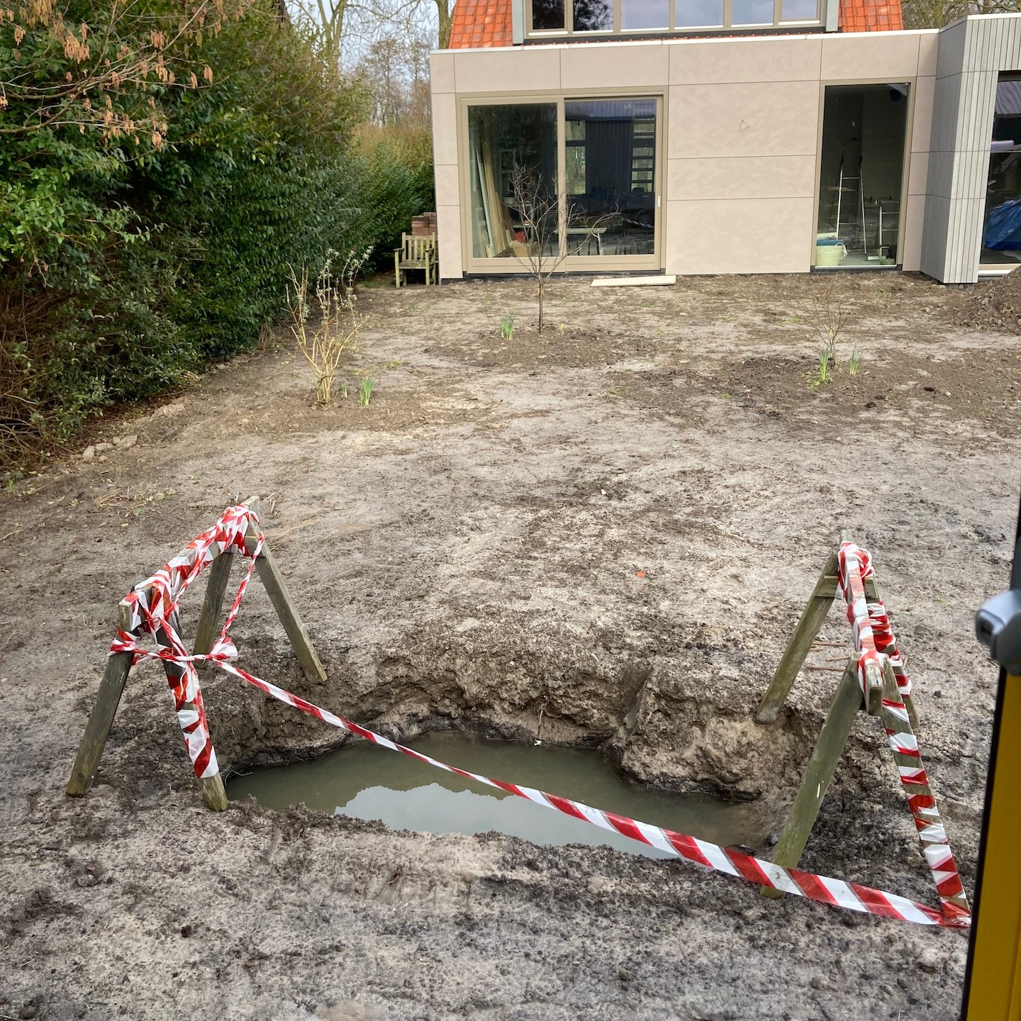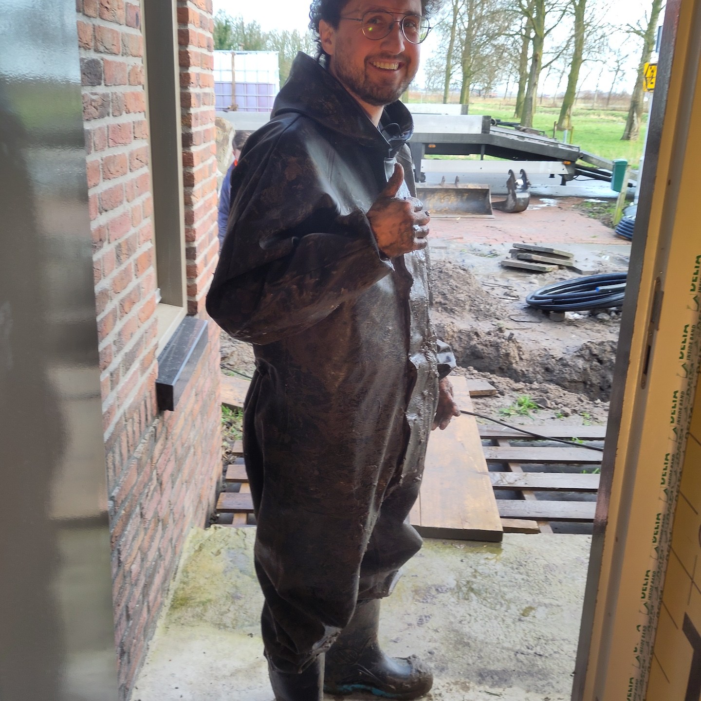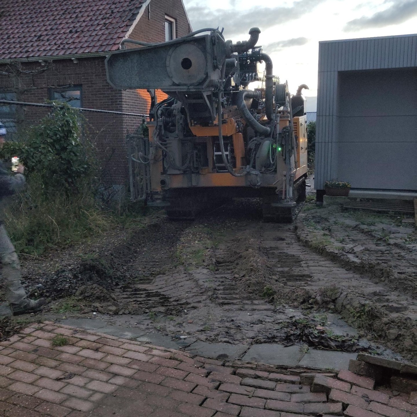 Kleine confessie hierbij: hoge hoogtes vind ik niet echt een probleem, maar net als het drijven op open water, ben ik (tot we zoiets vinden als de “Gurren Lagann” (voor de anime-kijkers onder ons:))) niet heel erg super fan van het spenderen van al te veel tijd in benauwende ruimtes onder de grond. Blij toe dan ook dat we ten eerste gebruik mochten maken van een waadpak ((niet zo) strak, strak in mij waahaadpak, pak, kijk eens hoe ik…:p) van kennissen (dat maakt het glibberen door de modder een stuk makkelijker en aangenamer) en vervolgens niet zelf ruim 120 meter de grond in hoefde te graven maar de grondboringen voor de bodemwarmtepomp gewoon gedaan konden worden met behulp van deze 25-ton wegende “gele draak” (voor de term “gele draak” zie de jaren’90 kinderfilm: Annabel en de race tegen de klok, haha:)), die in tegenstelling tot wat sommigen onder ons dachten natuurlijk niet veilig langs het huis paste(a). Maar goed dat er in de voortuin ook een prima optie was om de enorme diepte in te gaan. En dubbel maar goed dat we de kavel niet al helemaal hadden uitgevlakt en opgeknapt, want wat was het daarna weer een ravage, haha(a).
