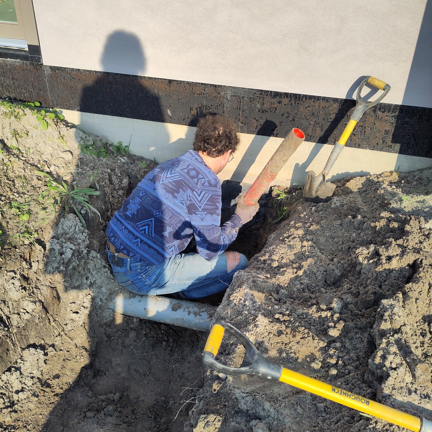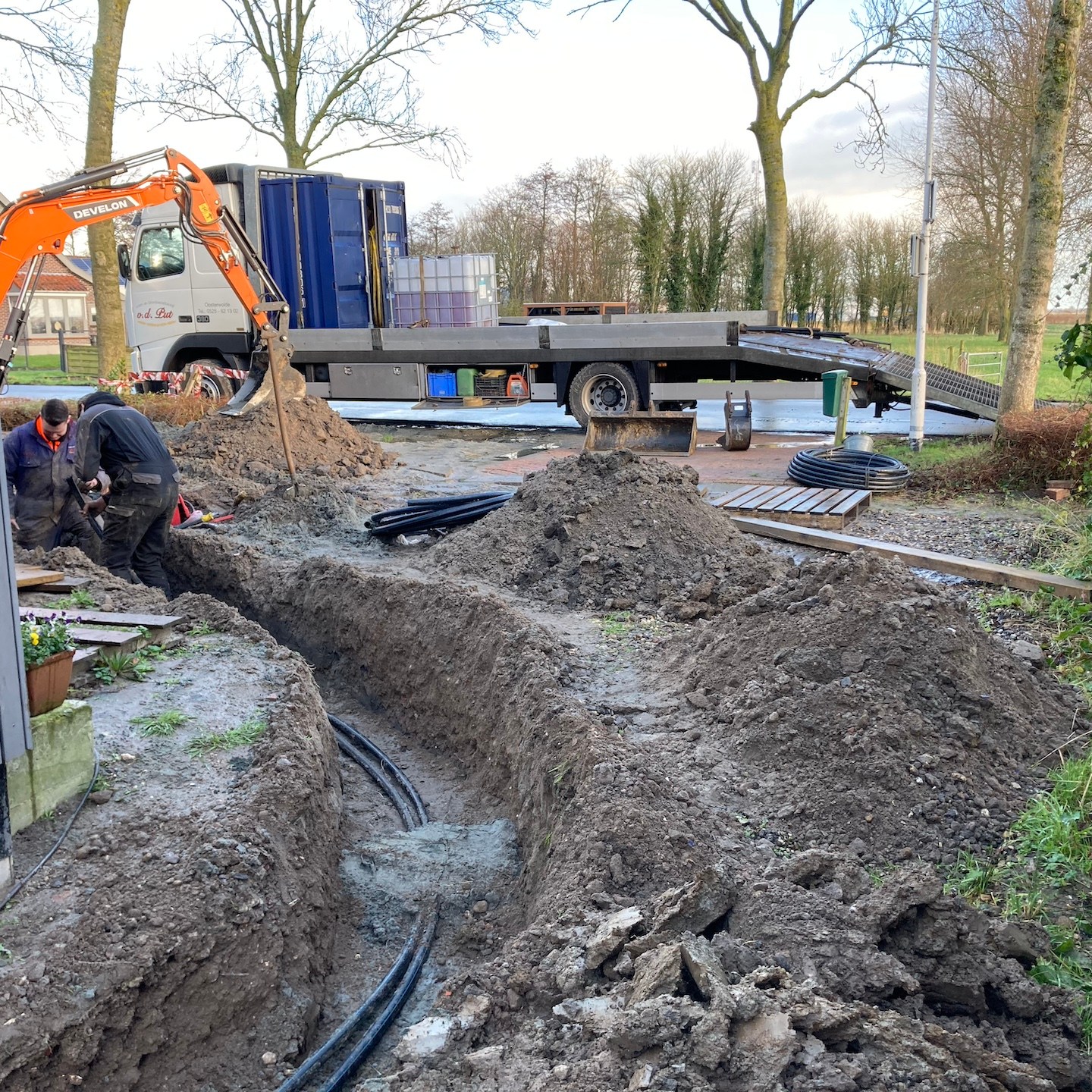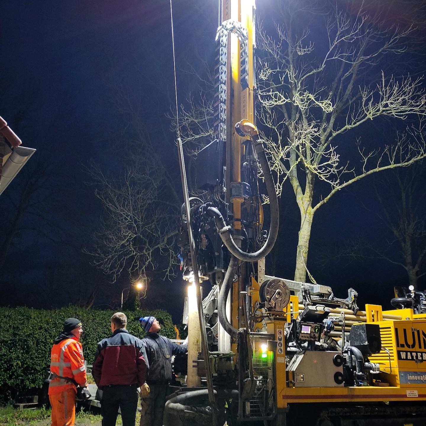 Kleine confessie hierbij: hoge hoogtes vind ik niet echt een probleem, maar net als het drijven op open water, ben ik (tot we zoiets vinden als de “Gurren Lagann” (voor de anime-kijkers onder ons:))) niet heel erg super fan van het spenderen van al te veel tijd in benauwende ruimtes onder de grond. Blij toe dan ook dat we ten eerste gebruik mochten maken van een waadpak ((niet zo) strak, strak in mij waahaadpak, pak, kijk eens hoe ik…:p) van kennissen (dat maakt het glibberen door de modder een stuk makkelijker en aangenamer) en vervolgens niet zelf ruim 120 meter de grond in hoefde te graven maar de grondboringen voor de bodemwarmtepomp gewoon gedaan konden worden met behulp van deze 25-ton wegende “gele draak” (voor de term “gele draak” zie de jaren’90 kinderfilm: Annabel en de race tegen de klok, haha:)), die in tegenstelling tot wat sommigen onder ons dachten natuurlijk niet veilig langs het huis paste(a). Maar goed dat er in de voortuin ook een prima optie was om de enorme diepte in te gaan. En dubbel maar goed dat we de kavel niet al helemaal hadden uitgevlakt en opgeknapt, want wat was het daarna weer een ravage, haha(a).