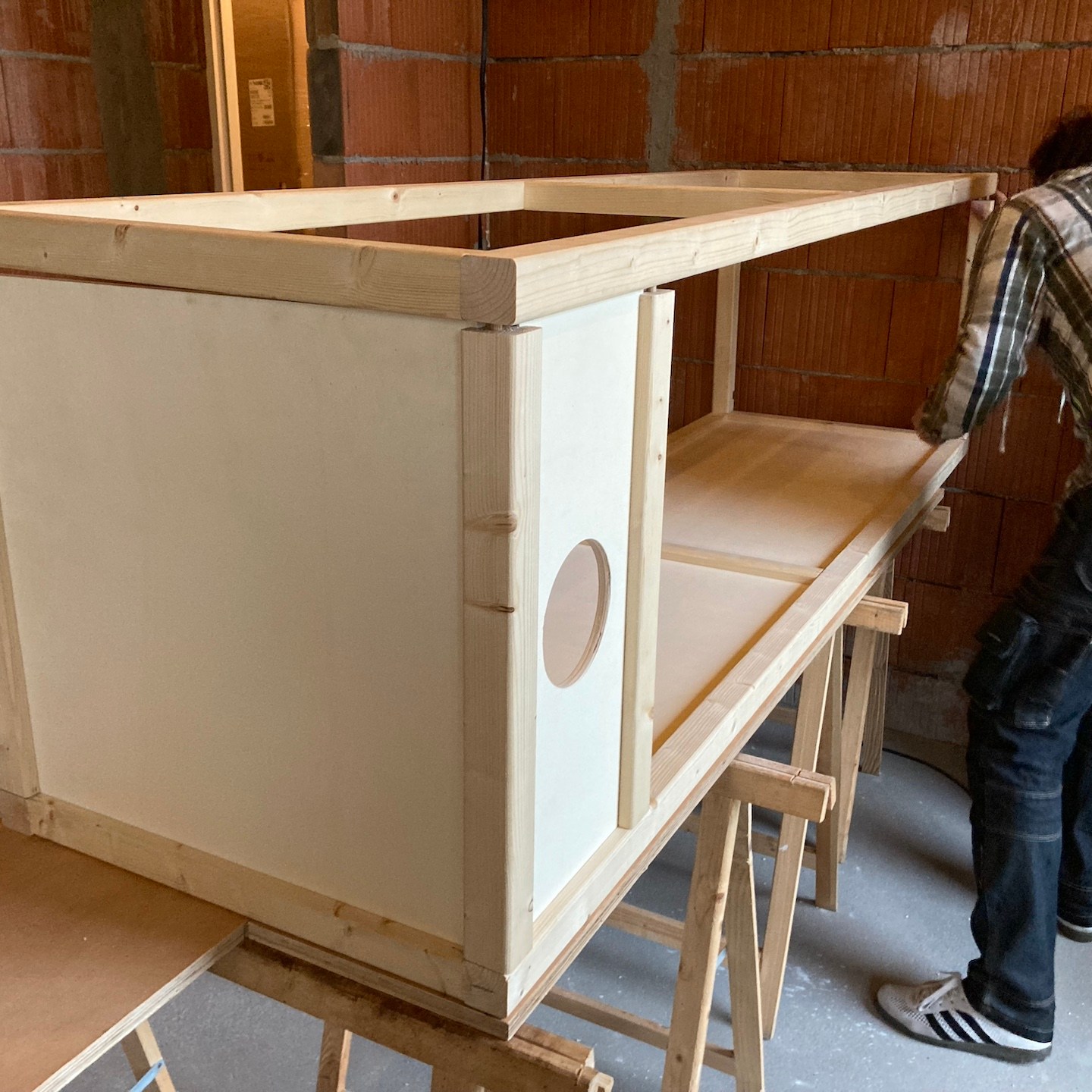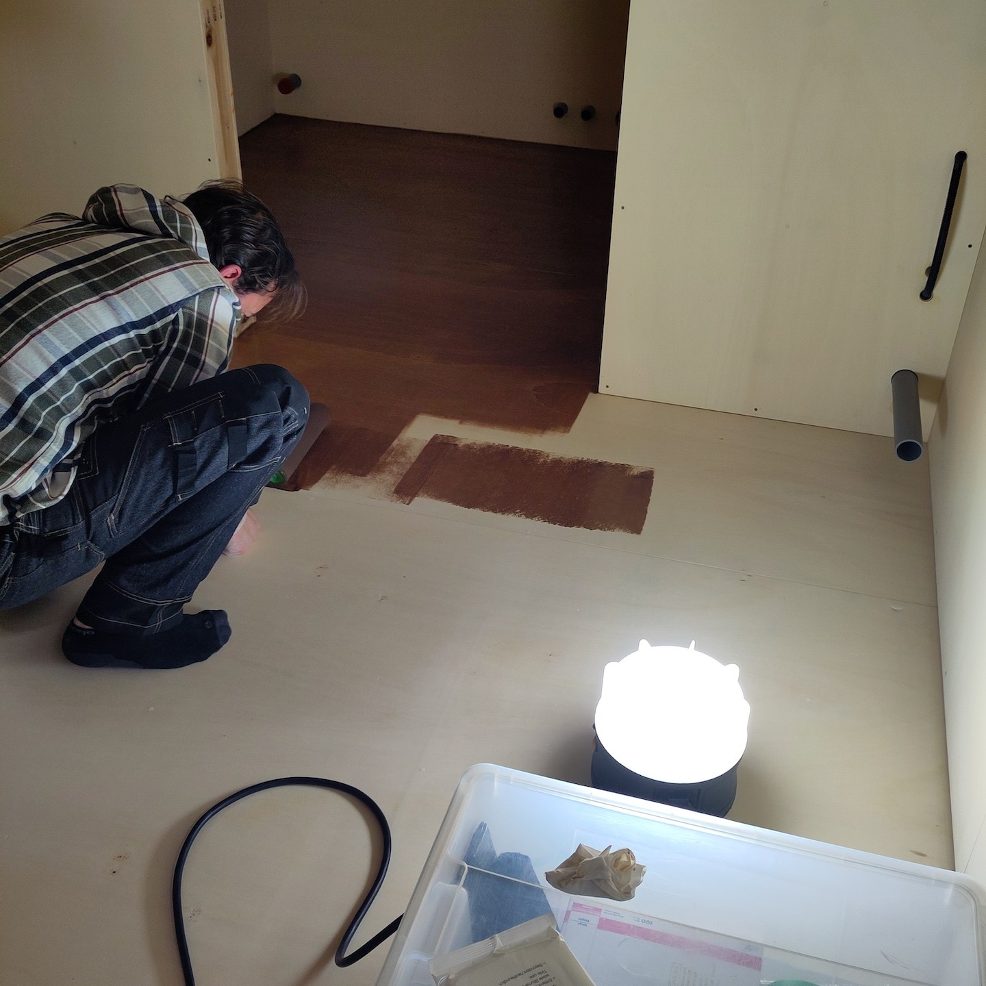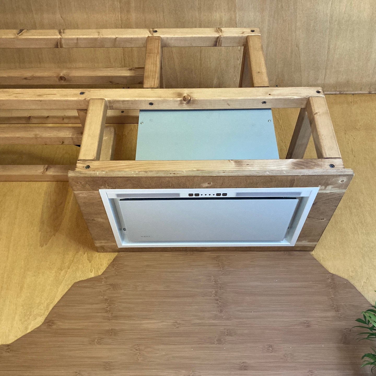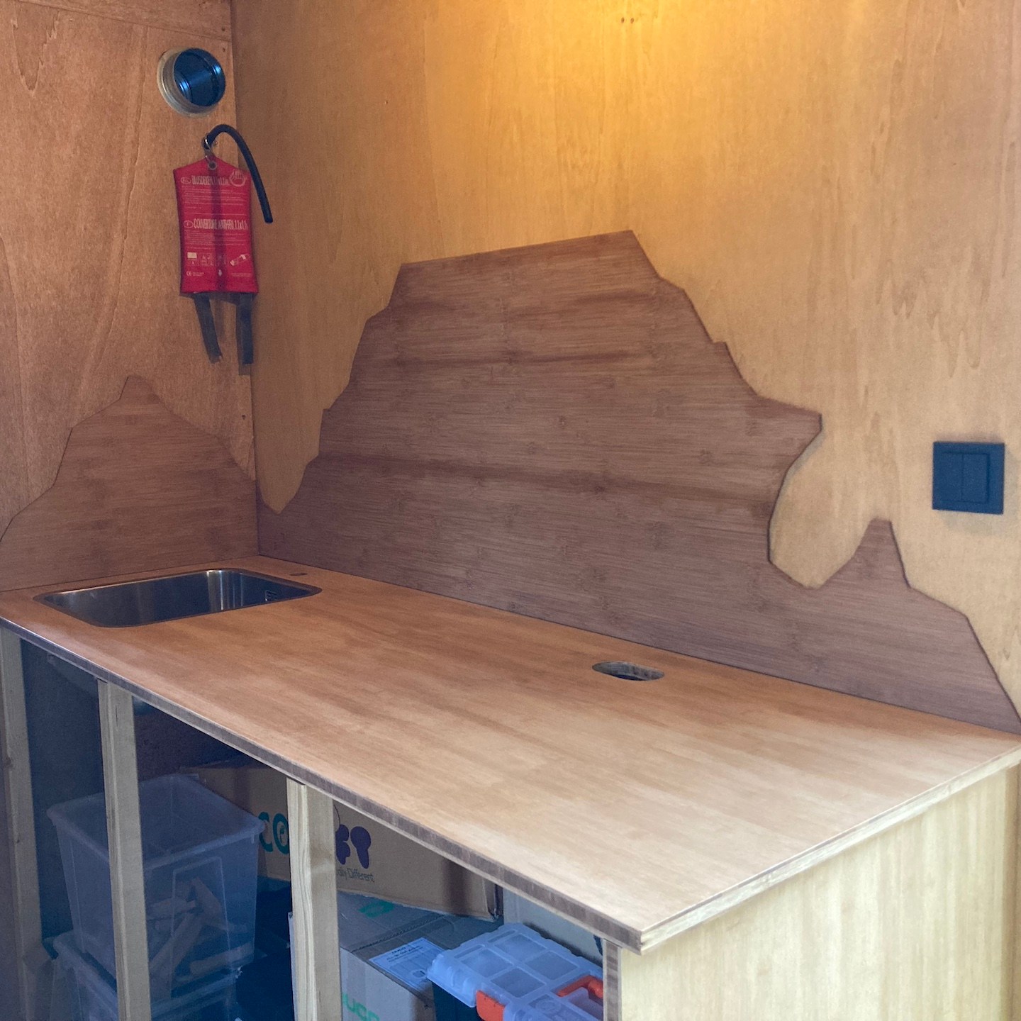 Naast Pats bouwsels heb ik mij daarnaast, met hier en daar hulp van hem en Ray, in mijn huisje vooral gefocust op het verder ontwerpen en uitwerken van mijn totale s(oms tot in de kleinste details) maatwerk keuken, waarbij de sparing voor de wasbak in het bamboe keukenblad ten eerste vooral door Rays combinatie van clowneske capriolen en wizard-achtige inzichten goed uit de verf (en uiteindelijk Osmo Topoil olie:p) is gekomen:) (we lijken overigens weer best wel veel op elkaar als we zo op de grond zitten hè, haha:)), het schoenenrekje in de zijkant helemaal naar tevredenheid is gelukt:), de spatschermen wat extra aandacht (zowel voor het strijken (ja je leest het goed: strijken met een strijkijzer) van de kromgetrokken platen als het bevestigen ervan met een groot aantal spijkertjes(a)) vergden dan dat ik had verwacht en tot slot het afzuigkapmeubel met behulp weer van wat Tetris-achtige ‘moves’ uit het verleden en mede door de nog steeds oohw zo fijne Dynaplus schroeven lekker stevig op zijn plek hangt:). Ook dit wordt vervolgd en ook deze onderdelen kunnen er overigens altijd weer uit mocht dat nodig zijn voor het verplaatsen. De lijn van modulair bouwen wordt dus nog altijd zoveel als mogelijk is voortgezet;).