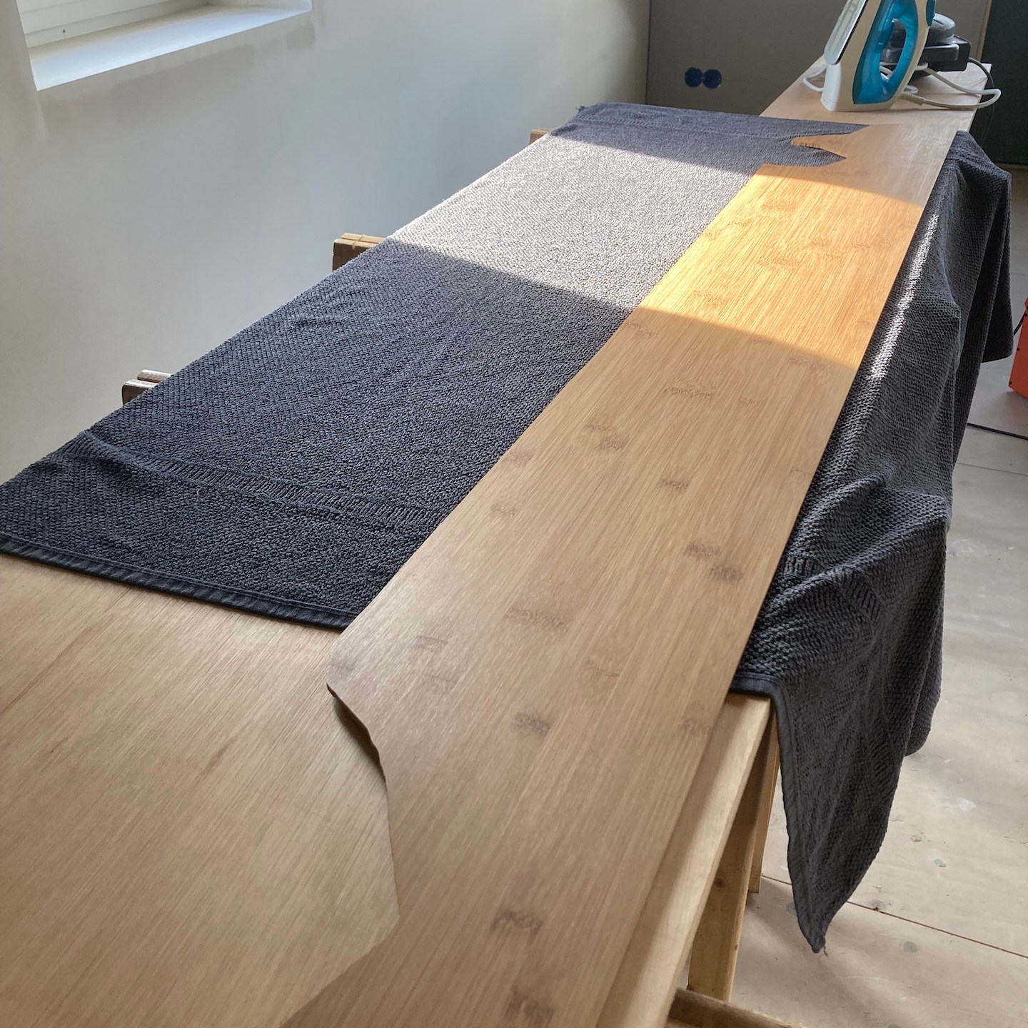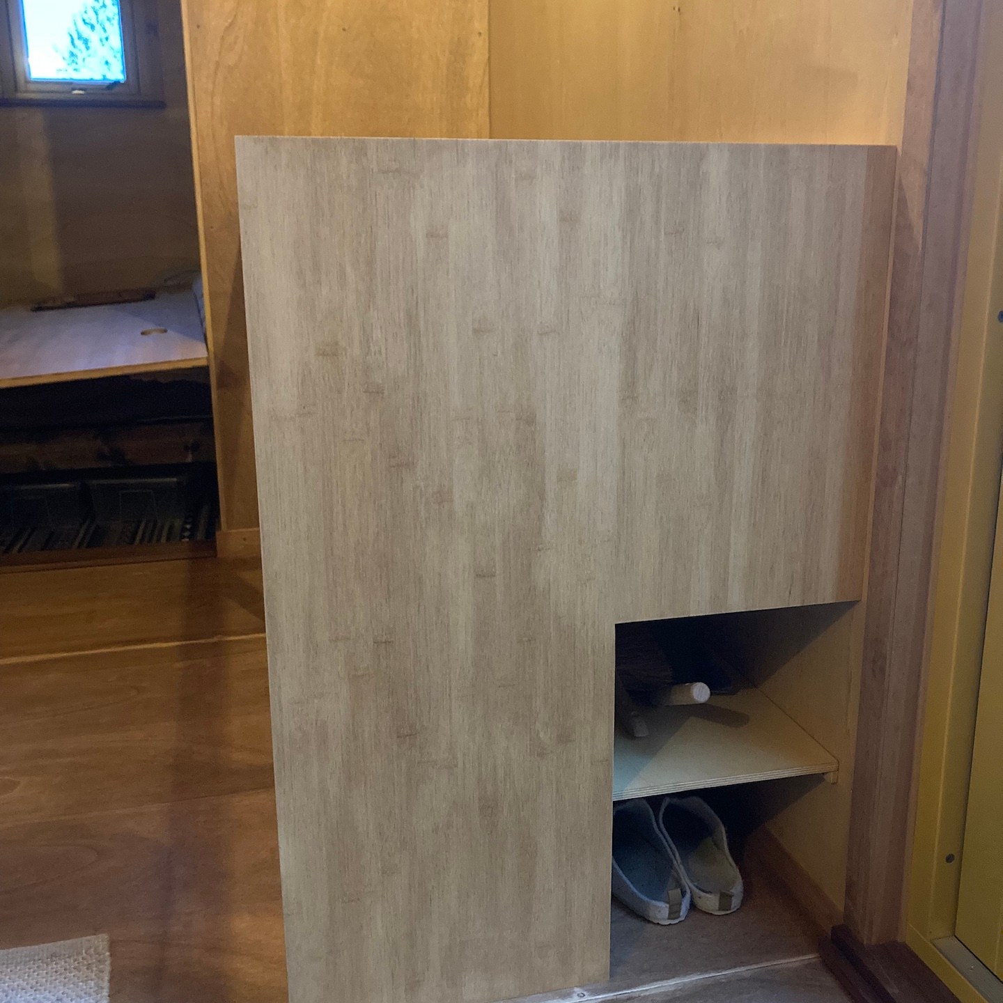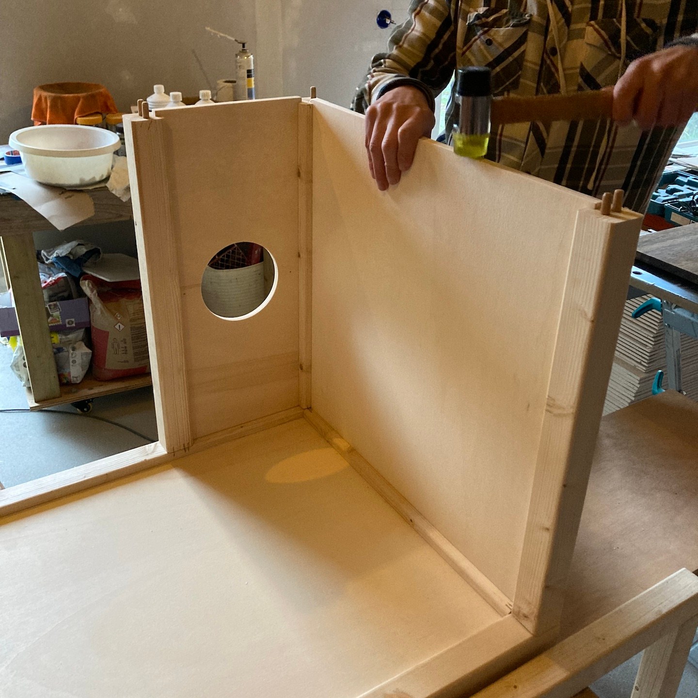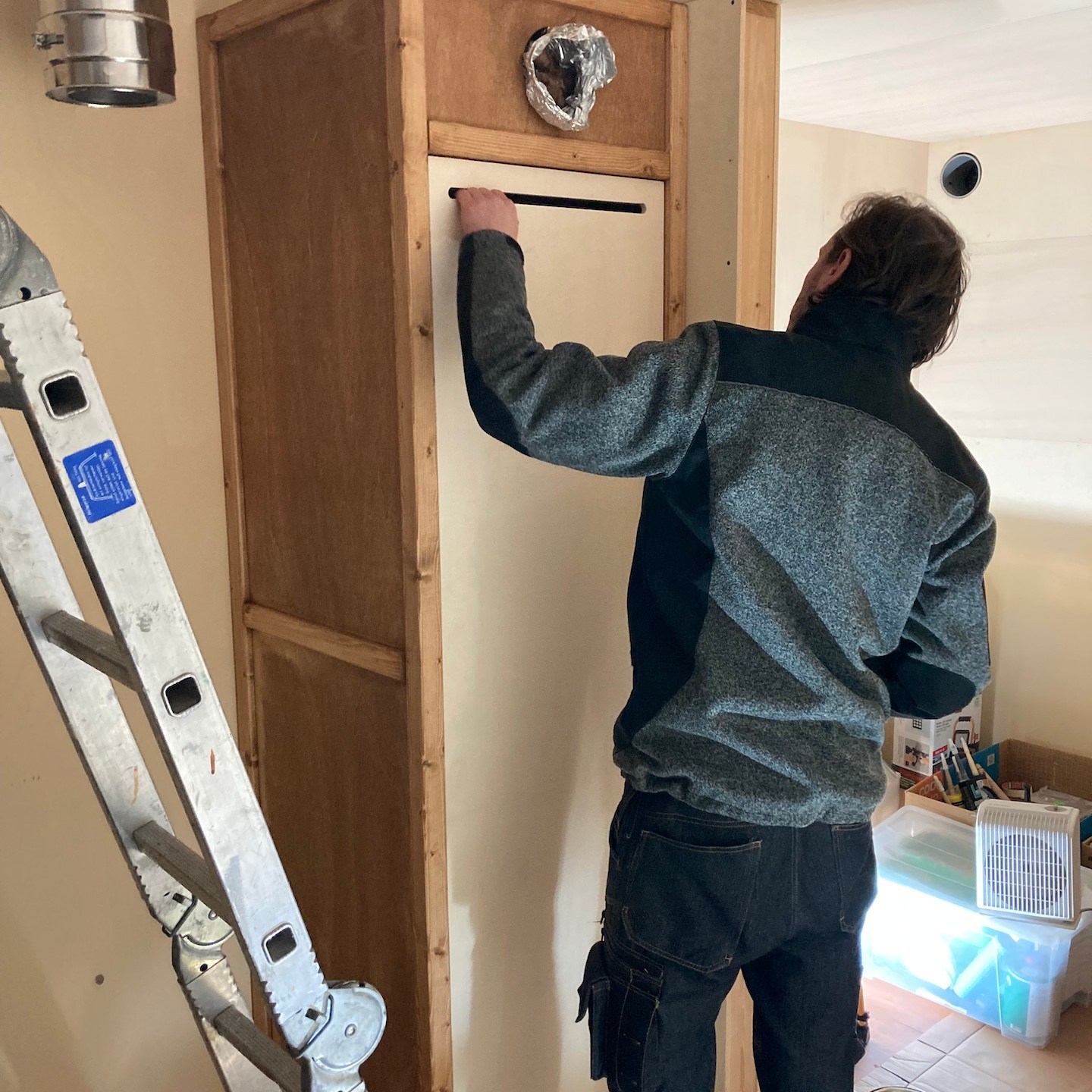 Naast Pats bouwsels heb ik mij daarnaast, met hier en daar hulp van hem en Ray, in mijn huisje vooral gefocust op het verder ontwerpen en uitwerken van mijn totale s(oms tot in de kleinste details) maatwerk keuken, waarbij de sparing voor de wasbak in het bamboe keukenblad ten eerste vooral door Rays combinatie van clowneske capriolen en wizard-achtige inzichten goed uit de verf (en uiteindelijk Osmo Topoil olie:p) is gekomen:) (we lijken overigens weer best wel veel op elkaar als we zo op de grond zitten hè, haha:)), het schoenenrekje in de zijkant helemaal naar tevredenheid is gelukt:), de spatschermen wat extra aandacht (zowel voor het strijken (ja je leest het goed: strijken met een strijkijzer) van de kromgetrokken platen als het bevestigen ervan met een groot aantal spijkertjes(a)) vergden dan dat ik had verwacht en tot slot het afzuigkapmeubel met behulp weer van wat Tetris-achtige ‘moves’ uit het verleden en mede door de nog steeds oohw zo fijne Dynaplus schroeven lekker stevig op zijn plek hangt:). Ook dit wordt vervolgd en ook deze onderdelen kunnen er overigens altijd weer uit mocht dat nodig zijn voor het verplaatsen. De lijn van modulair bouwen wordt dus nog altijd zoveel als mogelijk is voortgezet;).