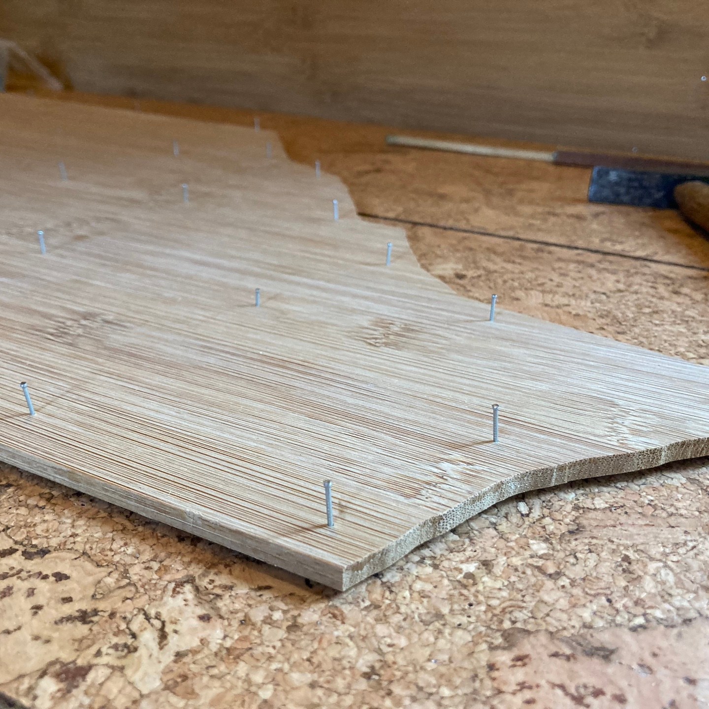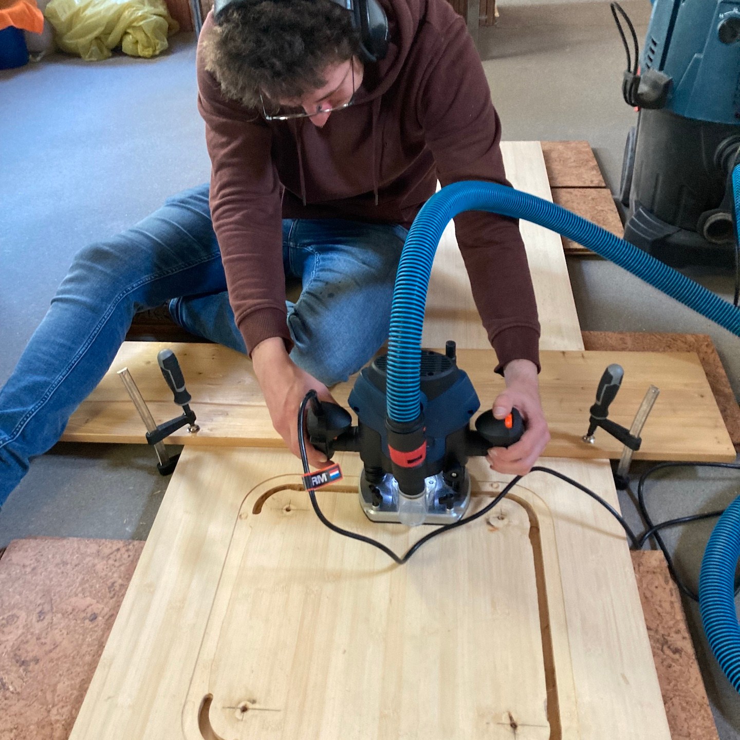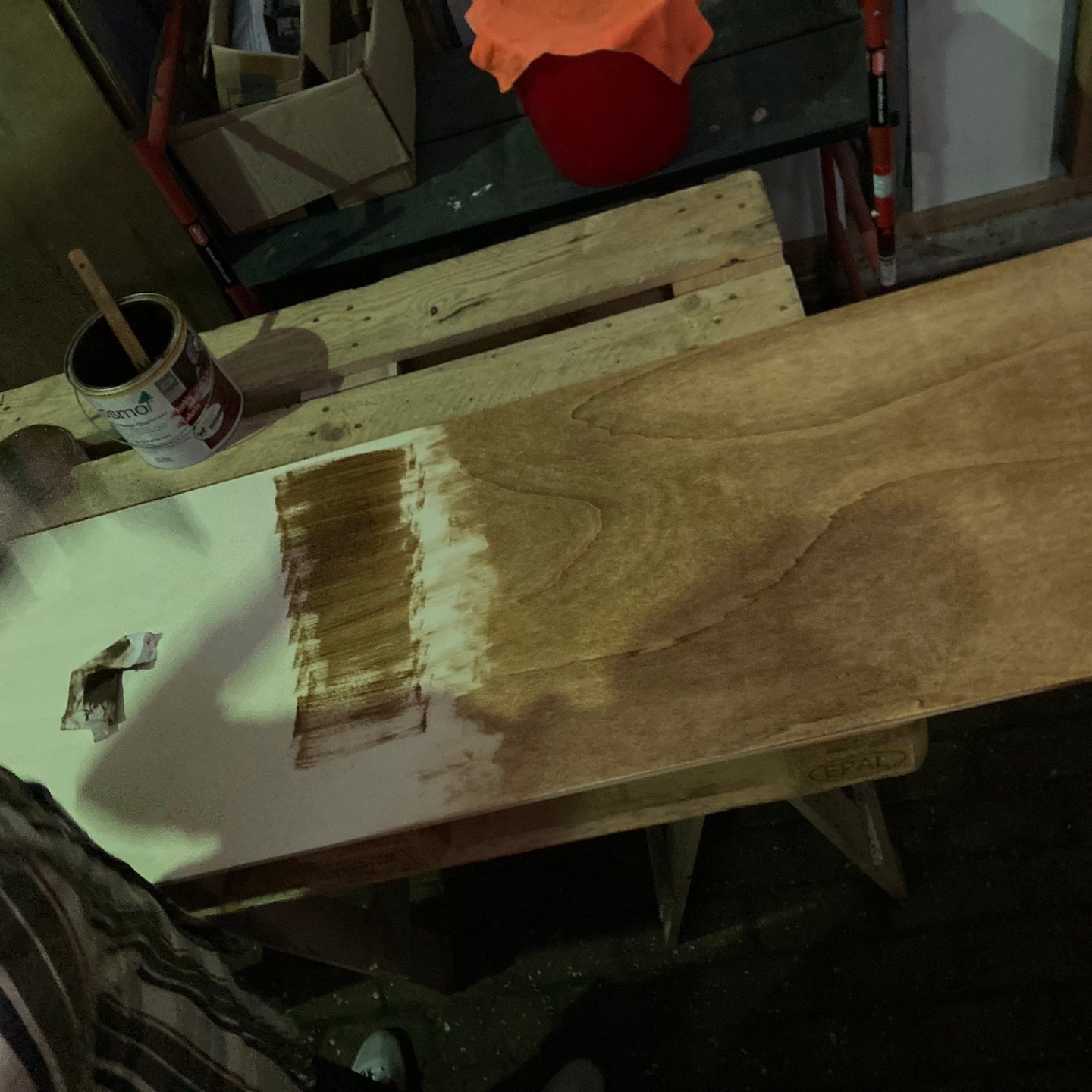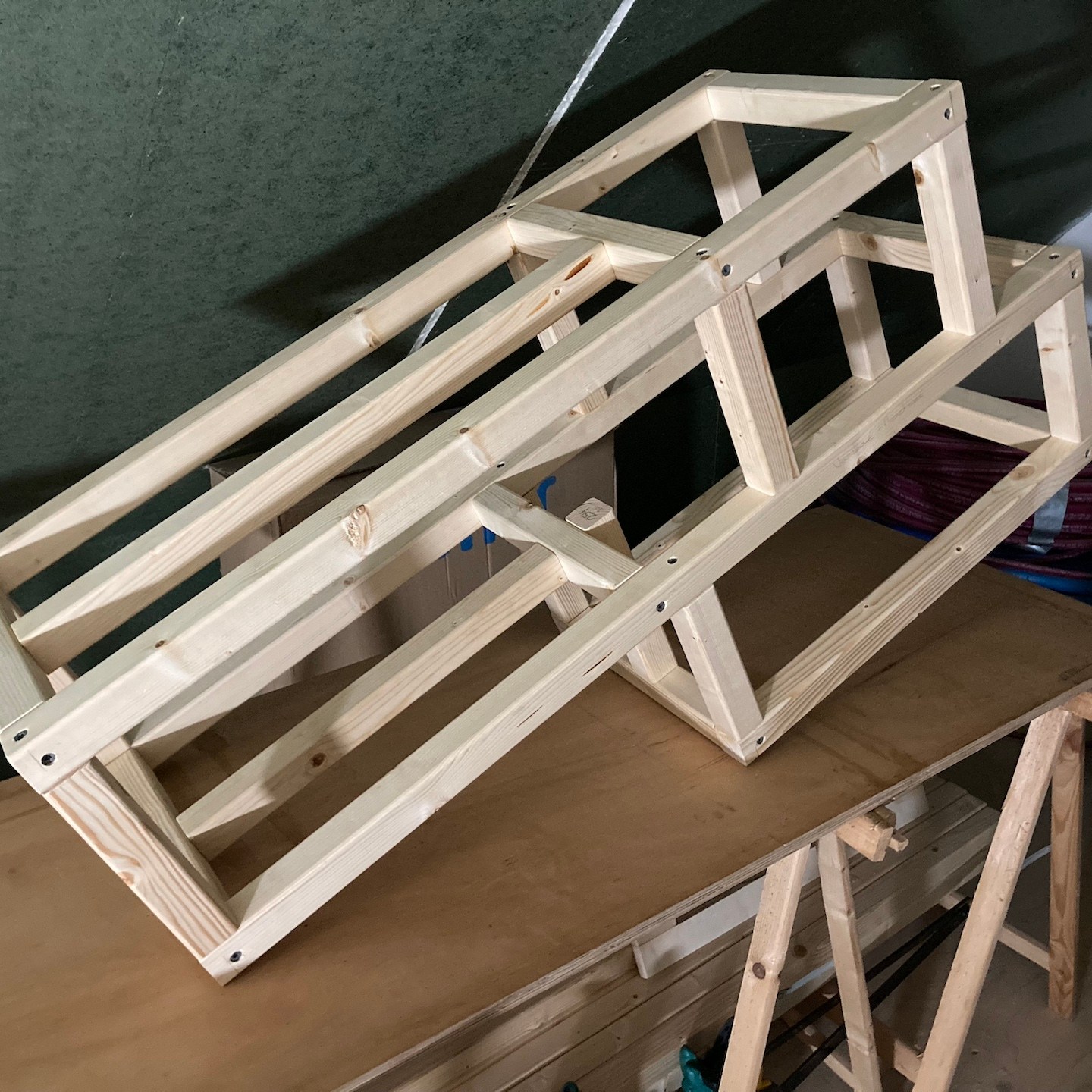Naast Pats bouwsels heb ik mij daarnaast, met hier en daar hulp van hem en Ray, in mijn huisje vooral gefocust op het verder ontwerpen en uitwerken van mijn totale s(oms tot in de kleinste details) maatwerk keuken, waarbij de sparing voor de wasbak in het bamboe keukenblad ten eerste vooral door Rays combinatie van clowneske capriolen en wizard-achtige inzichten goed uit de verf (en uiteindelijk Osmo Topoil olie:p) is gekomen:) (we lijken overigens weer best wel veel op elkaar als we zo op de grond zitten hè, haha:)), het schoenenrekje in de zijkant helemaal naar tevredenheid is gelukt:), de spatschermen wat extra aandacht (zowel voor het strijken (ja je leest het goed: strijken met een strijkijzer) van de kromgetrokken platen als het bevestigen ervan met een groot aantal spijkertjes(a)) vergden dan dat ik had verwacht en tot slot het afzuigkapmeubel met behulp weer van wat Tetris-achtige ‘moves’ uit het verleden en mede door de nog steeds oohw zo fijne Dynaplus schroeven lekker stevig op zijn plek hangt:). Ook dit wordt vervolgd en ook deze onderdelen kunnen er overigens altijd weer uit mocht dat nodig zijn voor het verplaatsen. De lijn van modulair bouwen wordt dus nog altijd zoveel als mogelijk is voortgezet;).