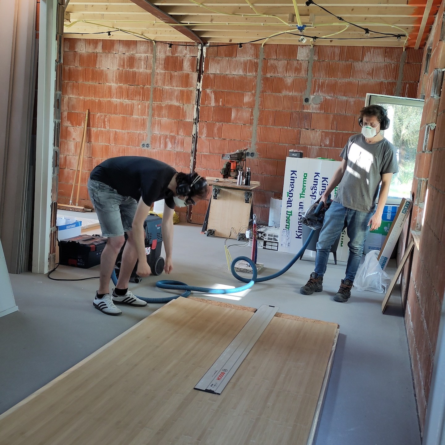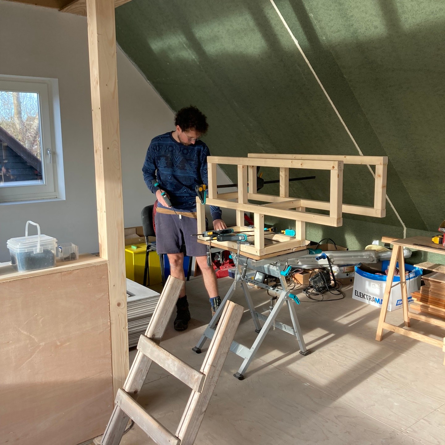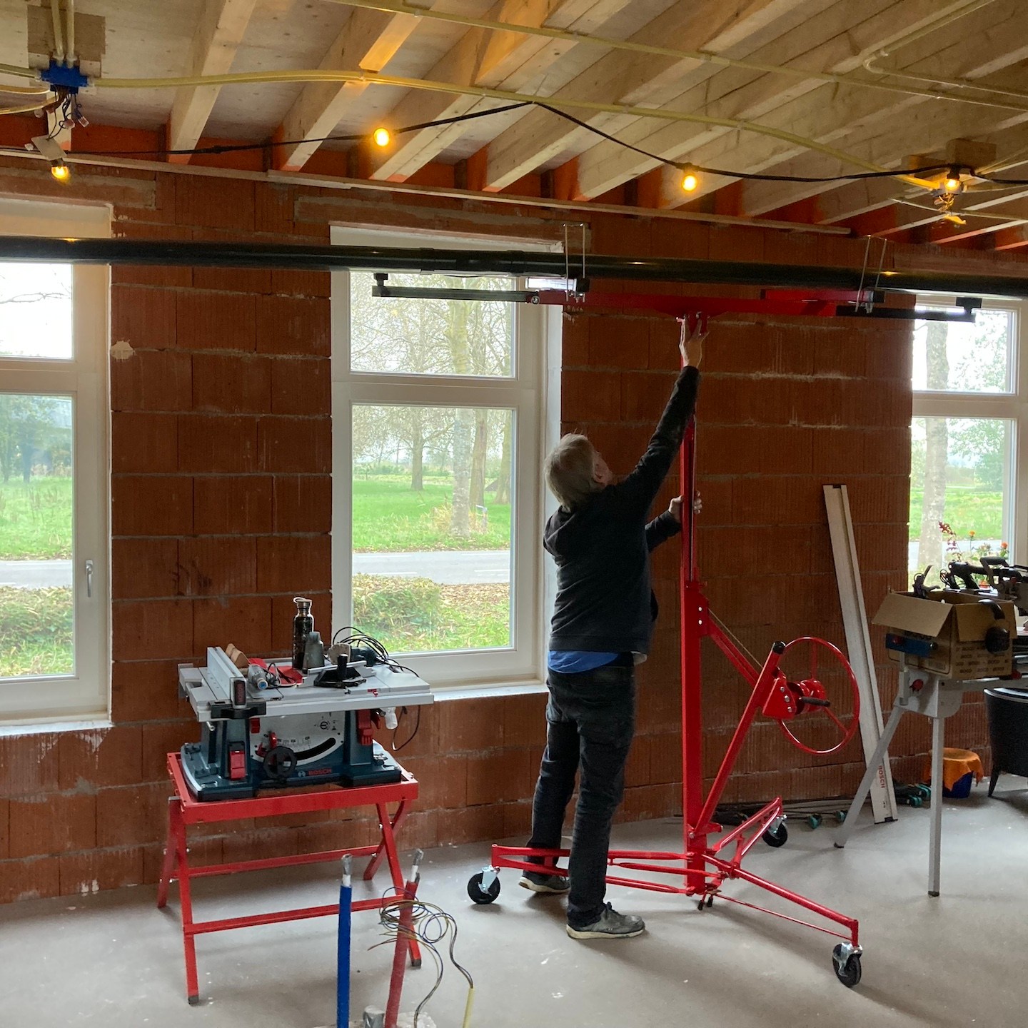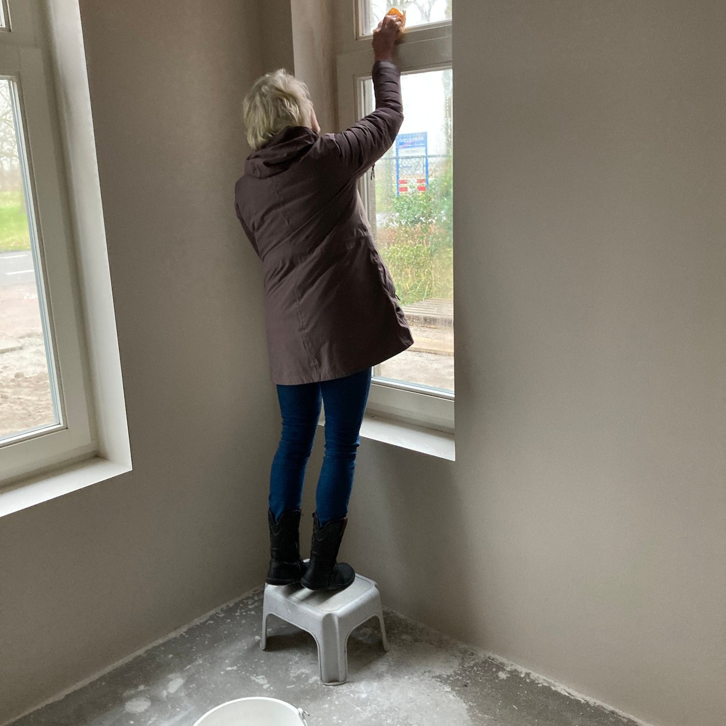 Bij het huis van mampap zijn tot slot ook nog een hoop stappen gezet;). Zo zit daar allereerst bijna al het (voorbereidende) kanaal-, elektra- en leidingwerk in de vloeren, muren en plafonds verwerkt, zijn verder bijna alle muren en plafonds voorzien van (afgewerkte) gipsplaten en/of stucwerk (dankjewel ook Bertus van Afwerkingsbedrijf Siereveld voor het op de korte termijn kunnen leveren van zeer mooi stucwerk, het meedenken met alles en de gezelligheid:), en ja, óók het wijzen op het aandraaien van de schroefjes, pfff dat waren een hele hoop schroefjes in de gipsplaten nalopen en aandraaien, haha:p), is de technische ruimte daarnaast steeds meer vorm en functie aan het krijgen en zijn tot slot allerlei materialen zoals de vloertegels en de keuken onderhand ook besteld:). En dat allemaal met ondersteuning ook van Supermams, die zoals je ziet net zo makkelijk achter de zaagtafel staat (en meedoet met allerlei kluswerkzaamheden die we helaas niet op foto hebben) als dat ze ramen zeemt (iets wat ze niet met veel plezier doet en hier noodgedwongen (er zit altijd een hoop vocht in huizen met beton- en stucwerk en dat moet er op de één of andere manier uit voordat je verder kunt – dankjewel ook hier weer aannemersbedrijf Roggeband voor het mogen lenen van de bouwdroger:)) in één week soms al vaker deed dan dat wij in een paar jaar in het vorige huis in Moordrecht deden, haha(a)). Ook hier niet getreurd, want ook hier moet nog een hoop gebeuren en wordt het allemaal op ten duur ook gewoon vervolgd (inclusief het ramen zemen;)), haha:p.