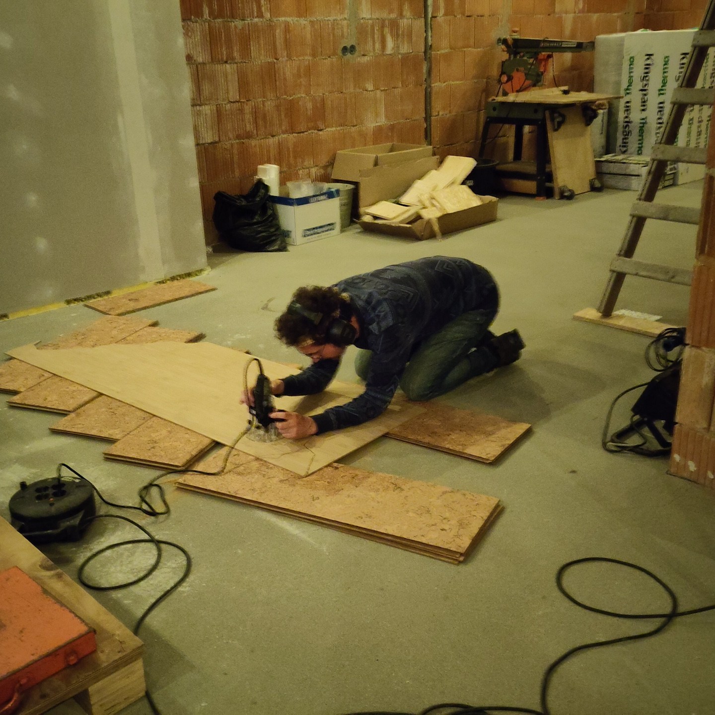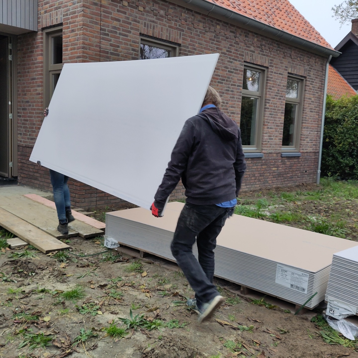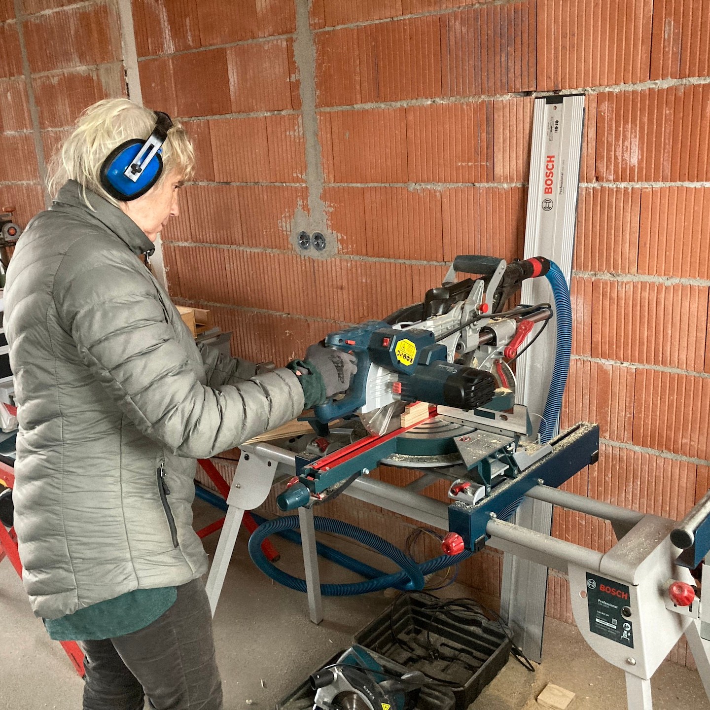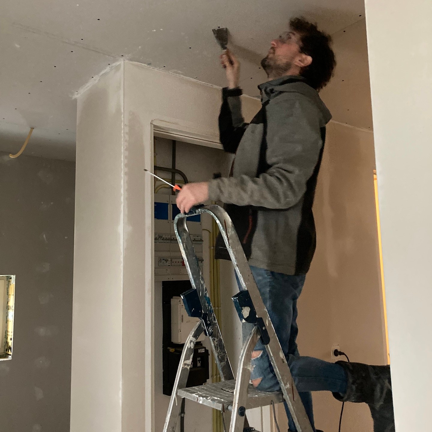 Bij het huis van mampap zijn tot slot ook nog een hoop stappen gezet;). Zo zit daar allereerst bijna al het (voorbereidende) kanaal-, elektra- en leidingwerk in de vloeren, muren en plafonds verwerkt, zijn verder bijna alle muren en plafonds voorzien van (afgewerkte) gipsplaten en/of stucwerk (dankjewel ook Bertus van Afwerkingsbedrijf Siereveld voor het op de korte termijn kunnen leveren van zeer mooi stucwerk, het meedenken met alles en de gezelligheid:), en ja, óók het wijzen op het aandraaien van de schroefjes, pfff dat waren een hele hoop schroefjes in de gipsplaten nalopen en aandraaien, haha:p), is de technische ruimte daarnaast steeds meer vorm en functie aan het krijgen en zijn tot slot allerlei materialen zoals de vloertegels en de keuken onderhand ook besteld:). En dat allemaal met ondersteuning ook van Supermams, die zoals je ziet net zo makkelijk achter de zaagtafel staat (en meedoet met allerlei kluswerkzaamheden die we helaas niet op foto hebben) als dat ze ramen zeemt (iets wat ze niet met veel plezier doet en hier noodgedwongen (er zit altijd een hoop vocht in huizen met beton- en stucwerk en dat moet er op de één of andere manier uit voordat je verder kunt – dankjewel ook hier weer aannemersbedrijf Roggeband voor het mogen lenen van de bouwdroger:)) in één week soms al vaker deed dan dat wij in een paar jaar in het vorige huis in Moordrecht deden, haha(a)). Ook hier niet getreurd, want ook hier moet nog een hoop gebeuren en wordt het allemaal op ten duur ook gewoon vervolgd (inclusief het ramen zemen;)), haha:p.