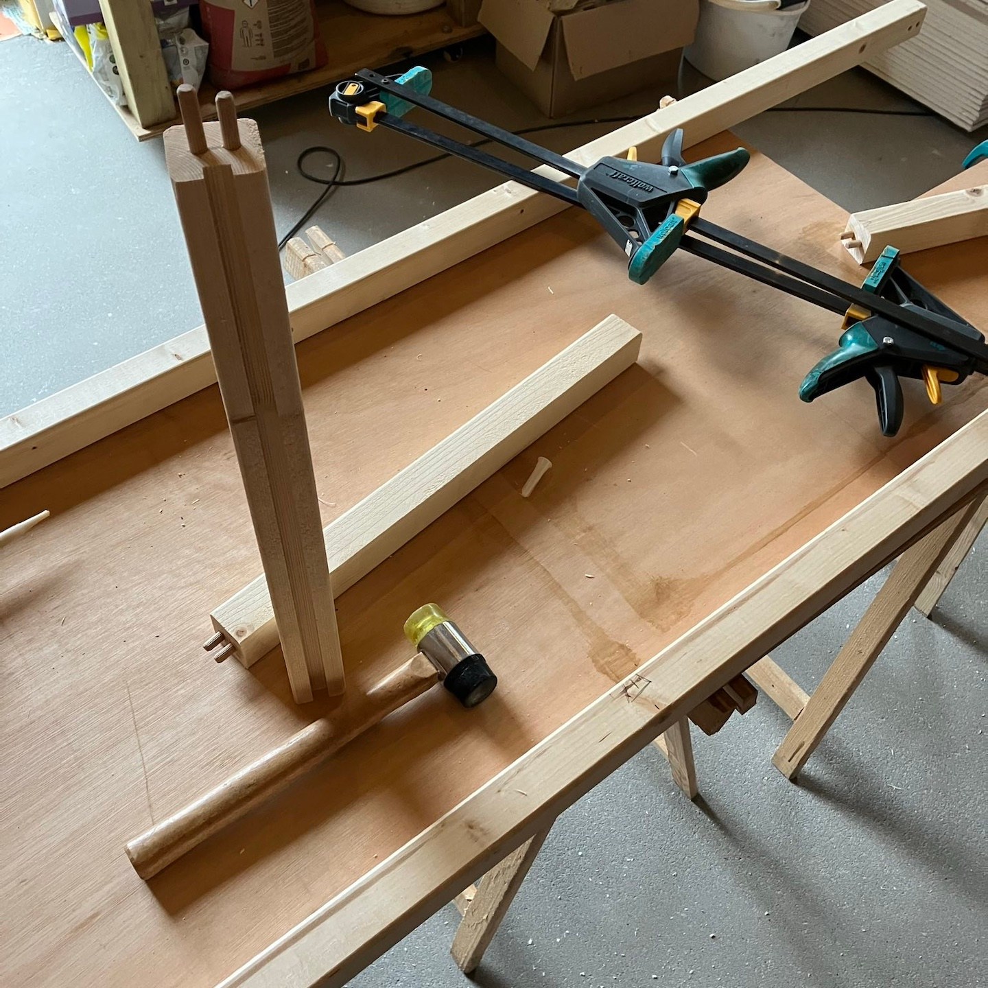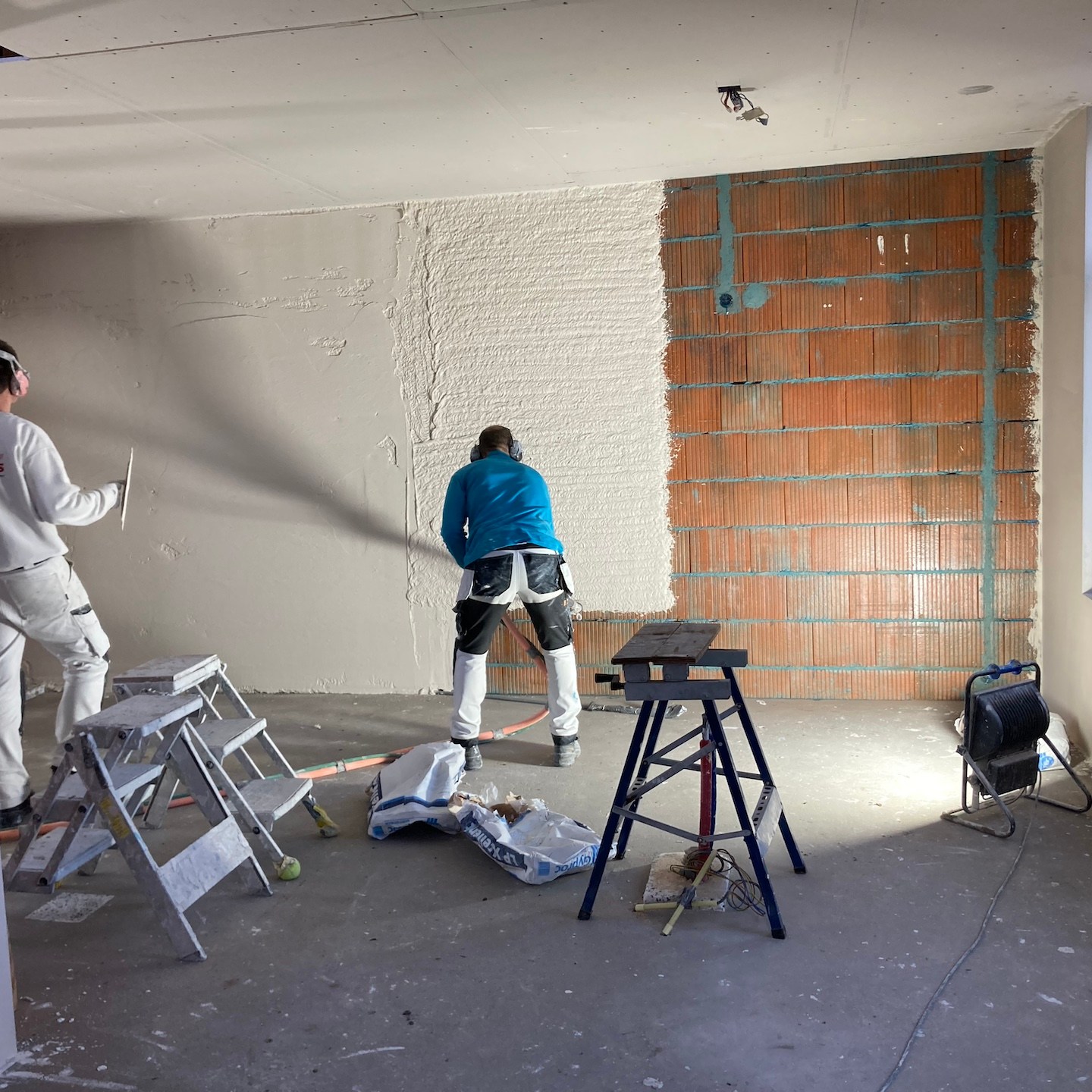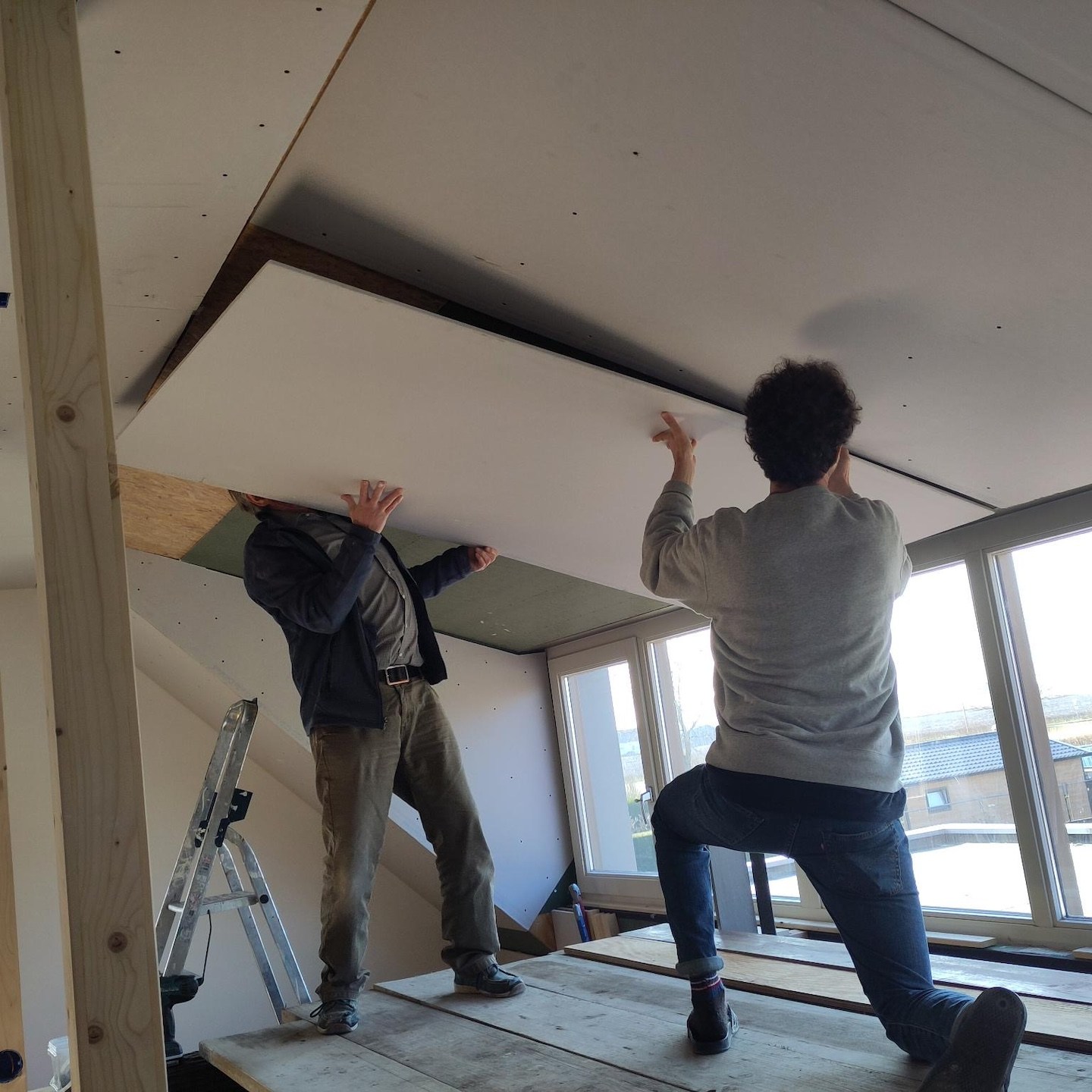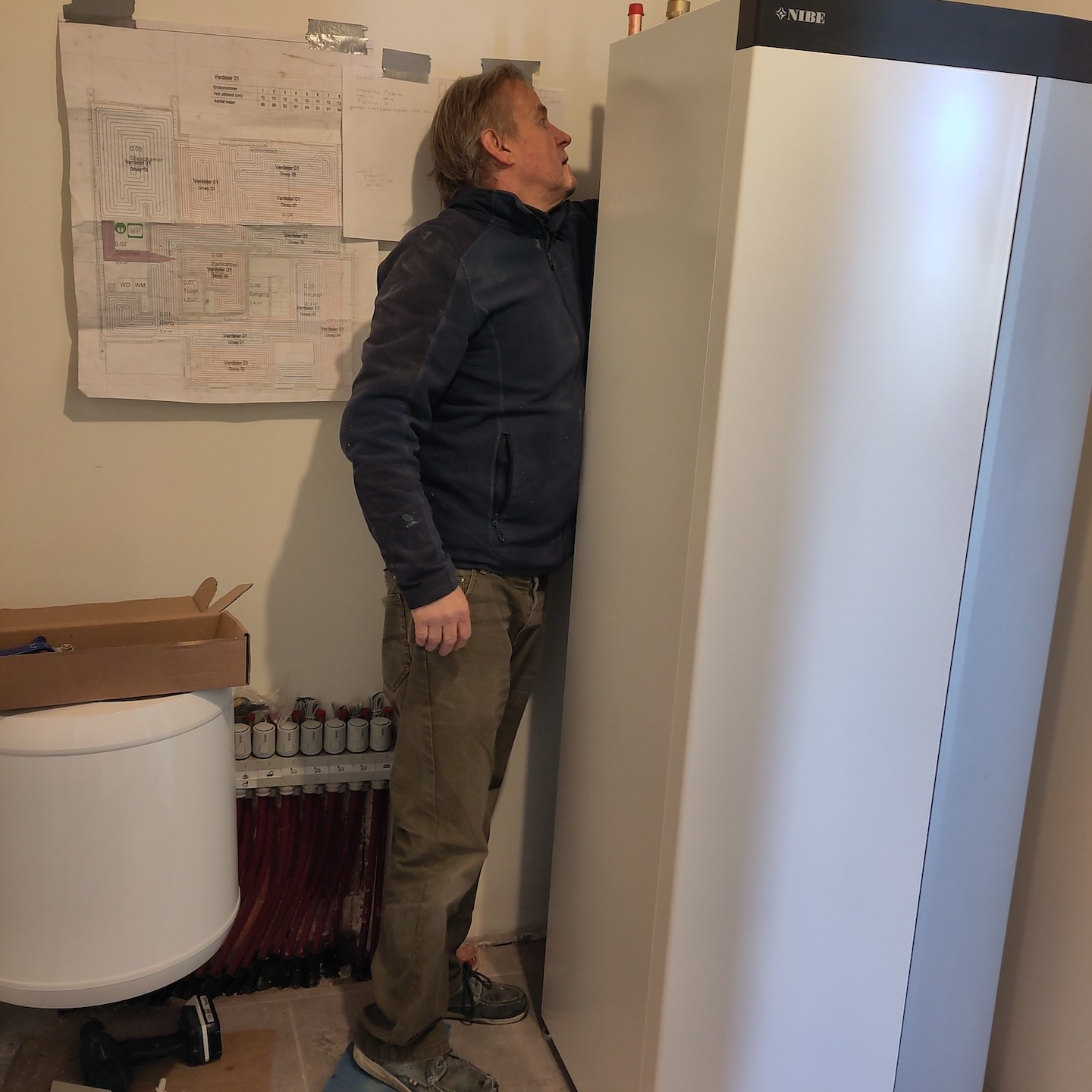 Bij het huis van mampap zijn tot slot ook nog een hoop stappen gezet;). Zo zit daar allereerst bijna al het (voorbereidende) kanaal-, elektra- en leidingwerk in de vloeren, muren en plafonds verwerkt, zijn verder bijna alle muren en plafonds voorzien van (afgewerkte) gipsplaten en/of stucwerk (dankjewel ook Bertus van Afwerkingsbedrijf Siereveld voor het op de korte termijn kunnen leveren van zeer mooi stucwerk, het meedenken met alles en de gezelligheid:), en ja, óók het wijzen op het aandraaien van de schroefjes, pfff dat waren een hele hoop schroefjes in de gipsplaten nalopen en aandraaien, haha:p), is de technische ruimte daarnaast steeds meer vorm en functie aan het krijgen en zijn tot slot allerlei materialen zoals de vloertegels en de keuken onderhand ook besteld:). En dat allemaal met ondersteuning ook van Supermams, die zoals je ziet net zo makkelijk achter de zaagtafel staat (en meedoet met allerlei kluswerkzaamheden die we helaas niet op foto hebben) als dat ze ramen zeemt (iets wat ze niet met veel plezier doet en hier noodgedwongen (er zit altijd een hoop vocht in huizen met beton- en stucwerk en dat moet er op de één of andere manier uit voordat je verder kunt – dankjewel ook hier weer aannemersbedrijf Roggeband voor het mogen lenen van de bouwdroger:)) in één week soms al vaker deed dan dat wij in een paar jaar in het vorige huis in Moordrecht deden, haha(a)). Ook hier niet getreurd, want ook hier moet nog een hoop gebeuren en wordt het allemaal op ten duur ook gewoon vervolgd (inclusief het ramen zemen;)), haha:p.